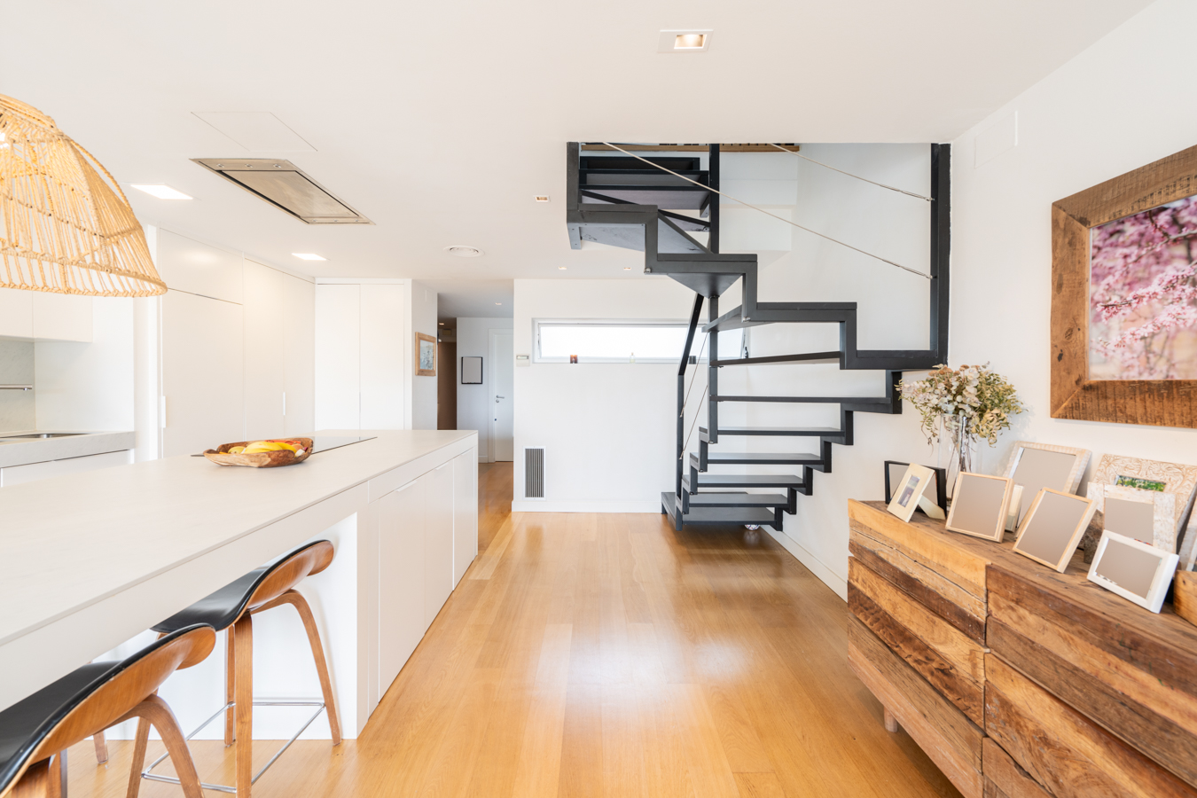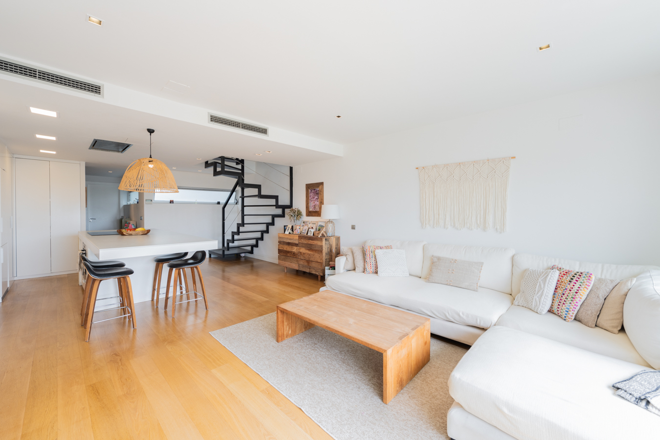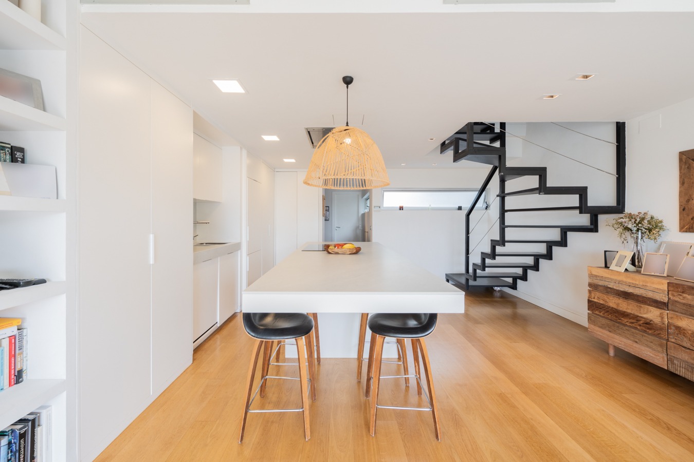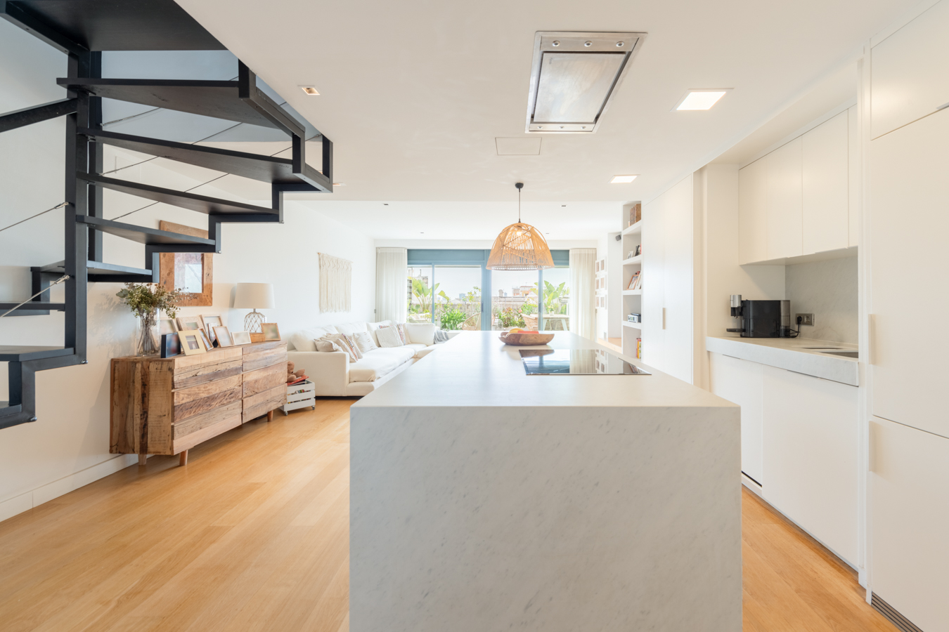 Le premier étage est la partie jour. Il dispose d’un spectaculaire salon-salle à manger avec cuisine ouverte et îlot central. Il donne accès à une terrasse de 18 m2 orientée au sud, ce qui rend la zone de jour très lumineuse. Cet étage comprend également des toilettes pour les invités.
