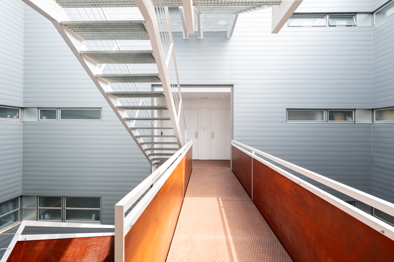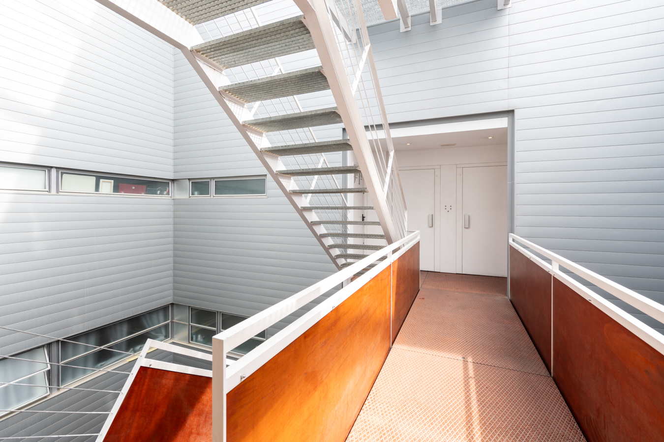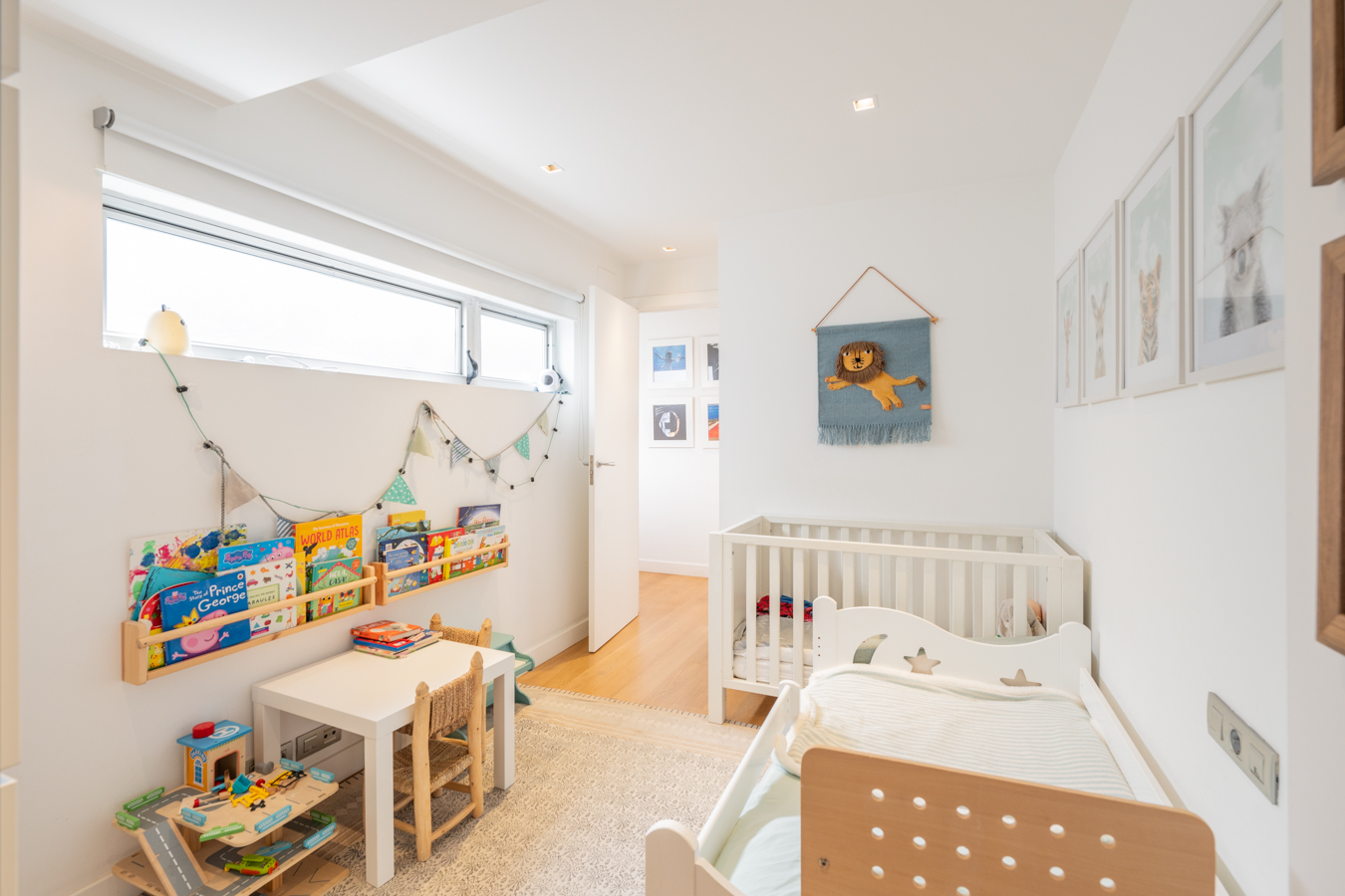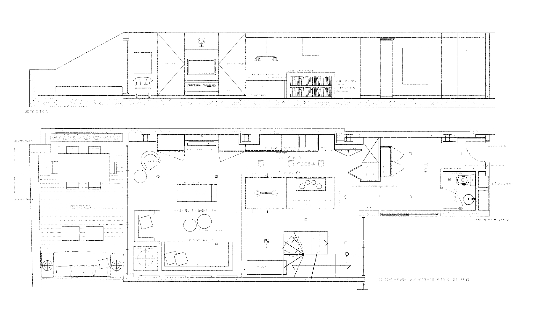 Le premier étage est la partie jour. Il dispose d’un spectaculaire salon-salle à manger avec cuisine ouverte et îlot central. Il donne accès à une terrasse de 18 m2 orientée au sud, ce qui rend la zone de jour très lumineuse. Cet étage comprend également des toilettes pour les invités.