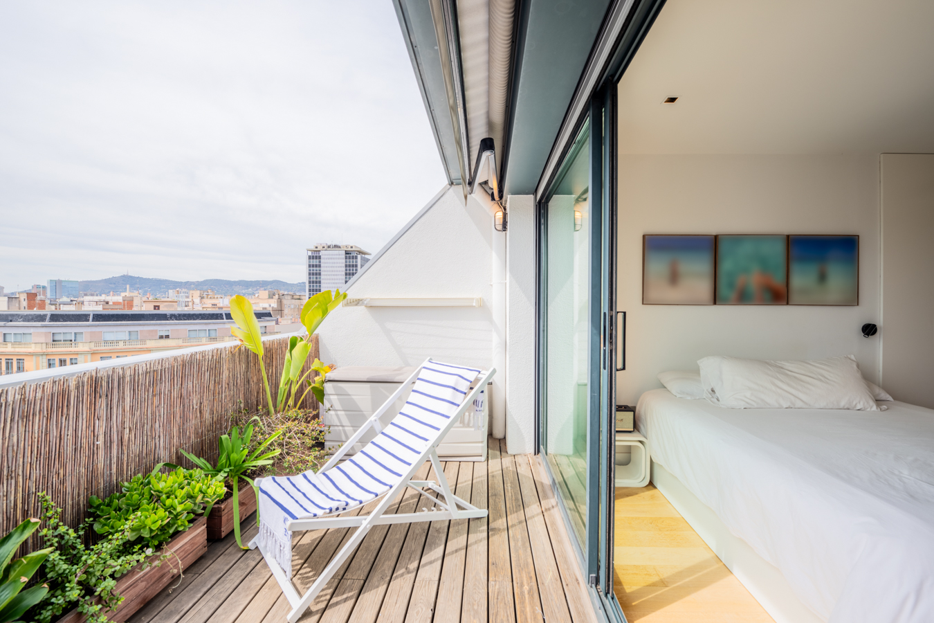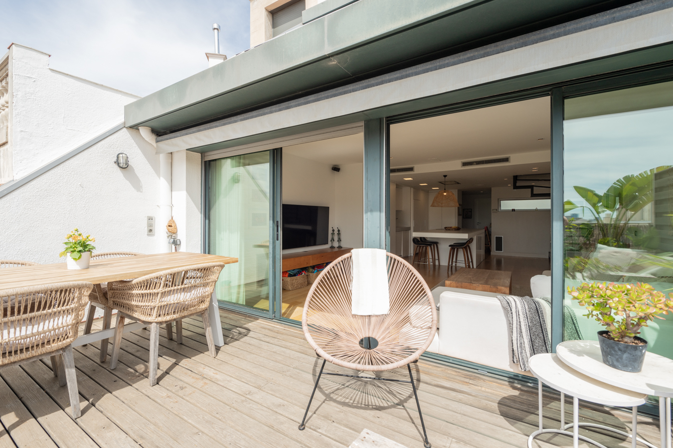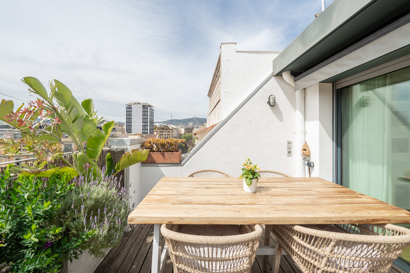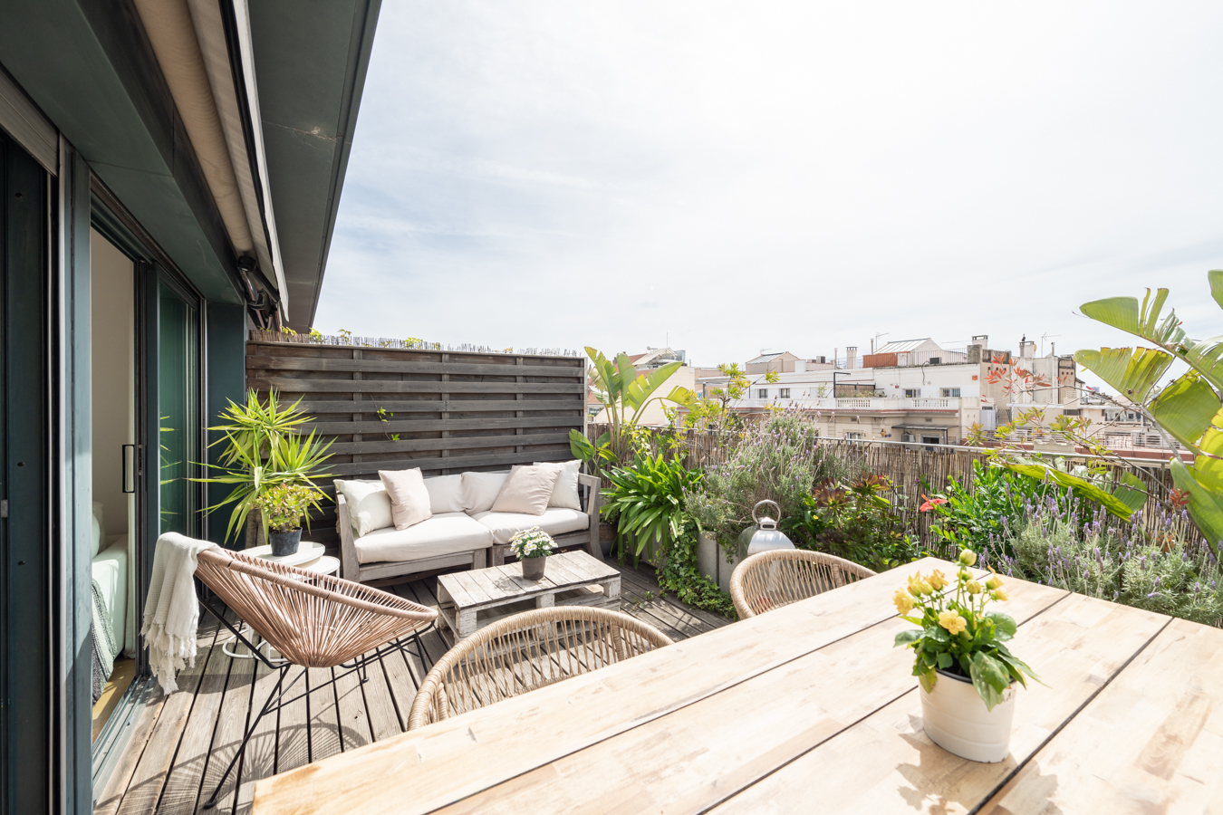 Cet appartement-terrasse exclusif dispose d'une licence touristique et offre un excellent rendement. Il dispose d'une superficie intérieure de 89,87 m² et d'une superbe terrasse de 93,43 m² au pied du salon. C'est un bien immobilier exceptionnel en raison de ses caractéristiques et de son excellent emplacement au cœur de Barcelone, à seulement deux rues de la Plaza Catalunya, du Paseo de Gracia et de La Rambla. Rénové il y a quelques années avec des matériaux et des finitions de la plus haute qualité, il offre tout le nécessaire pour vivre dans un confort maximal. Il s'agit d'une occasion unique de vivre dans une oasis de luxe avec accès à toutes les commodités de la grande ville ou comme investissement. En 2024, le chiffre d'affaires net après frais s'élevait à environ 120 000 €, soit un rendement supérieur à 8 %. Le salon-salle à manger est spacieux et très lumineux, car il est entièrement vitré. Il dispose d'un accès direct à la terrasse, avec une excellente orientation sud pour profiter du soleil toute la journée et de vues incroyables sur toute la ville. C'est l'endroit idéal pour prendre le soleil, faire des réunions agréables, déjeuner, dîner, se détendre en plein air... Il dispose d'un sol en bois tropical, d'un jardin design, d'un éclairage LED, d'une douche à eau chaude et d'une pièce de rangement de 1,5 m2. En retournant à l'intérieur, la salle à manger nous mène à une merveilleuse cuisine avec îlot central. Il est entièrement équipé d'appareils électroménagers Siemens et d'une cuisine Siematic. A côté, il y a une salle de bain avec douche. À côté du salon, il y a des toilettes pour les invités et une buanderie. Les 2 chambres sont extérieures et lumineuses. La suite principale peut accueillir un lit king size et sa salle de bains est dotée d'une grande baignoire. L'autre chambre est une chambre double. La deuxième salle de bains se trouve à côté du salon et dispose d'une douche à l'italienne. Ce penthouse est le seul appartement situé au dernier étage de l'immeuble, ce qui garantit une grande tranquillité et une grande intimité. Elle est équipée de sols en bois et en microciment dans les chambres, la cuisine et les salles de bains, d'un chauffage central Saunier Duval avec radiateurs dans tout le bâtiment, d'une climatisation Daikin, d'une cheminée à gaz Dru, de stores électriques Markilux, de fenêtres Technal et de robinetterie Dornbracht. L'immeuble, un édifice typique de l'Eixample, dispose d'un ascenseur, d'un portier et de caméras de vidéosurveillance.