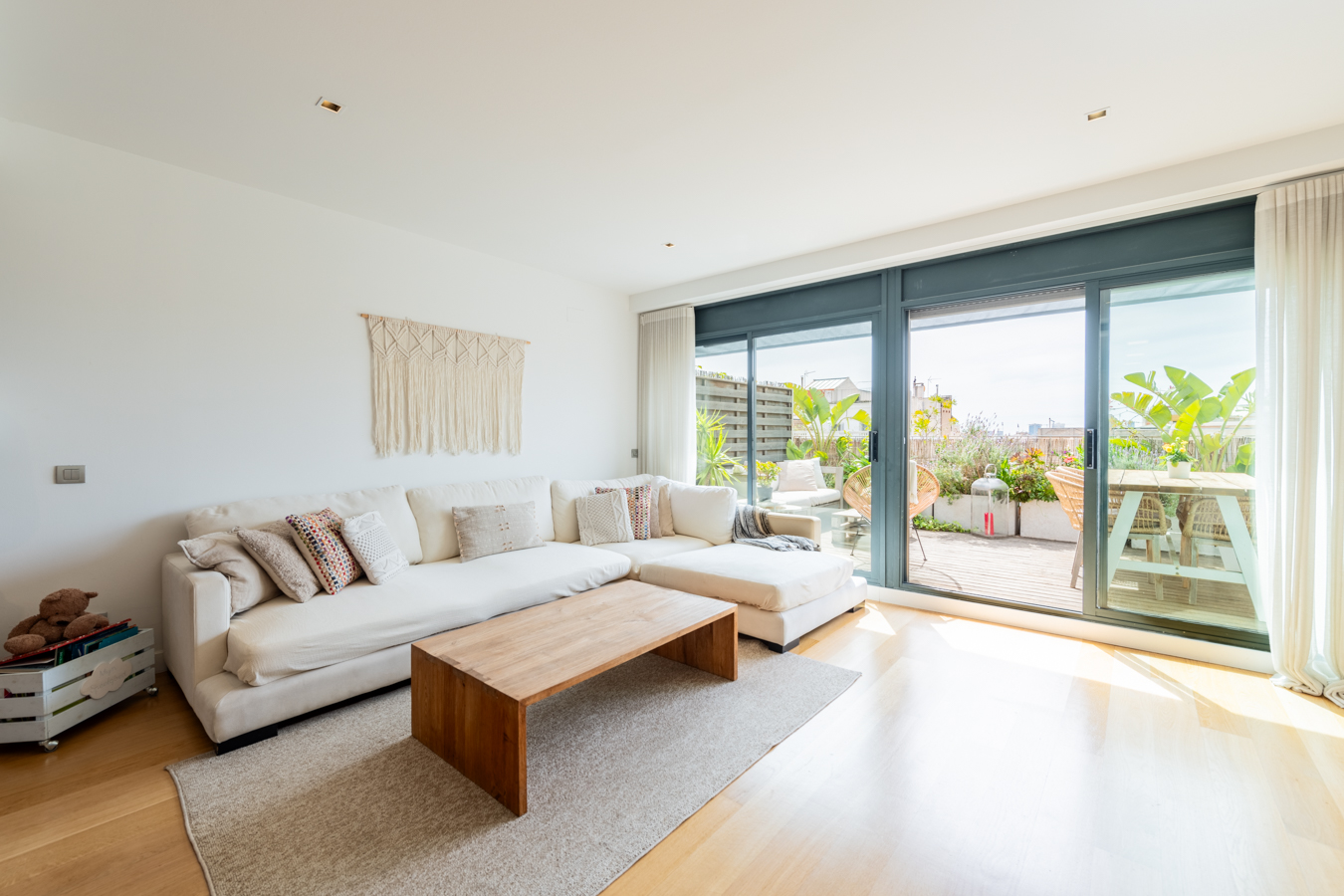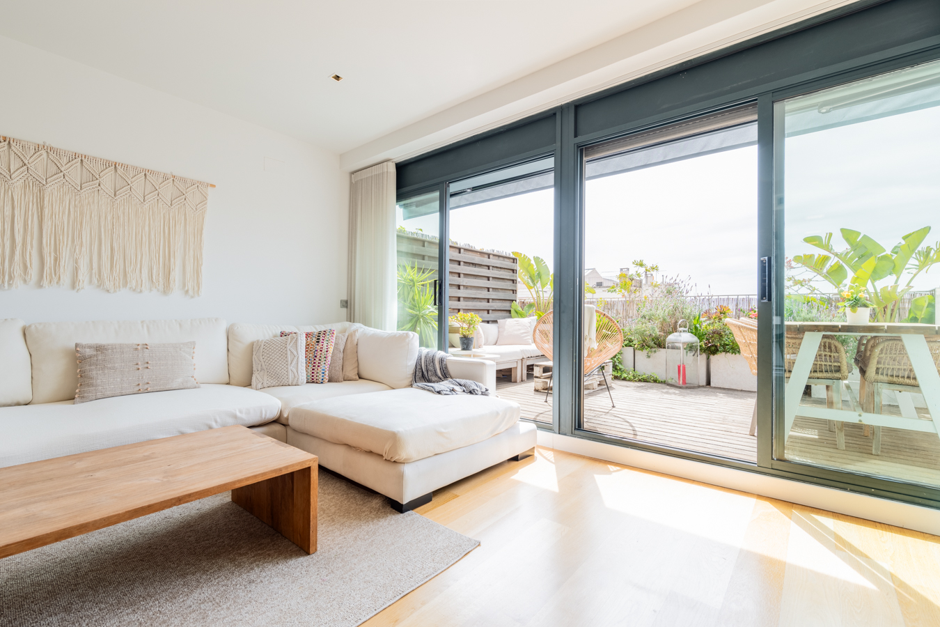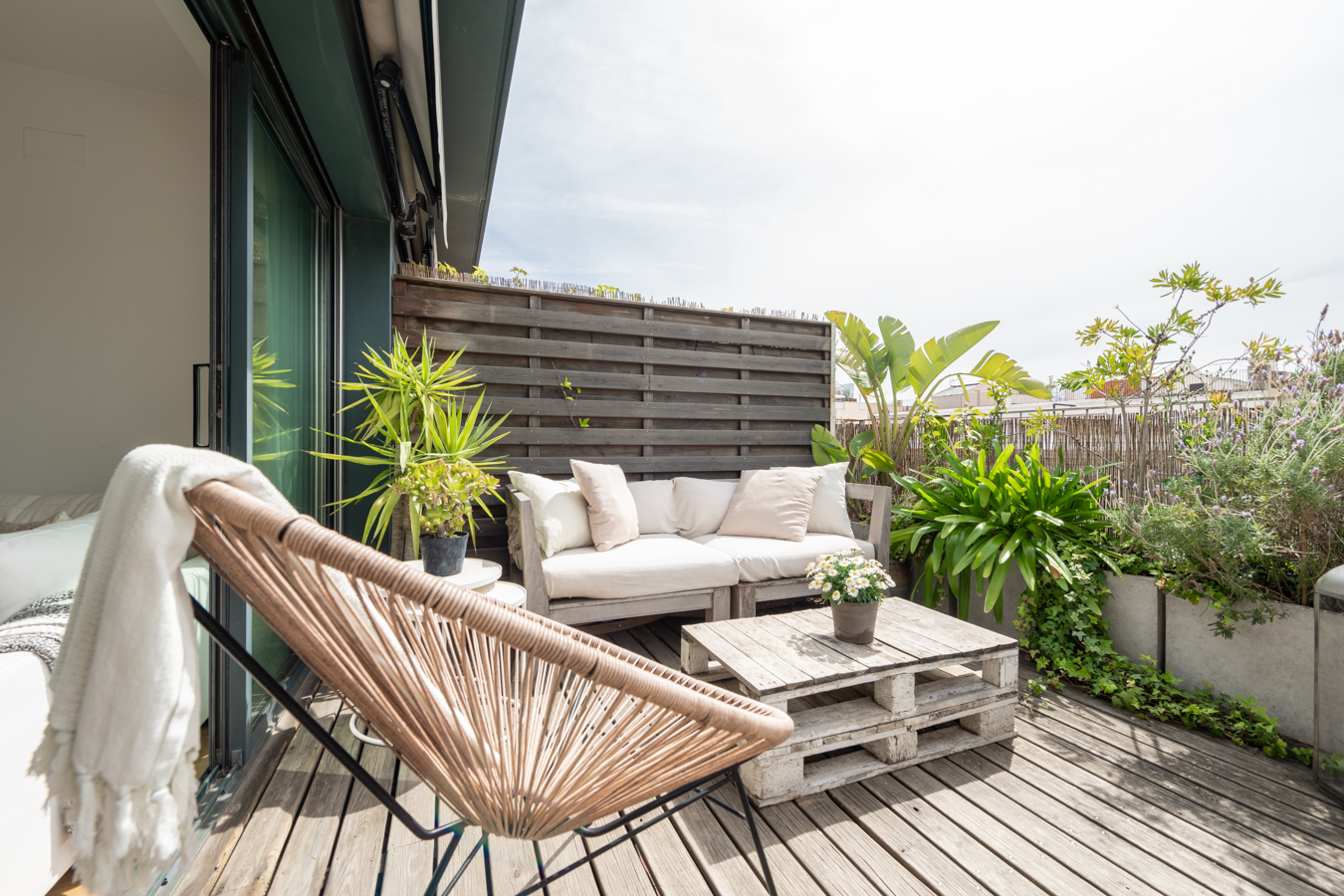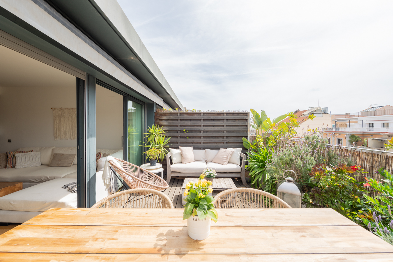 Cet appartement-terrasse exclusif dispose d'une licence touristique et offre un excellent rendement. Il dispose d'une superficie intérieure de 89,87 m² et d'une superbe terrasse de 93,43 m² au pied du salon. C'est un bien immobilier exceptionnel en raison de ses caractéristiques et de son excellent emplacement au cœur de Barcelone, à seulement deux rues de la Plaza Catalunya, du Paseo de Gracia et de La Rambla. Rénové il y a quelques années avec des matériaux et des finitions de la plus haute qualité, il offre tout le nécessaire pour vivre dans un confort maximal. Il s'agit d'une occasion unique de vivre dans une oasis de luxe avec accès à toutes les commodités de la grande ville ou comme investissement. En 2024, le chiffre d'affaires net après frais s'élevait à environ 120 000 €, soit un rendement supérieur à 8 %. Le salon-salle à manger est spacieux et très lumineux, car il est entièrement vitré. Il dispose d'un accès direct à la terrasse, avec une excellente orientation sud pour profiter du soleil toute la journée et de vues incroyables sur toute la ville. C'est l'endroit idéal pour prendre le soleil, faire des réunions agréables, déjeuner, dîner, se détendre en plein air... Il dispose d'un sol en bois tropical, d'un jardin design, d'un éclairage LED, d'une douche à eau chaude et d'une pièce de rangement de 1,5 m2. En retournant à l'intérieur, la salle à manger nous mène à une merveilleuse cuisine avec îlot central. Il est entièrement équipé d'appareils électroménagers Siemens et d'une cuisine Siematic. A côté, il y a une salle de bain avec douche. À côté du salon, il y a des toilettes pour les invités et une buanderie. Les 2 chambres sont extérieures et lumineuses. La suite principale peut accueillir un lit king size et sa salle de bains est dotée d'une grande baignoire. L'autre chambre est une chambre double. La deuxième salle de bains se trouve à côté du salon et dispose d'une douche à l'italienne. Ce penthouse est le seul appartement situé au dernier étage de l'immeuble, ce qui garantit une grande tranquillité et une grande intimité. Elle est équipée de sols en bois et en microciment dans les chambres, la cuisine et les salles de bains, d'un chauffage central Saunier Duval avec radiateurs dans tout le bâtiment, d'une climatisation Daikin, d'une cheminée à gaz Dru, de stores électriques Markilux, de fenêtres Technal et de robinetterie Dornbracht. L'immeuble, un édifice typique de l'Eixample, dispose d'un ascenseur, d'un portier et de caméras de vidéosurveillance.