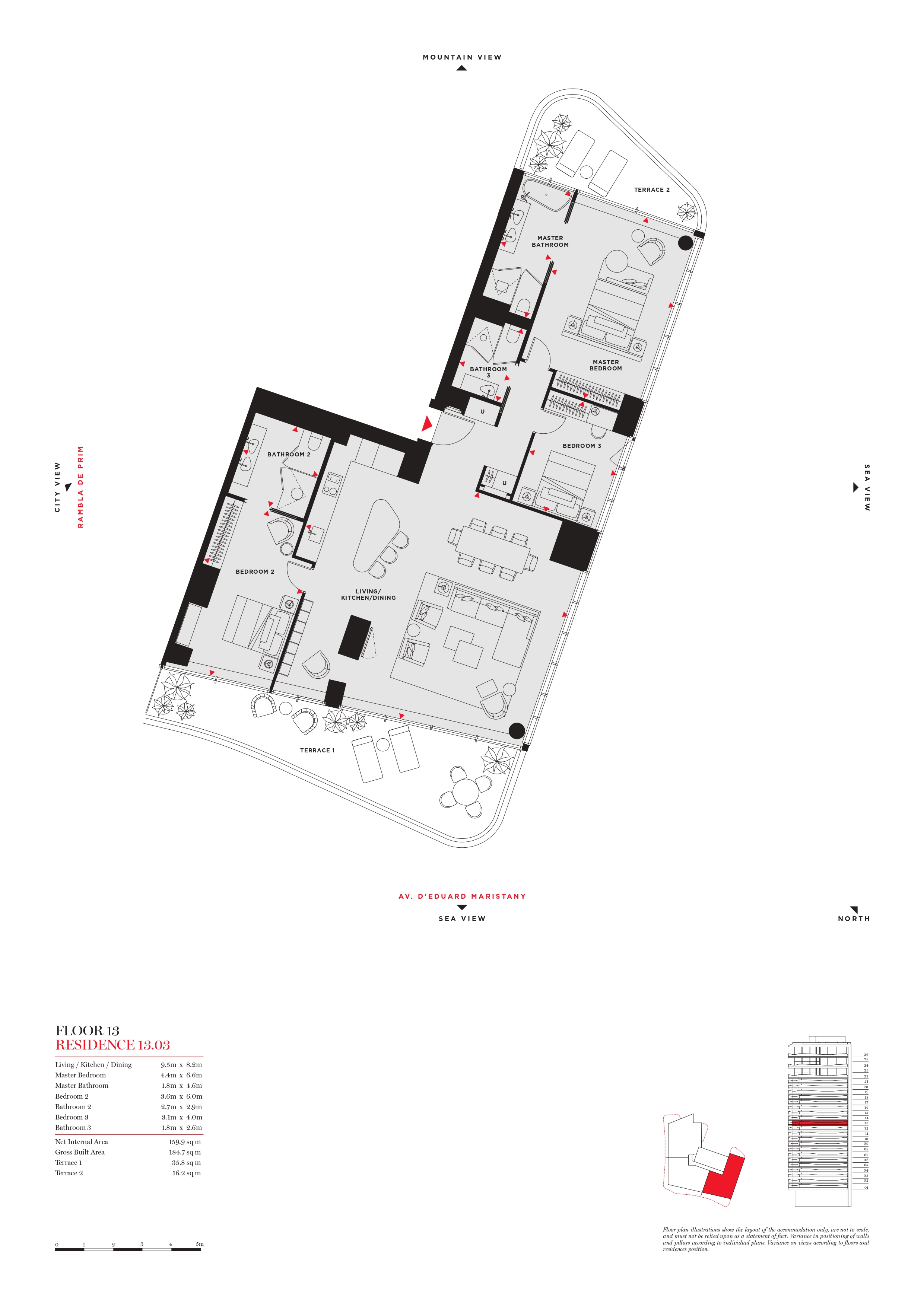 Cet appartement est situé au 13ème étage, il dispose de 184,7 m2 de surface intérieure construite et de 2 terrasses de 35,8 et 16,2 m2, qui sont l’endroit idéal pour se réunir, recevoir des invités ou se détendre tout en profitant du climat agréable de Barcelone tout au long de l’année.