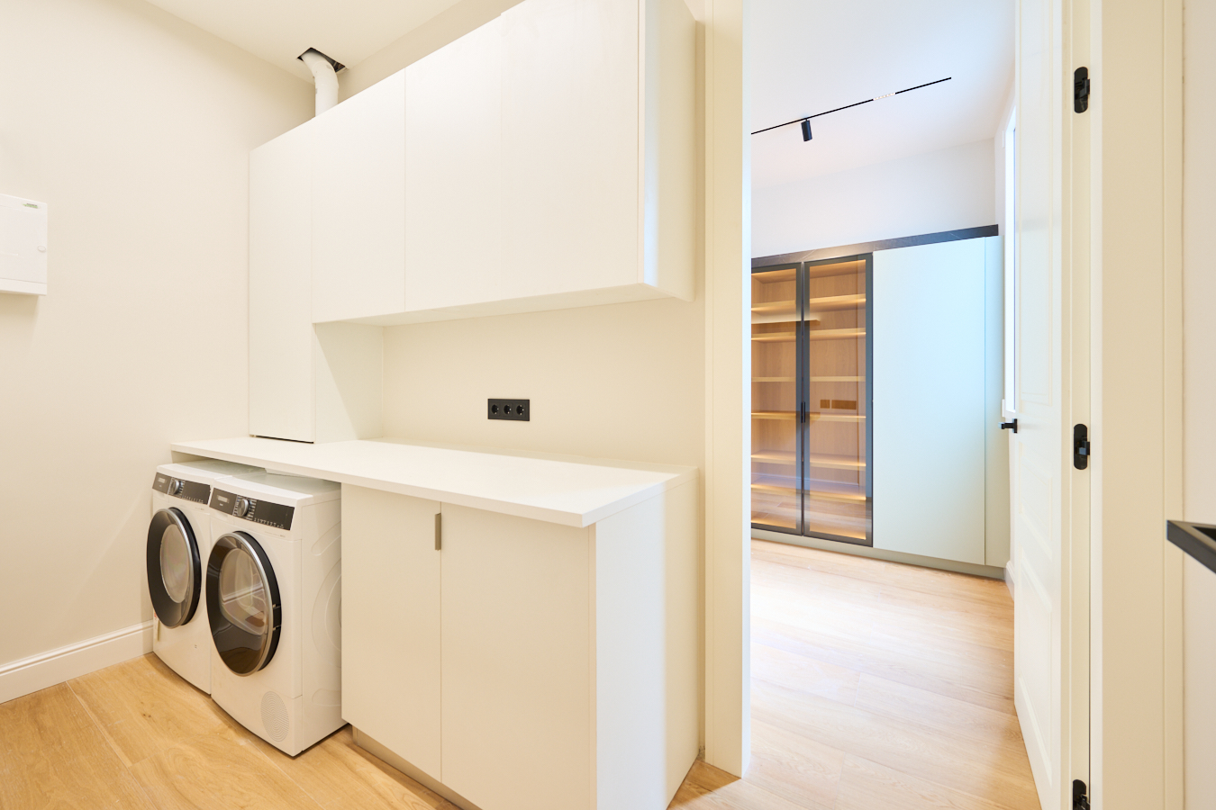 Un grand hall d’entrée distribue les espaces jour et nuit de part et d’autre. Le spectaculaire salon-salle à manger de 50 m2 est un espace vaste et lumineux, avec accès à 3 balcons donnant sur la rue. A côté, une pièce attenante peut être utilisée comme salon, salle de jeux, salle de télévision et de cinéma, etc. Le salon-salle à manger communique directement avec la cuisine ouverte de 20 m2, entièrement équipée d’appareils électroménagers. À côté de celle-ci se trouve une buanderie et une salle de repassage dans laquelle la buanderie peut être installée.