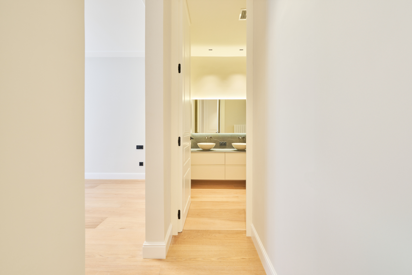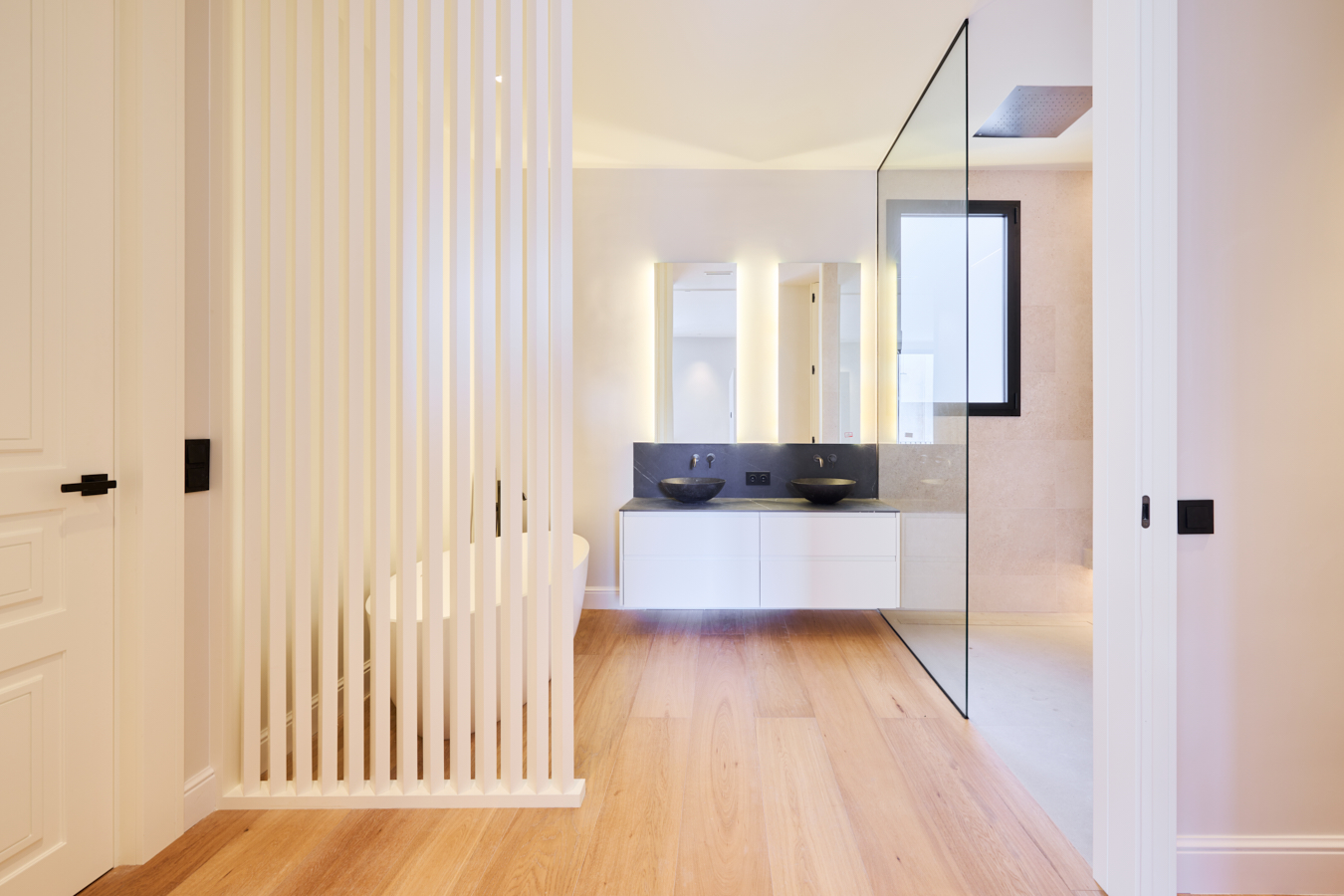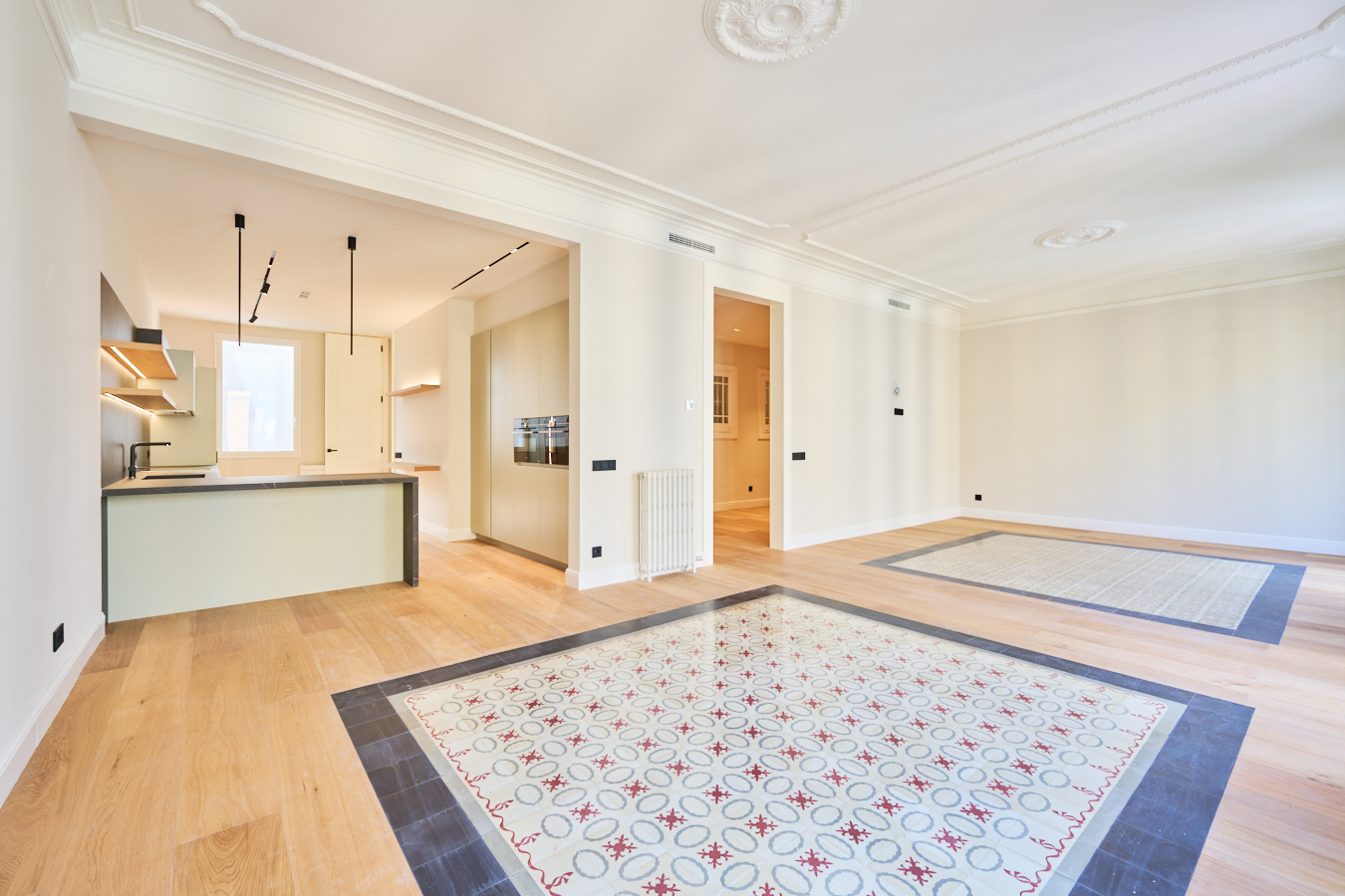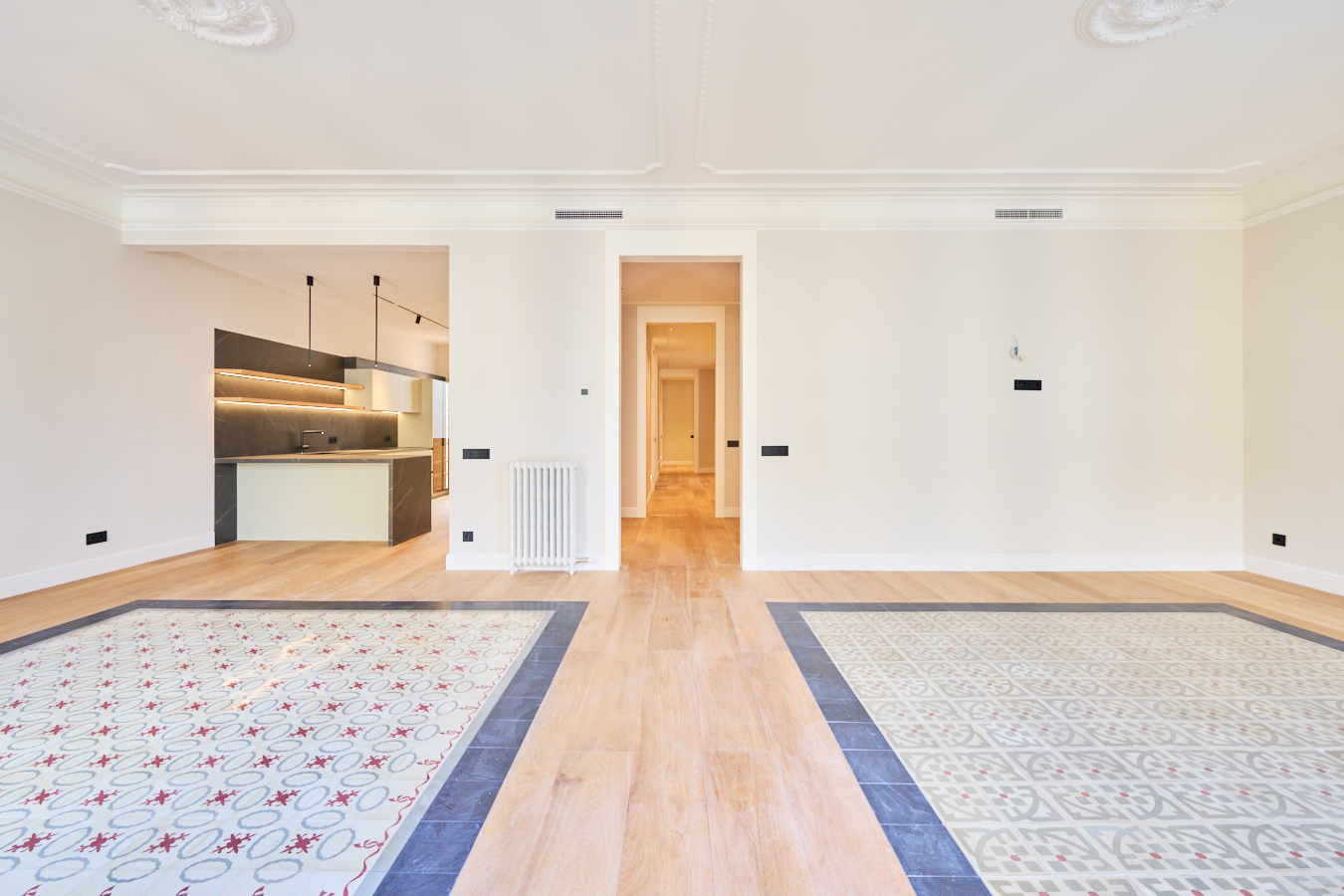 Située dans un élégant immeuble moderniste classé du début du XXe siècle, dans le secteur de Balmes avec Consell de Cent, cette propriété d’exception fait actuellement l’objet d’une rénovation intégrale haut de gamme, tout en préservant ses éléments architecturaux d’origine. L’appartement conserve des plafonds de 3,79 mètres de hauteur, des sols hydrauliques d’origine (mosaïque Nolla), des menuiseries restaurées et de magnifiques détails modernistes qui lui confèrent caractère et authenticité, harmonieusement associés à un design contemporain et des finitions de très haute qualité. La propriété, au 3ème étage réel, offre 205,69 m² construits habitables ainsi qu’une mezzanine de 17,14 m², soit un total de 222,83 m² construits et 180,57 m² habitables. La distribution a été soigneusement pensée pour allier amplitude et fonctionnalité, avec un salon-salle à manger de 37,34 m², une cuisine indépendante de 15,62 m² avec péninsule, une suite parentale de 21,3 m² avec salle de bains attenante de 14 m², une seconde chambre double de 17,97 m², une chambre d’invités, un bureau indépendant et trois salles de bains complètes. La propriété dispose également d’une galerie et d’un balcon extérieur de 3,5 m2, apportant luminosité et ventilation naturelle. Le projet de rénovation met en valeur les éléments d’origine tout en intégrant un système de climatisation gainable chaud/froid, un éclairage LED intégré, une cuisine sur mesure équipée d’électroménagers haut de gamme et des salles de bains aux finitions contemporaines de marques prestigieuses. Le résultat sera une résidence qui conjugue le charme classique de l’Eixample et le confort moderne. La fin des travaux est prévue pour fin mars ou début avril 2026, offrant l’opportunité d’acquérir un bien unique dans l’un des quartiers les plus prisés et établis du centre de Barcelone. Note : La surface habitable du bien pourra varier en fonction des ajustements pouvant intervenir durant l’exécution des travaux. Les photographies présentées correspondent à un bien du même promoteur situé dans l’immeuble voisin et sont fournies à titre indicatif.