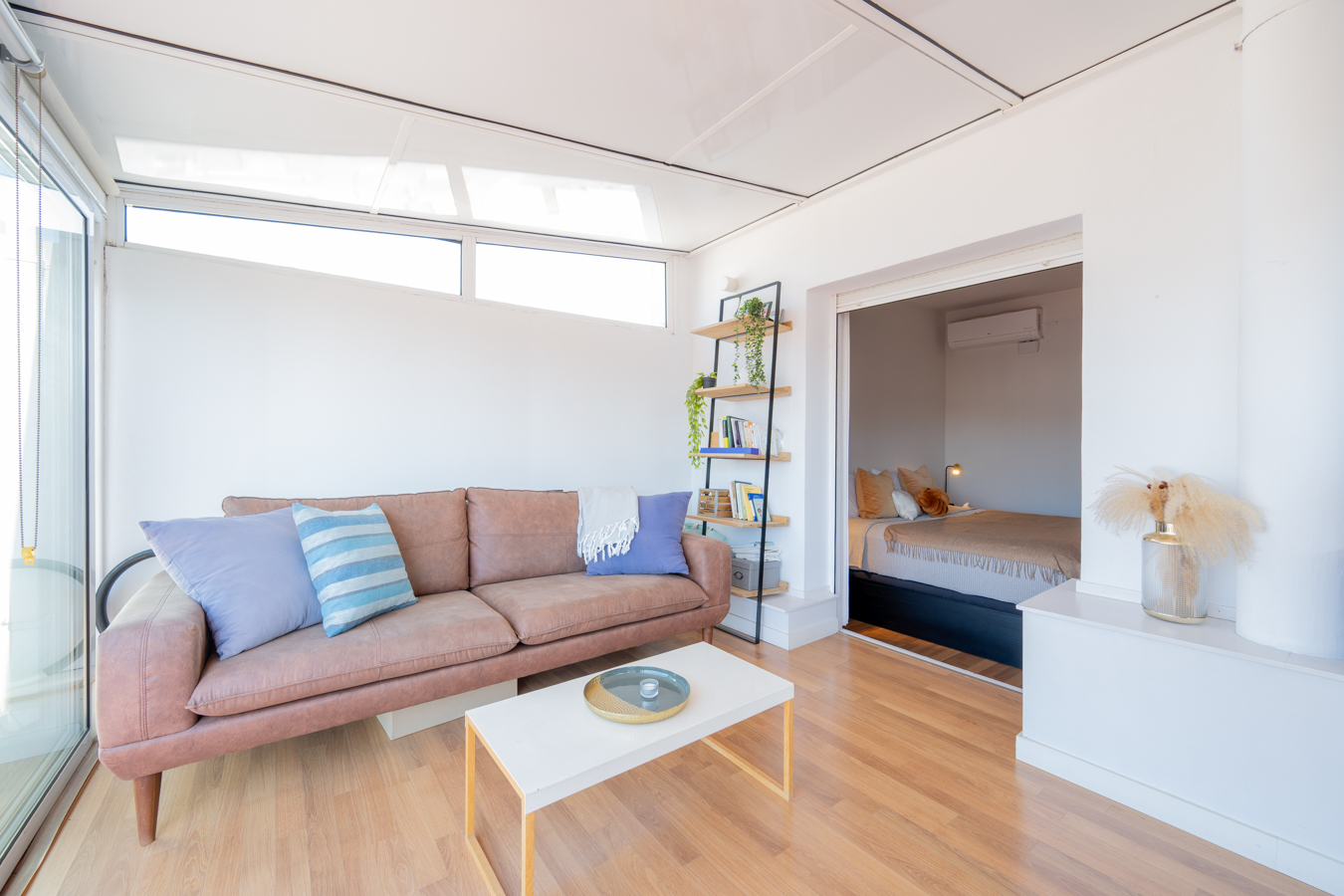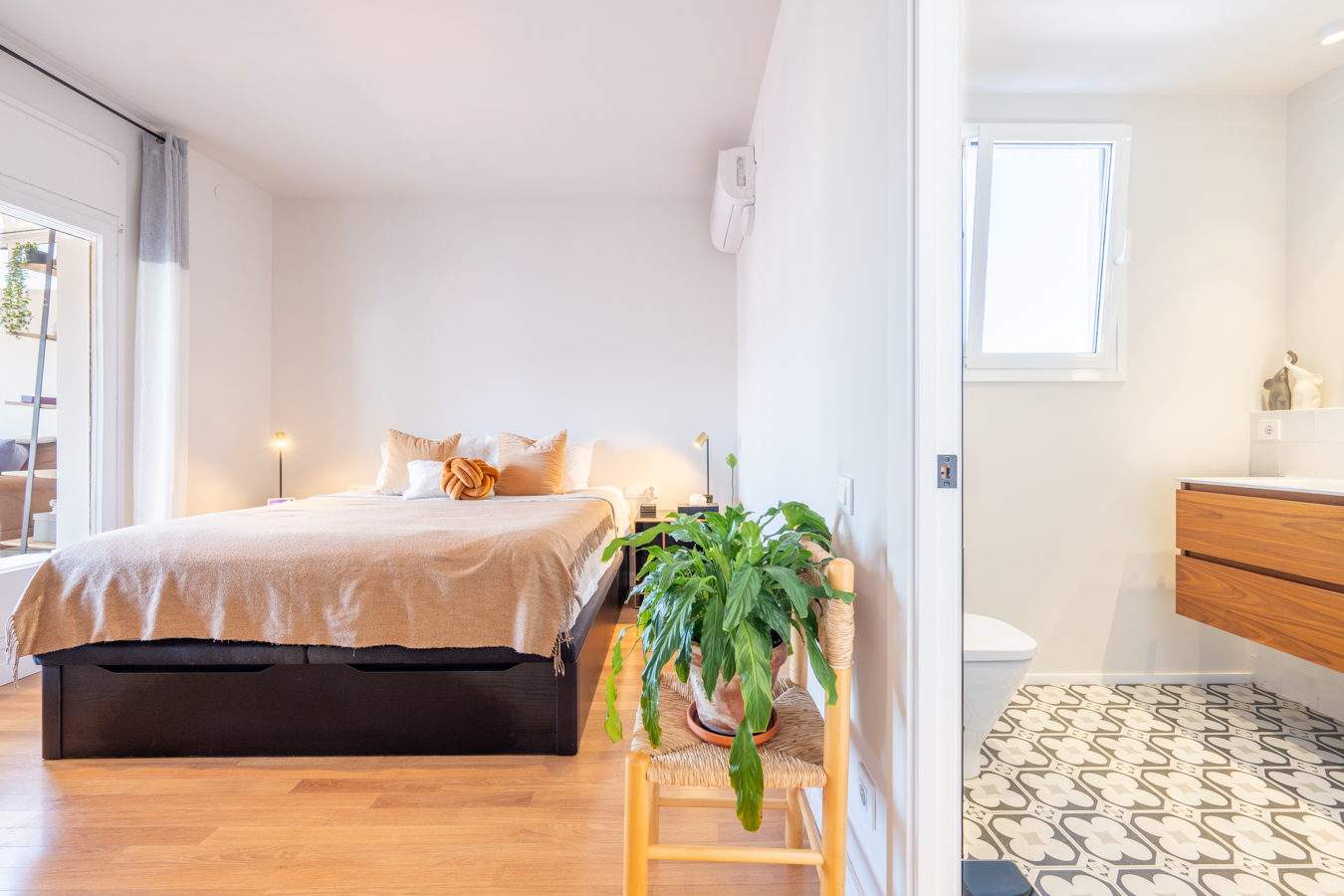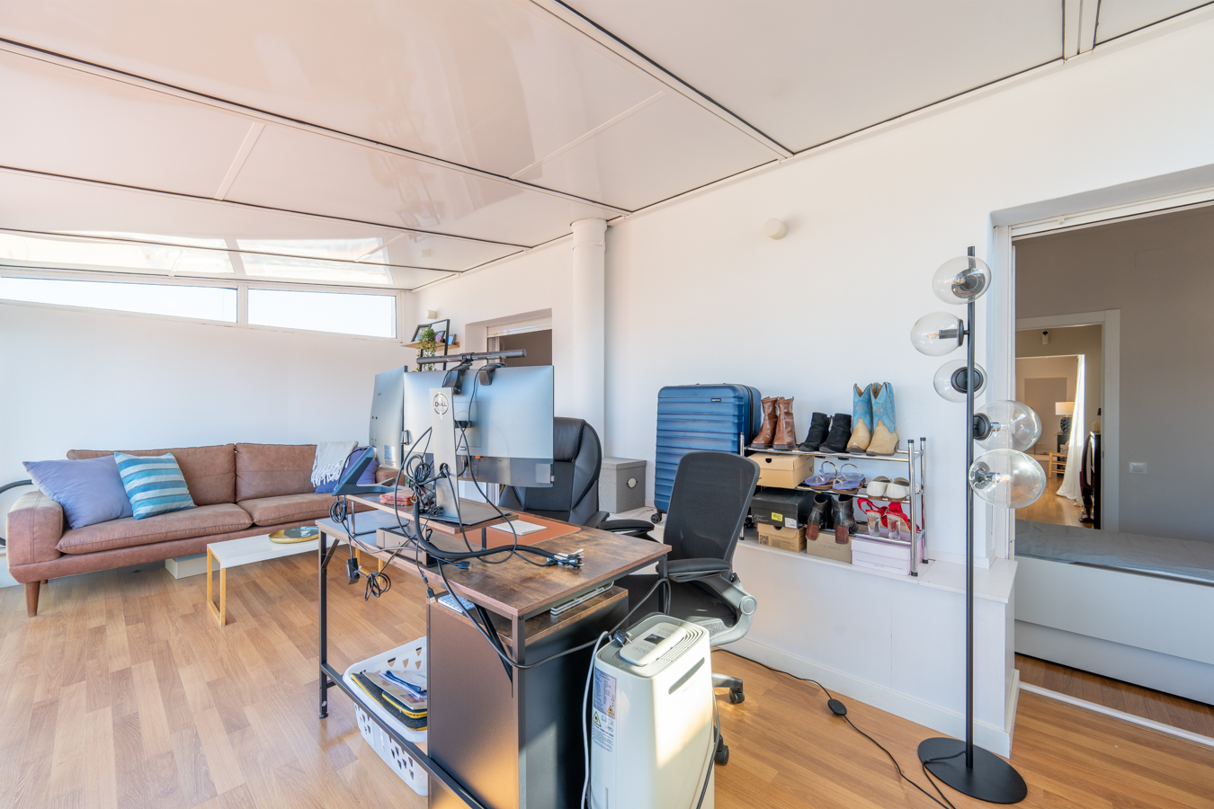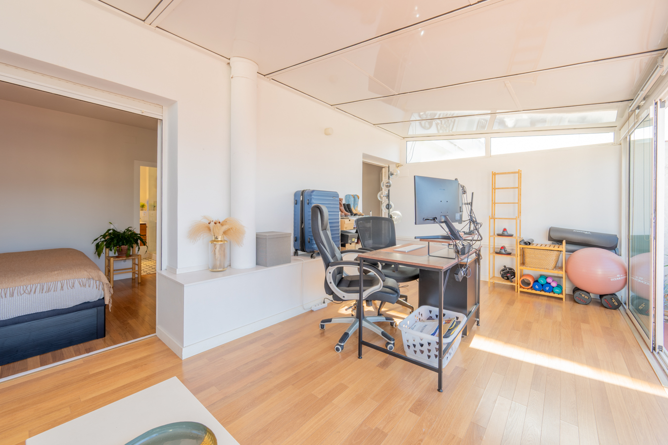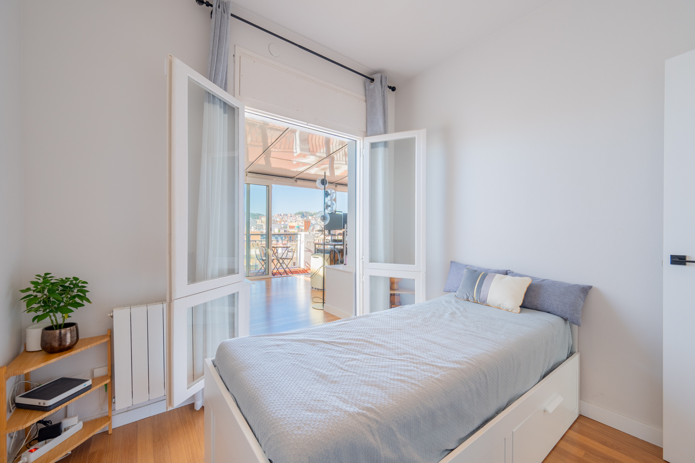 À l’autre extrémité du penthouse, la zone nuit comprend 2 chambres avec placards intégrés. La chambre principale est en suite avec salle de bain privée. Les deux chambres ont accès à une fermeture de la deuxième terrasse, qui est actuellement utilisée comme bureau. Celle-ci donne sur un balcon ouvert qui donne sur la cour intérieure, offrant également une vue sensationnelle sur la ville.