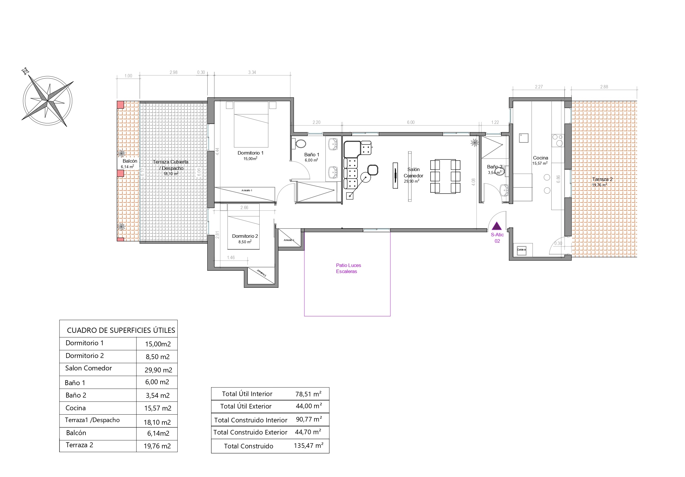 Le penthouse a une superficie intérieure de 108,8 m², y compris une fermeture réalisée sur l’une des terrasses, et une superficie extérieure de 25,9 m², répartie entre une terrasse de 19,76 m² et un balcon de 6,14 m². Il est situé au dernier étage (huitième étage réel) d’un bâtiment royal avec ascenseur, il n’y a donc aucun logement au-dessus. Sa double orientation vers la rue et la cour intérieure du bloc garantit un excellent éclairage naturel dans toutes les pièces.