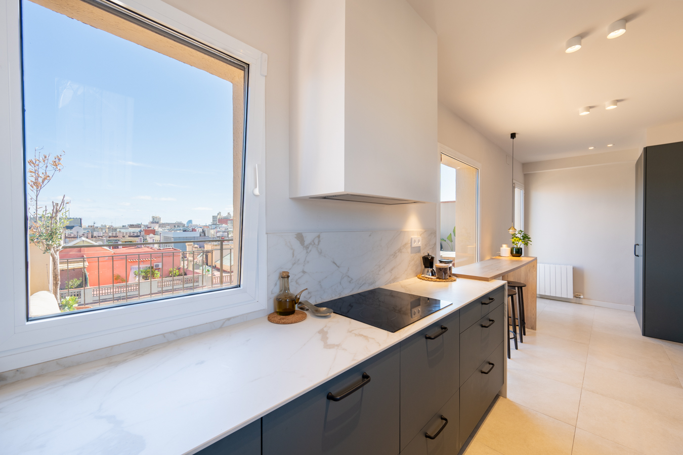 Le salon-salle à manger est spacieux et lumineux, avec deux grandes fenêtres offrant une vue dégagée qui vous donnera l’impression d’être au sommet de la ville. De là, on accède à la cuisine, entièrement équipée en appareils électroménagers, conçue comme un espace où l’on peut cuisiner à son aise et aussi recevoir. La cuisine donne accès à la magnifique terrasse, un endroit idéal pour profiter d’agréables repas, de réunions ou simplement pour se détendre. Sa vue panoramique imprenable, de la mer à la montagne, avec les bâtiments les plus reconnaissables de la ville, est unique. Enfin, entre le salon et la cuisine se trouve une salle de bain complète.