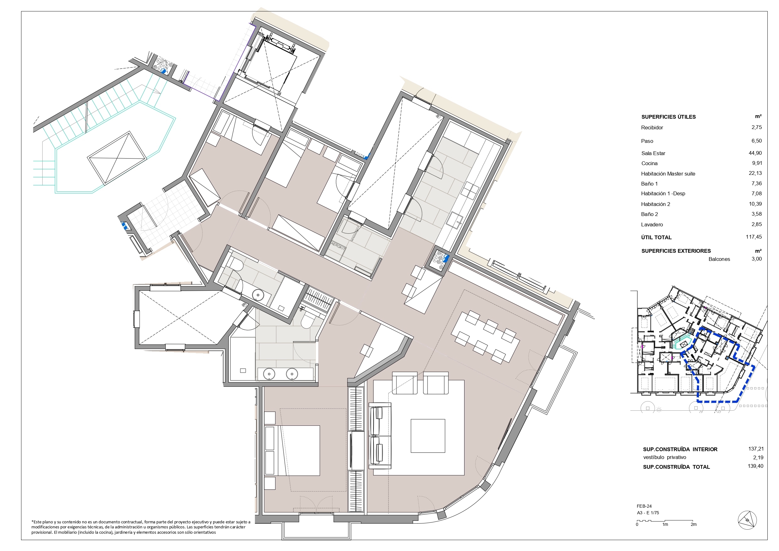 La grande façade principale du bâtiment, ainsi que les nombreuses cours intérieures et la façade arrière, offrent au bâtiment une lumière et une ventilation inégalées. La distance inhabituelle entre les bâtiments parallèles à la façade renforce encore la sensation et la perception d’espace. Comme il s’agit d’un bâtiment moderniste ayant une valeur historique importante, l’équipe chargée de l’aménagement intérieur a donné la priorité à la récupération de certains éléments d’origine. Par exemple, une restauration complète et une réhabilitation des stucs modernistes du cœur de l’escalier ont été effectuées ; et dans les halls d’entrée de l’indépendance, des mosaïques hydrauliques récupérées seront installées pour maintenir la valeur historique du bâtiment. En outre, la menuiserie extérieure a été modifiée avec des fenêtres et des balcons en bois avec rupture de pont thermique et verre isolant feuilleté.