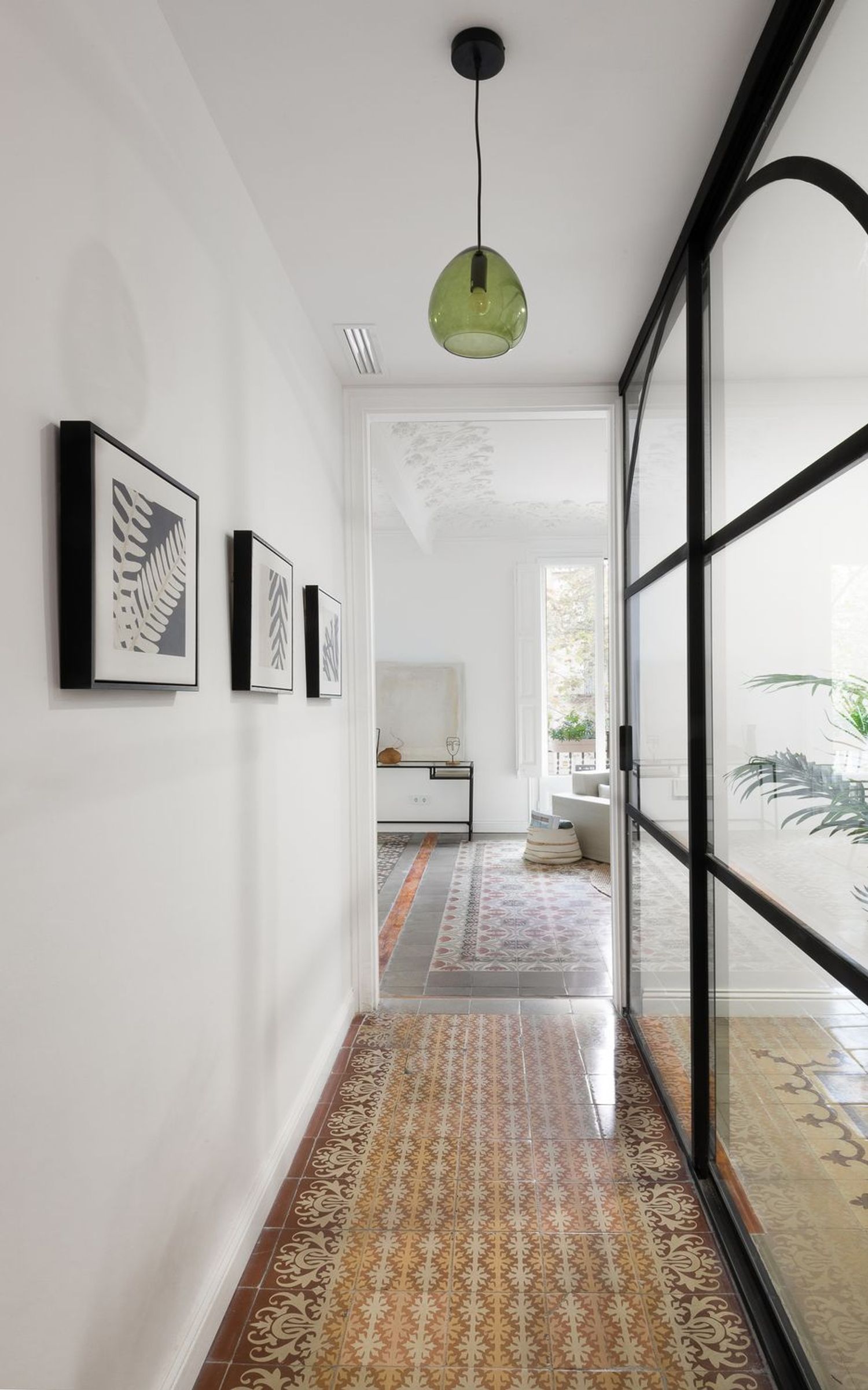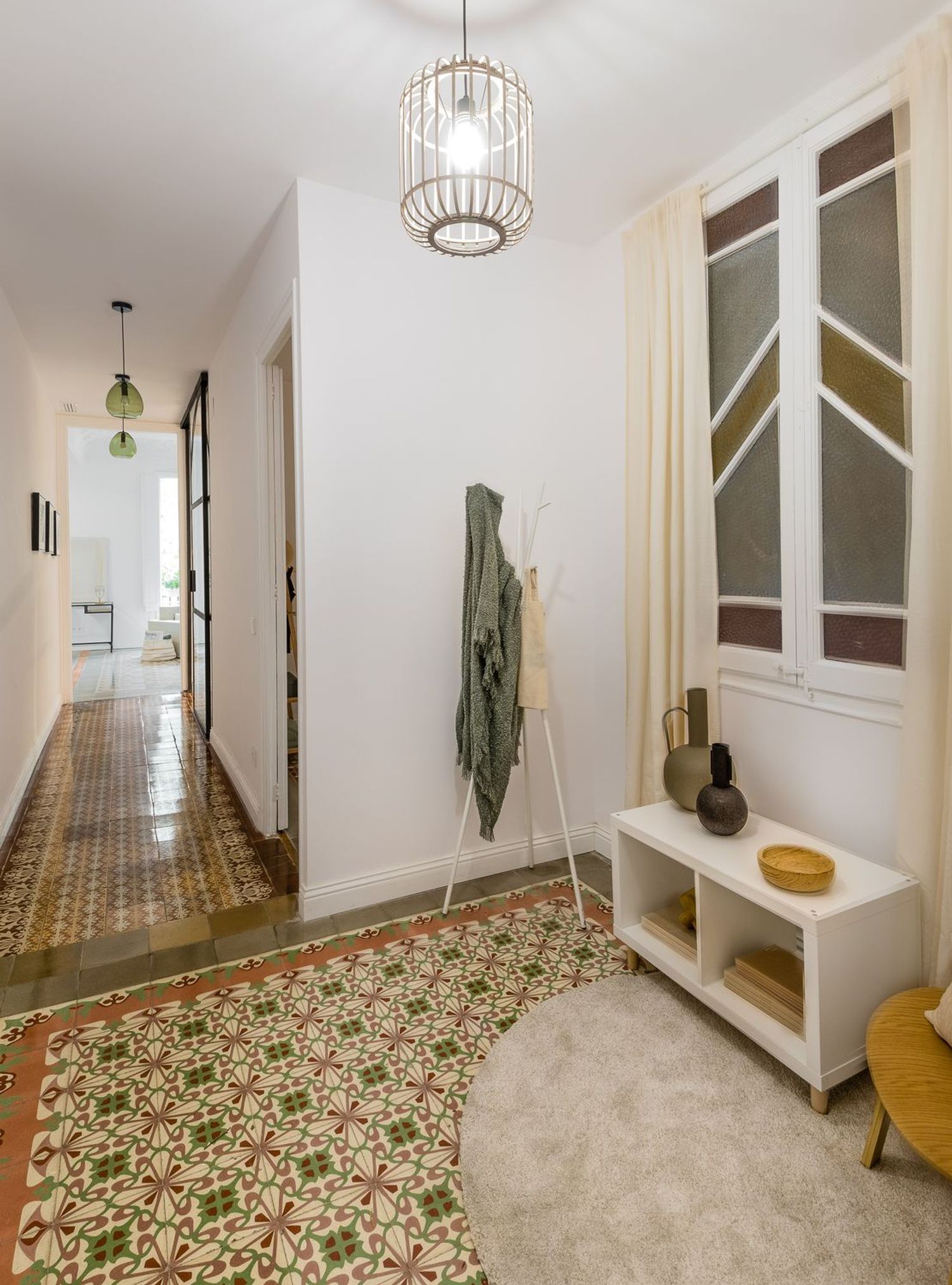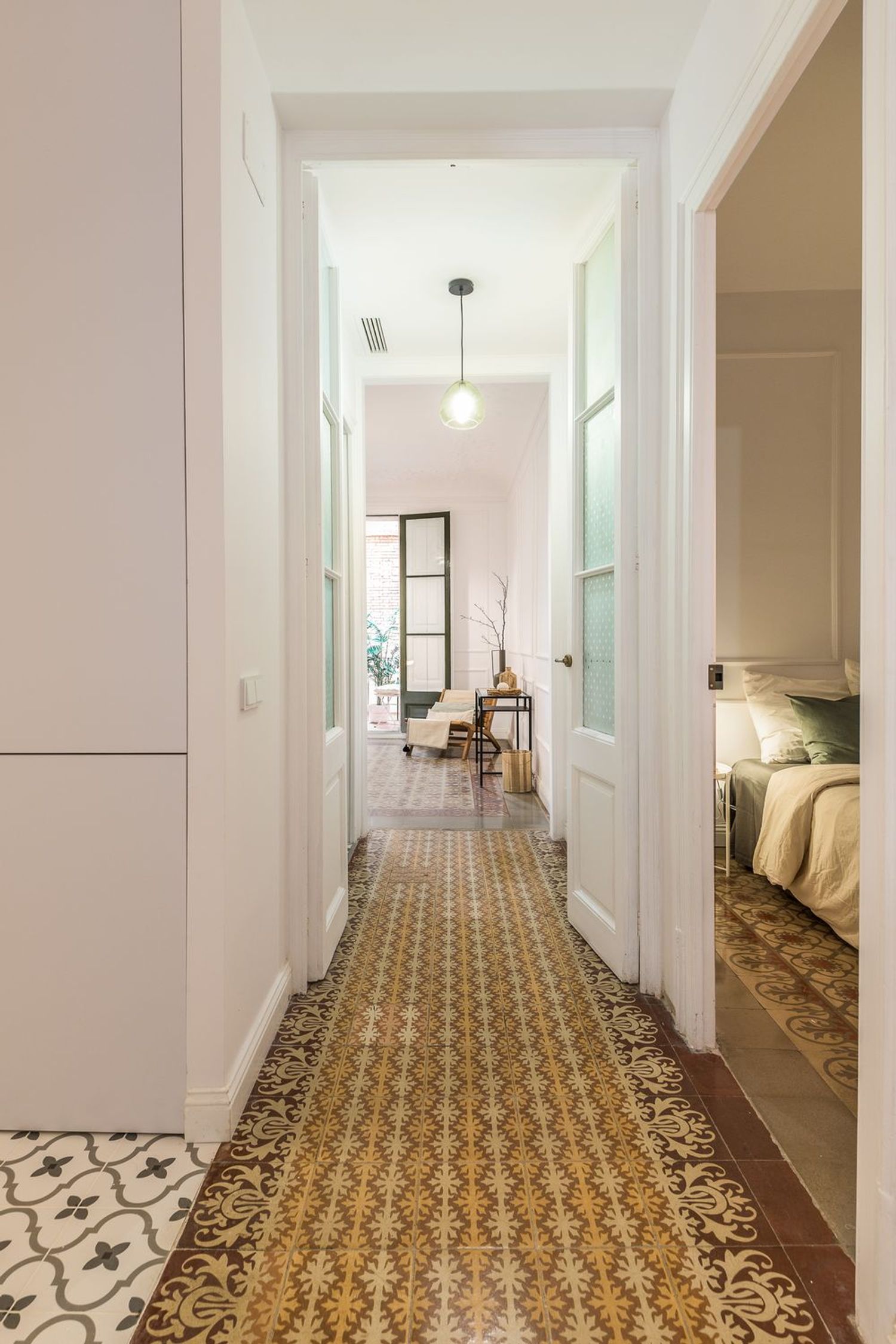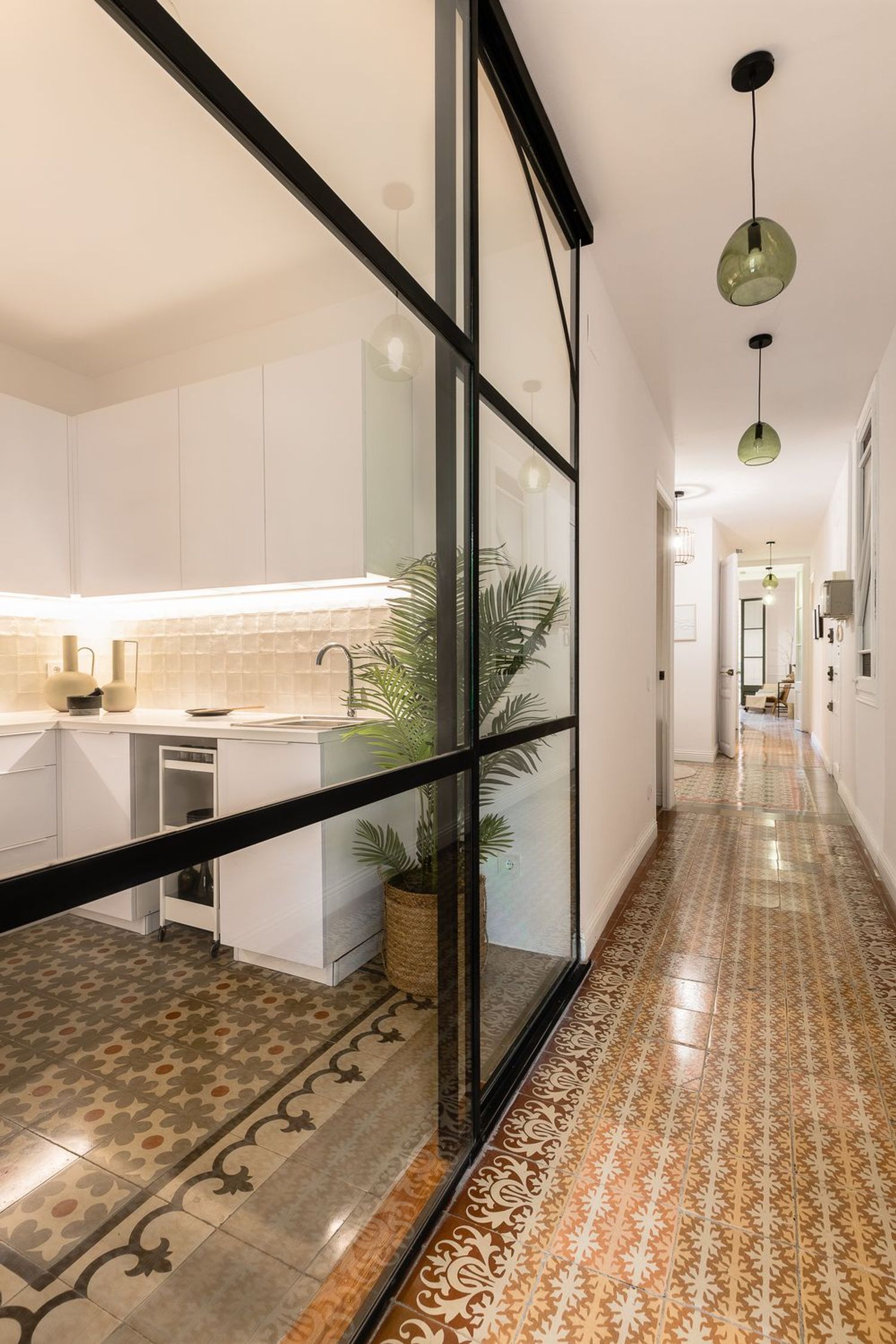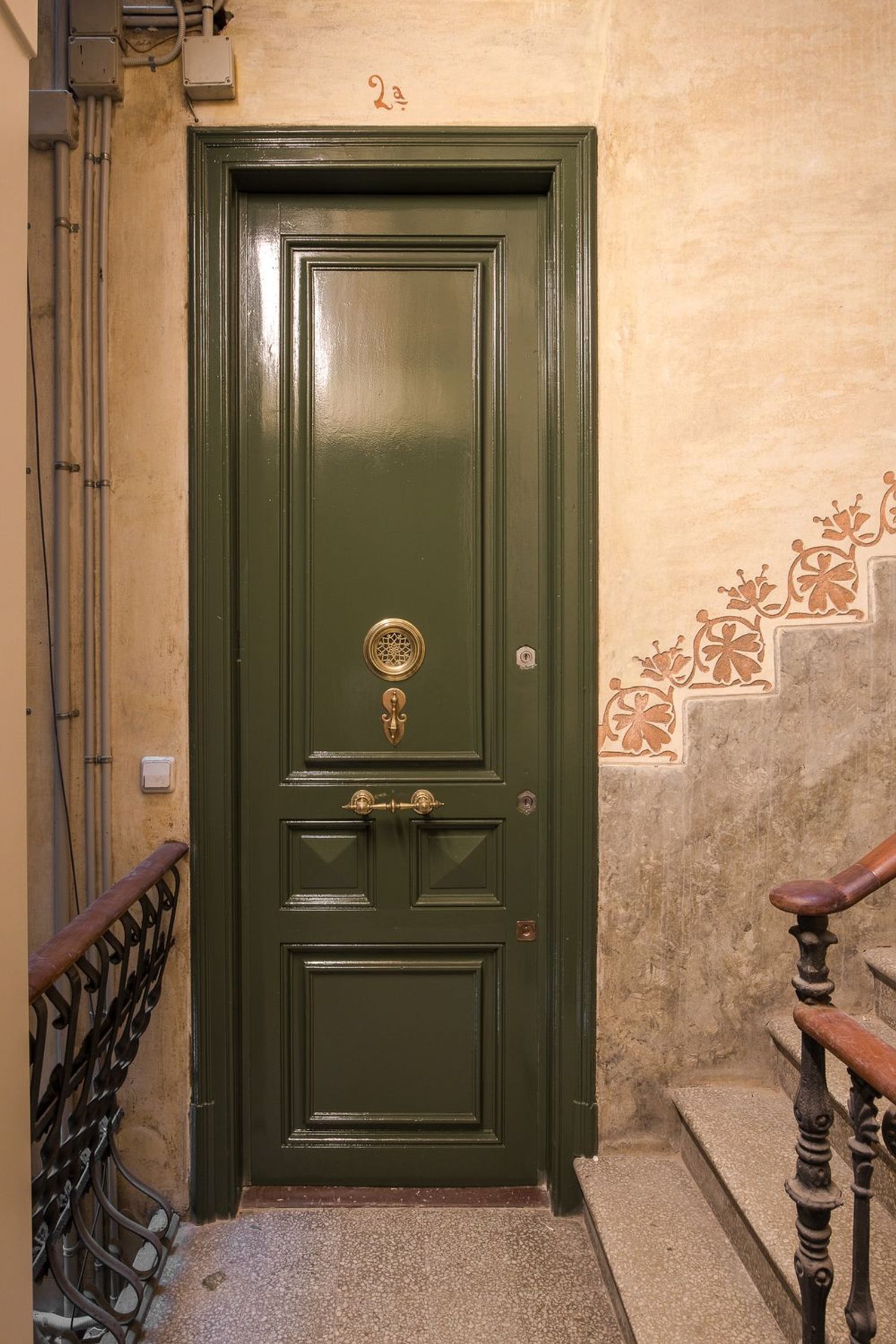 La propriété a été rénovée avec un souci du détail extraordinaire, en préservant des éléments originaux de grande valeur tels que les sols hydrauliques restaurés, les vitraux colorés et les vitres décoratives, la menuiserie traditionnelle et les portes sur mesure en métal et en verre. Les hauts plafonds, magistralement conservés, ont conservé leurs moulures et leurs plâtres ornementaux, tandis que les parties communes de l’immeuble arborent d’élégants plafonds peints à la main. Cette esthétique historique est complétée par une rénovation complète réalisée avec des matériaux contemporains haut de gamme.