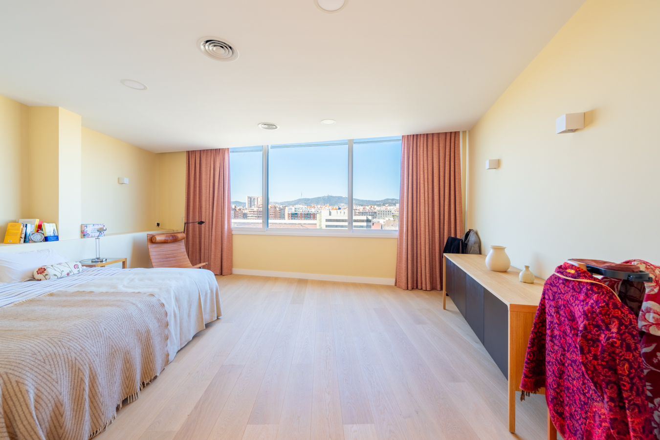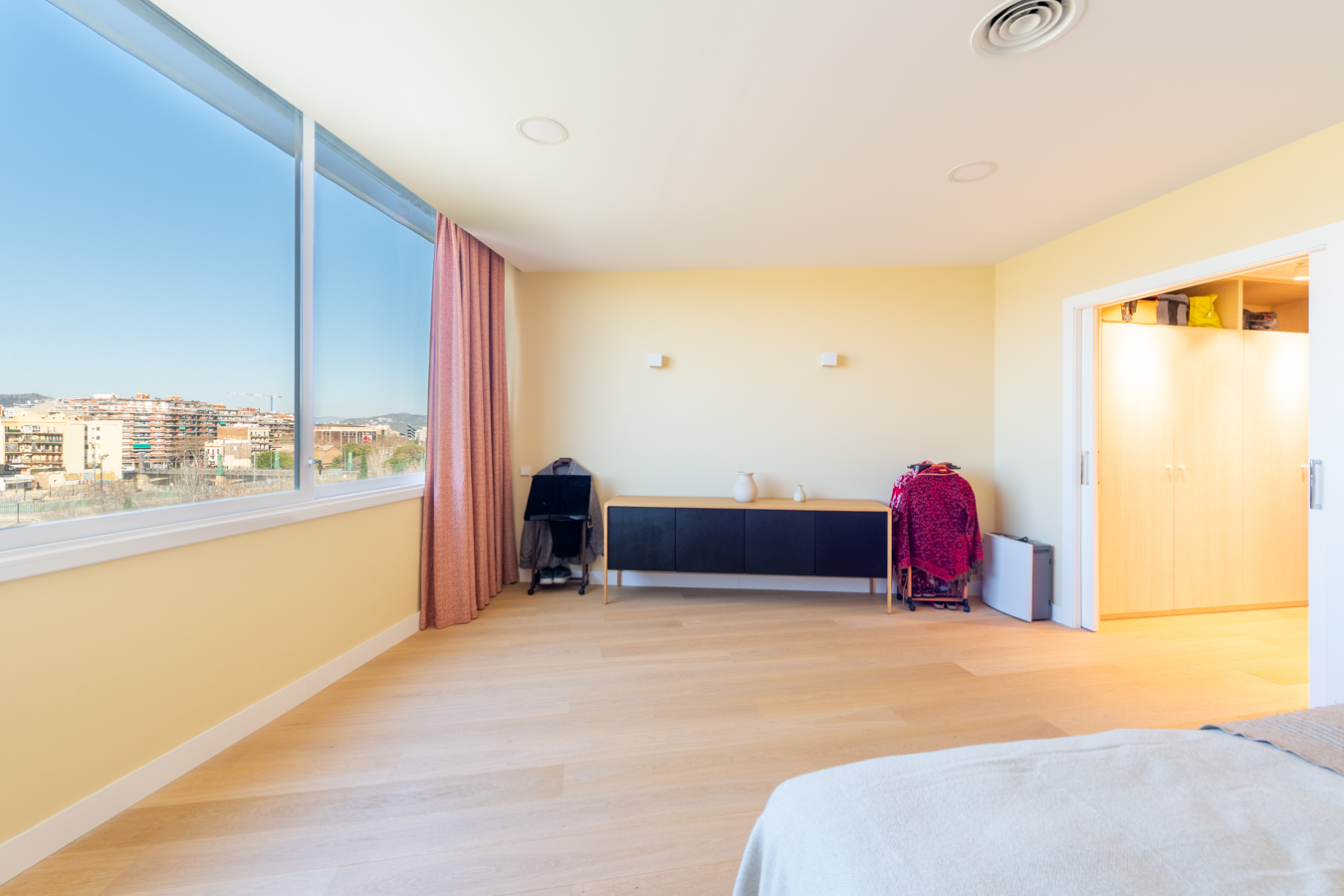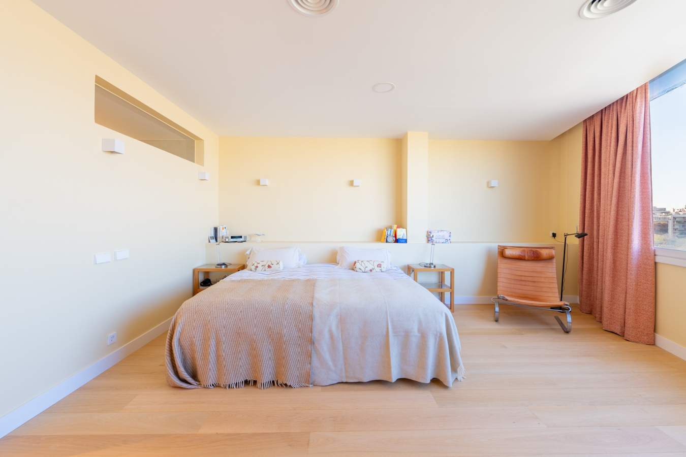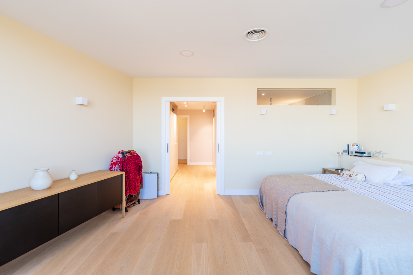 L’étage inférieur est la zone de couchage, avec 4 très grandes chambres. La suite parentale de 27 m2 dispose d’un grand dressing et d’une salle de bains avec cabine de douche. Il y a également 2 chambres doubles de 21 m2 et 19 m2 avec armoires encastrées, qui partageant une salle de bain et, comme la chambre principale, ont une vue fantastique sur la ville. Enfin, une chambre de 13 m2 s’ouvre sur un patio intérieur très lumineux et une salle de bain séparée.