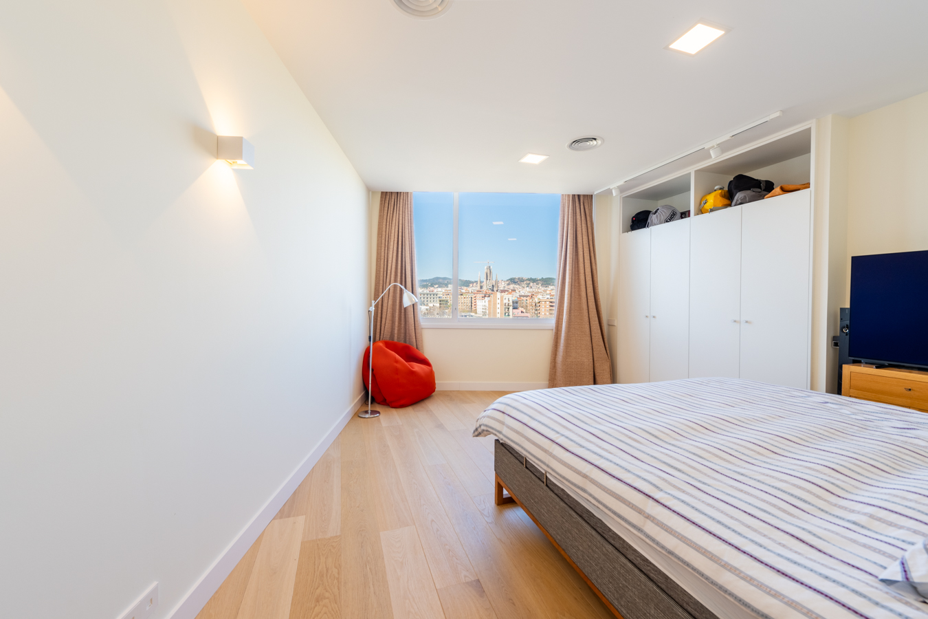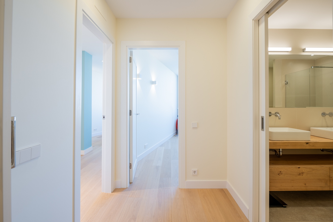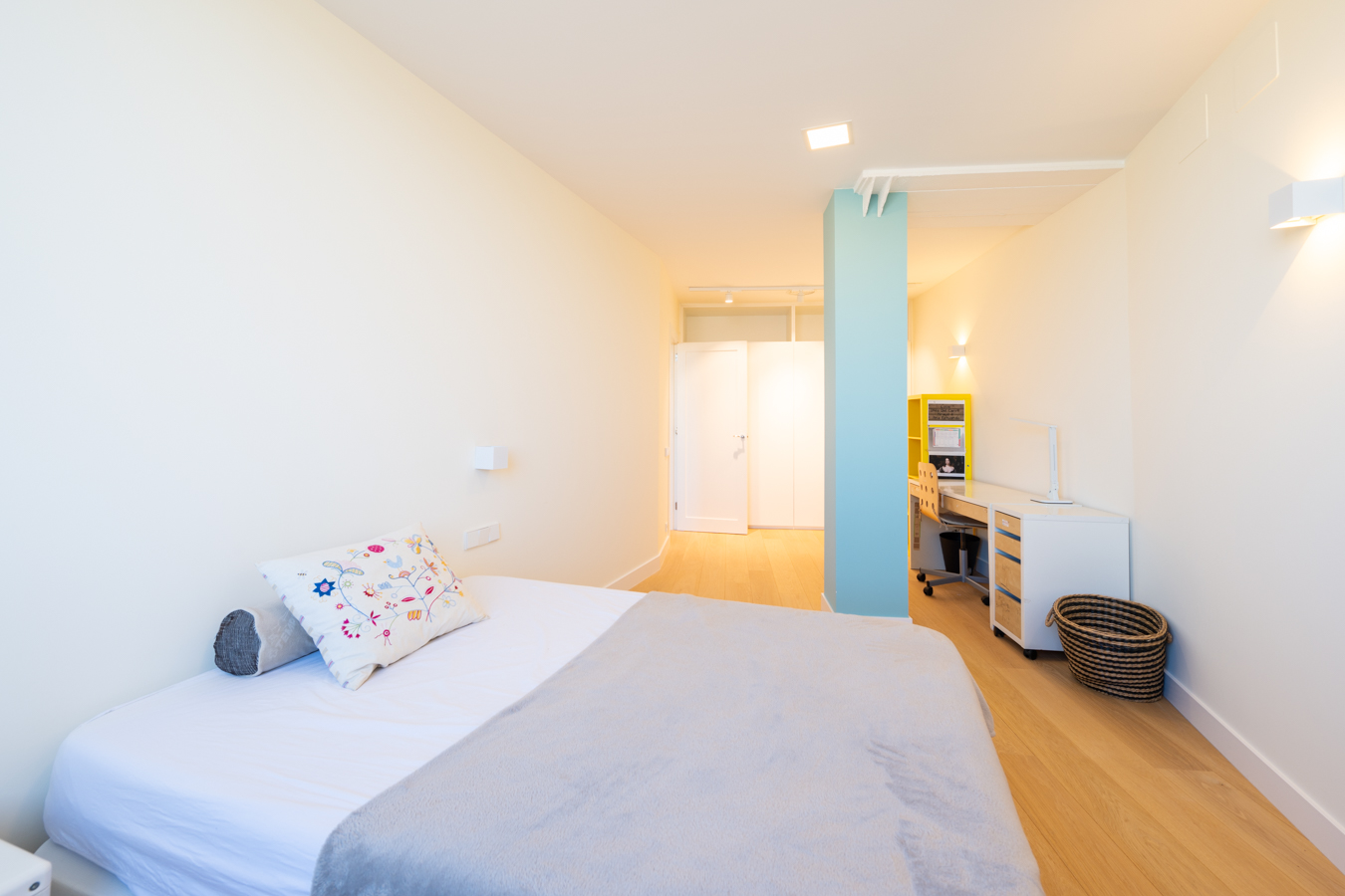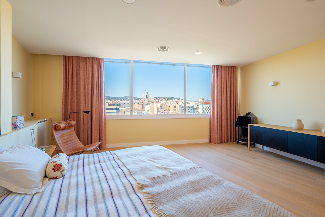 L’étage inférieur est la zone de couchage, avec 4 très grandes chambres. La suite parentale de 27 m2 dispose d’un grand dressing et d’une salle de bains avec cabine de douche. Il y a également 2 chambres doubles de 21 m2 et 19 m2 avec armoires encastrées, qui partageant une salle de bain et, comme la chambre principale, ont une vue fantastique sur la ville. Enfin, une chambre de 13 m2 s’ouvre sur un patio intérieur très lumineux et une salle de bain séparée.