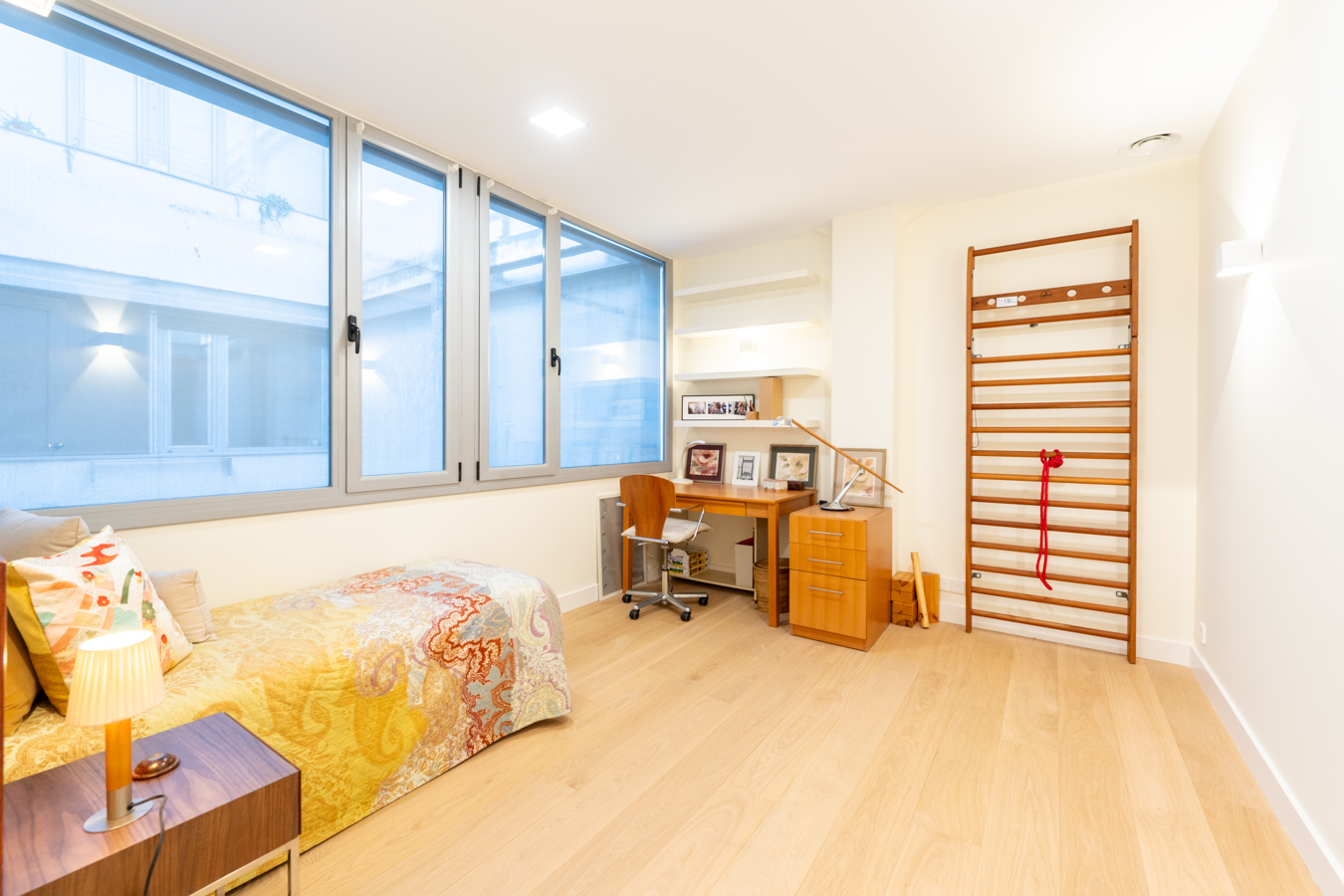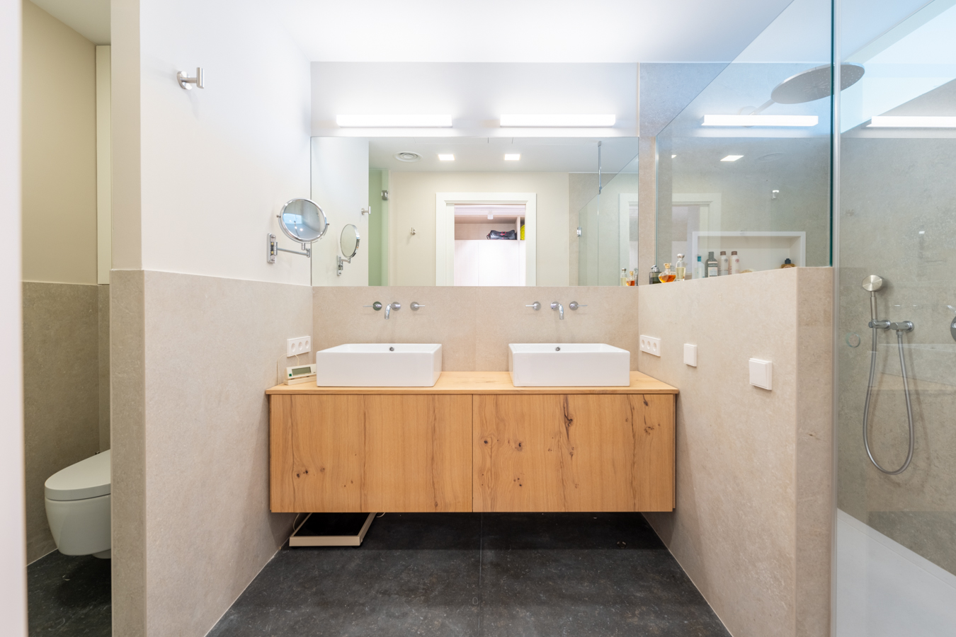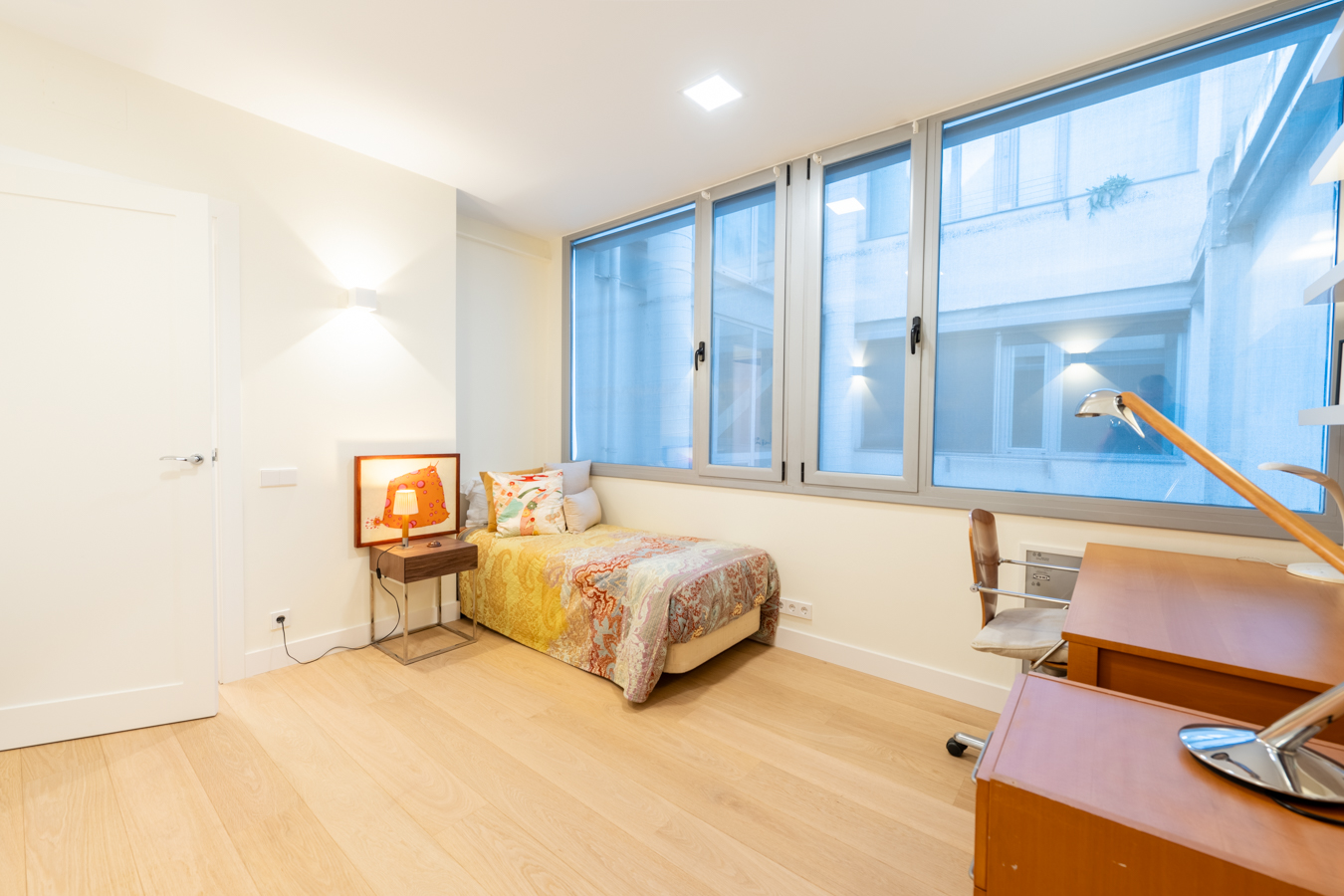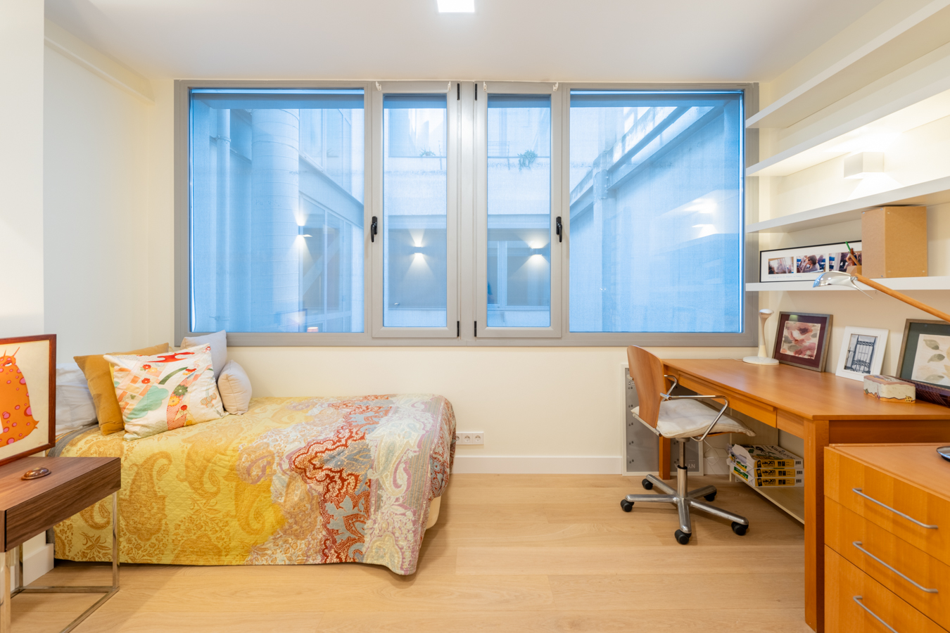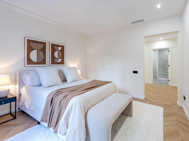 L’étage inférieur est la zone de couchage, avec 4 très grandes chambres. La suite parentale de 27 m2 dispose d’un grand dressing et d’une salle de bains avec cabine de douche. Il y a également 2 chambres doubles de 21 m2 et 19 m2 avec armoires encastrées, qui partageant une salle de bain et, comme la chambre principale, ont une vue fantastique sur la ville. Enfin, une chambre de 13 m2 s’ouvre sur un patio intérieur très lumineux et une salle de bain séparée.