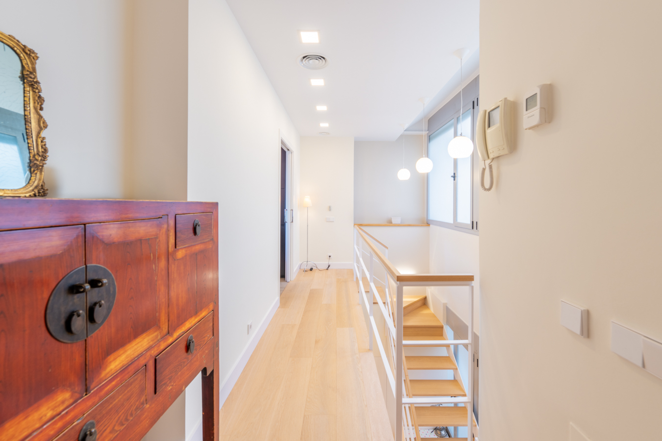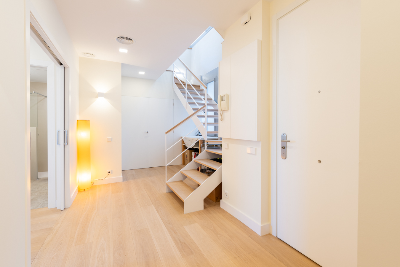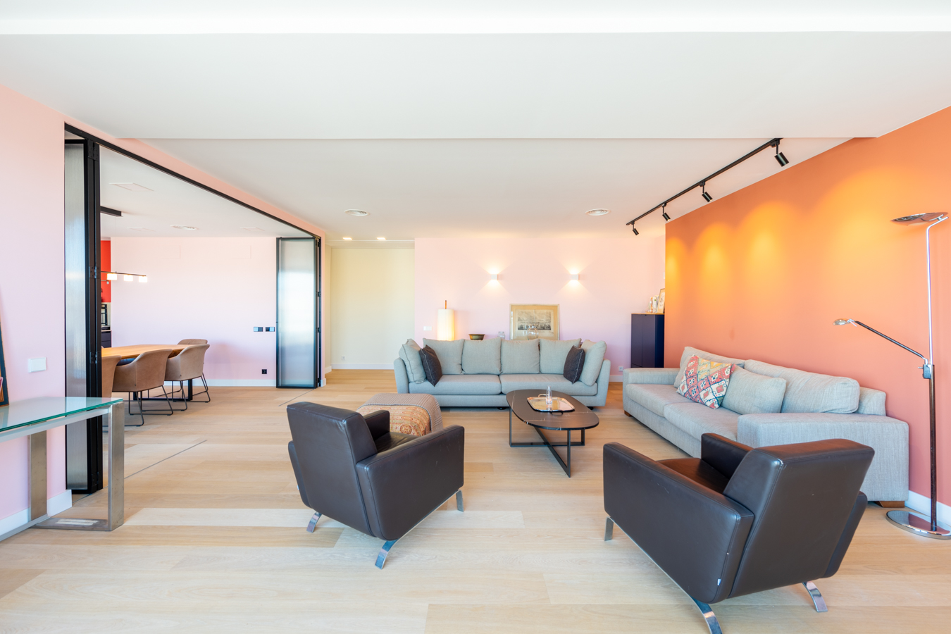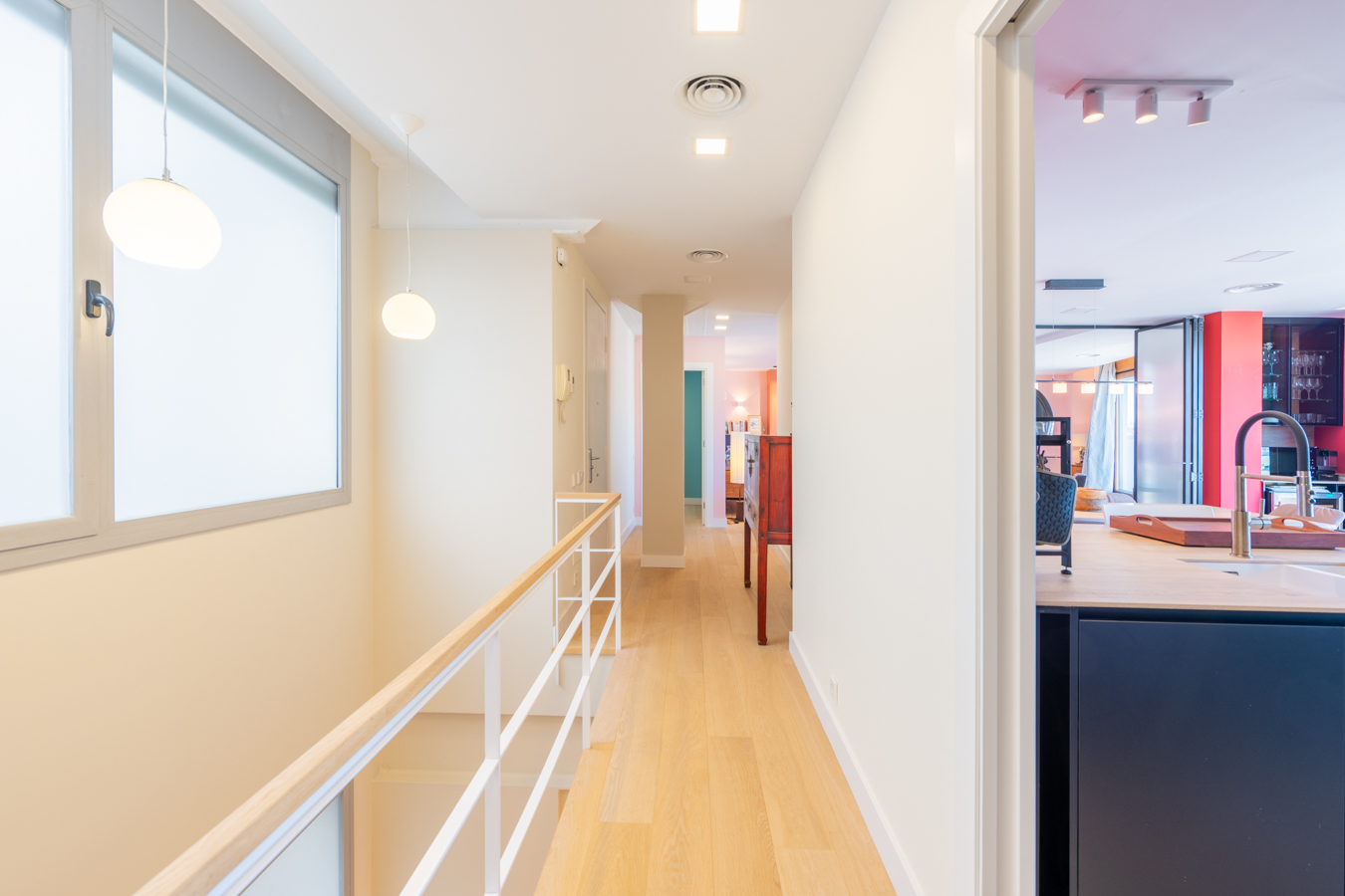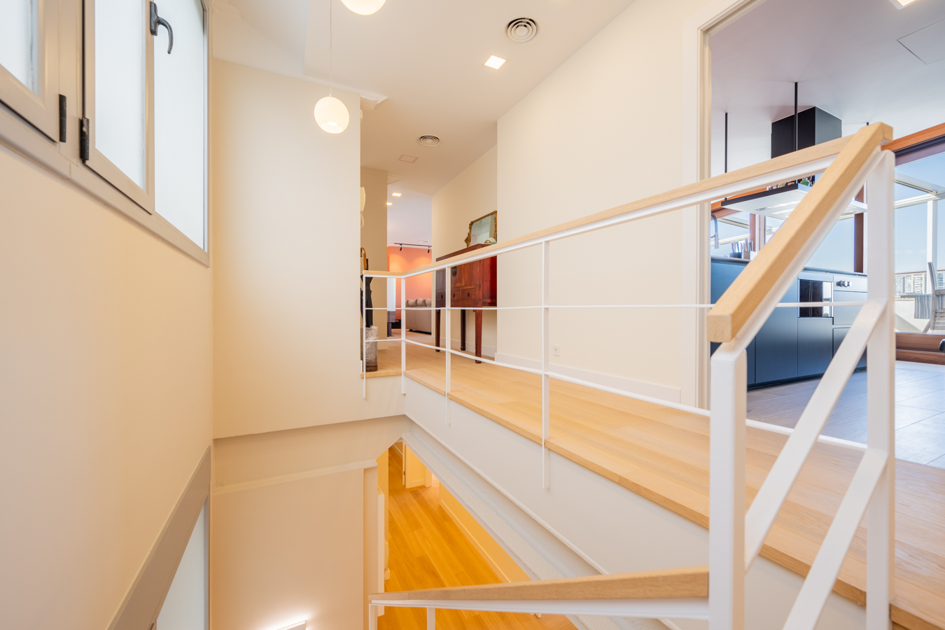 Ce penthouse est situé aux 6ème et 7ème étages de l’immeuble, avec des escaliers intérieurs qui les relient et une entrée indépendante pour chacun d’entre eux. L’étage supérieur est la zone de jour, un grand espace ouvert de 66 m2 qui réunit le salon, la salle à manger et la cuisine ouverte, avec accès à la terrasse. En outre, il est possible de séparer le salon et la salle à manger de la cuisine grâce à une élégante cloison en verre. La cuisine est équipée d’appareils électroménagers haut de gamme, dont un grand four, un grill et un chauffe-plats. Cet étage comprend également une toilette pour les invités, auxquelles on accède par un vestiaire situé à l’entrée.