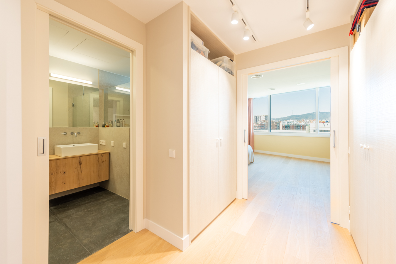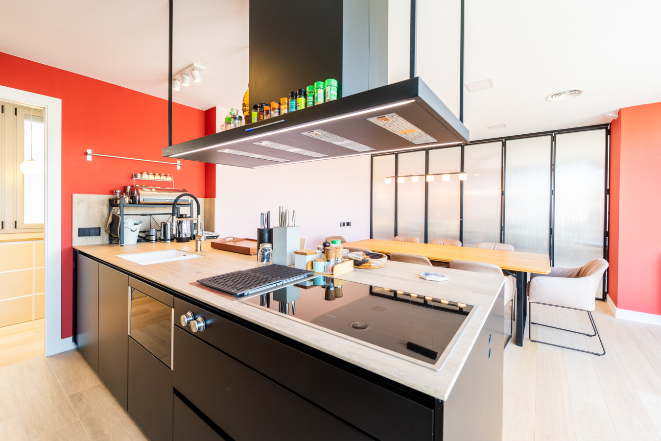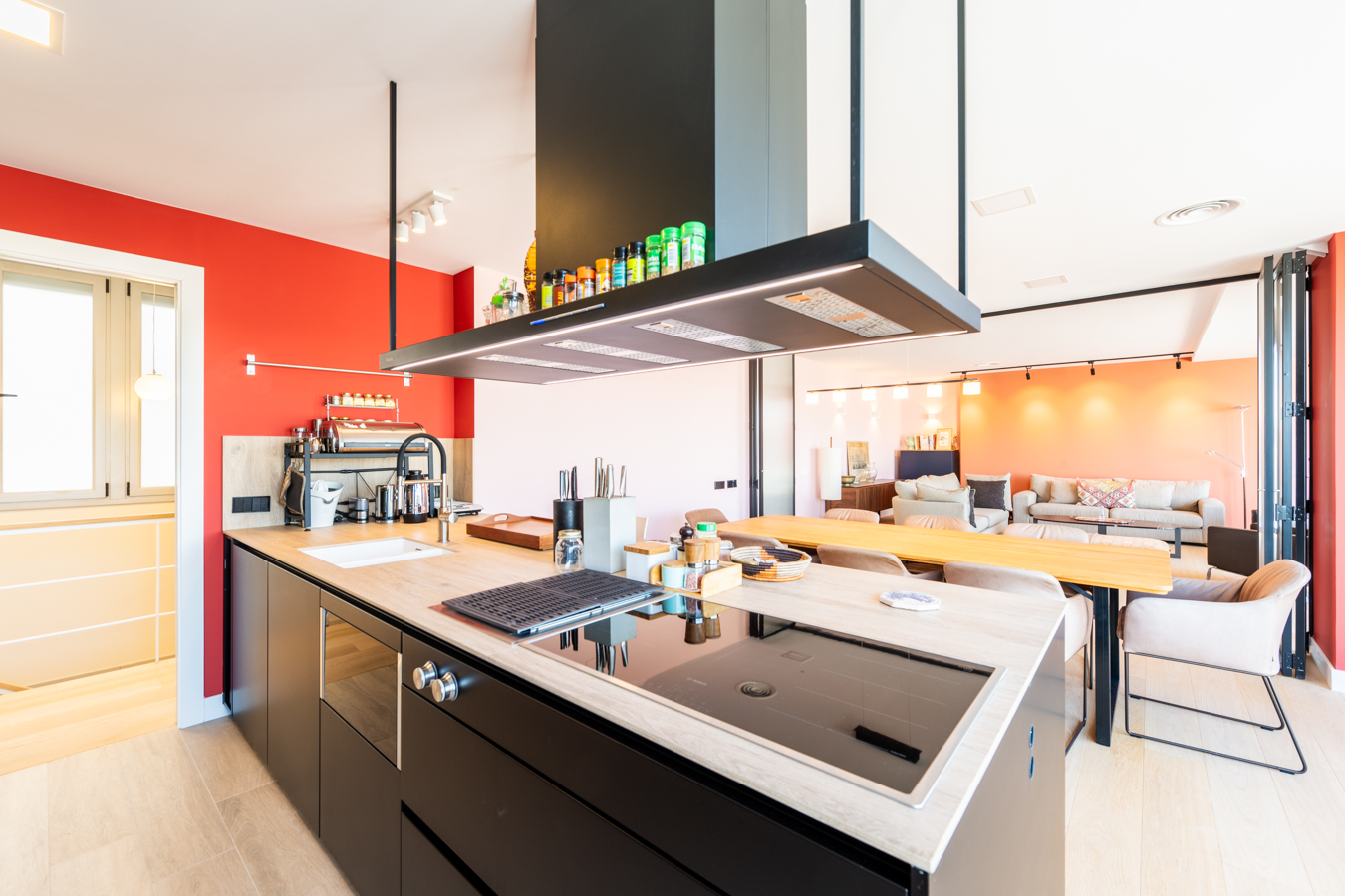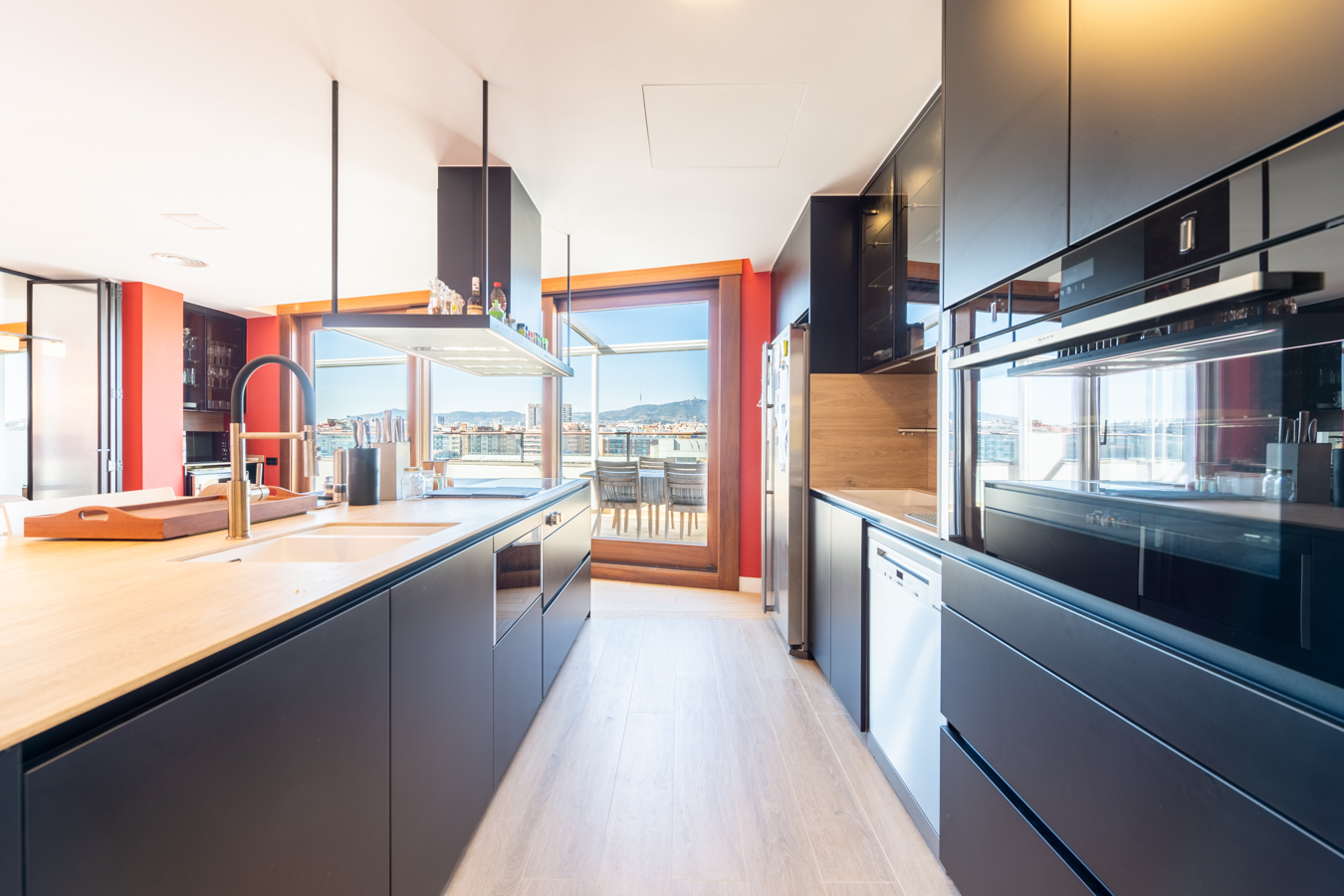 Ce penthouse est situé aux 6ème et 7ème étages de l’immeuble, avec des escaliers intérieurs qui les relient et une entrée indépendante pour chacun d’entre eux. L’étage supérieur est la zone de jour, un grand espace ouvert de 66 m2 qui réunit le salon, la salle à manger et la cuisine ouverte, avec accès à la terrasse. En outre, il est possible de séparer le salon et la salle à manger de la cuisine grâce à une élégante cloison en verre. La cuisine est équipée d’appareils électroménagers haut de gamme, dont un grand four, un grill et un chauffe-plats. Cet étage comprend également une toilette pour les invités, auxquelles on accède par un vestiaire situé à l’entrée.
