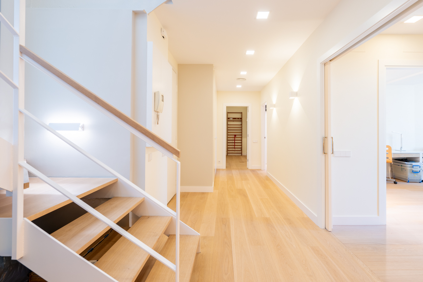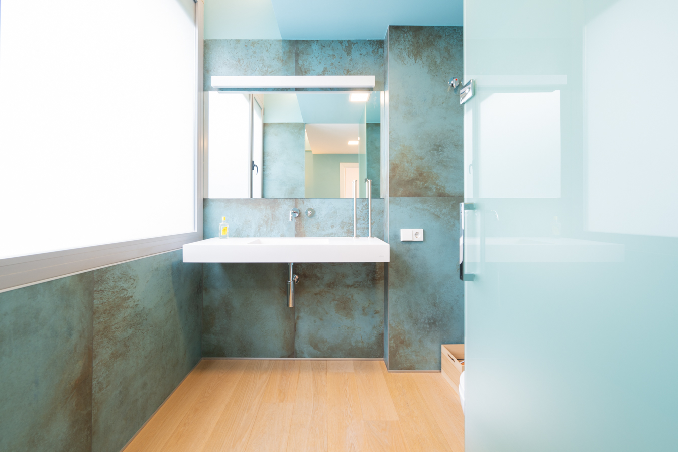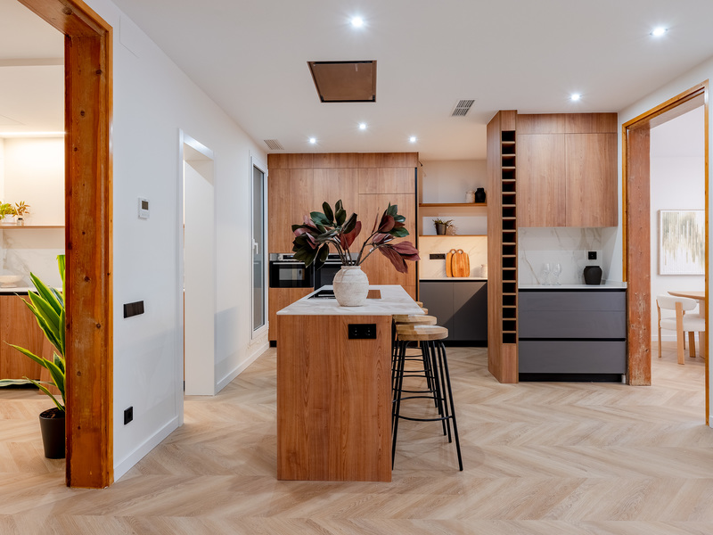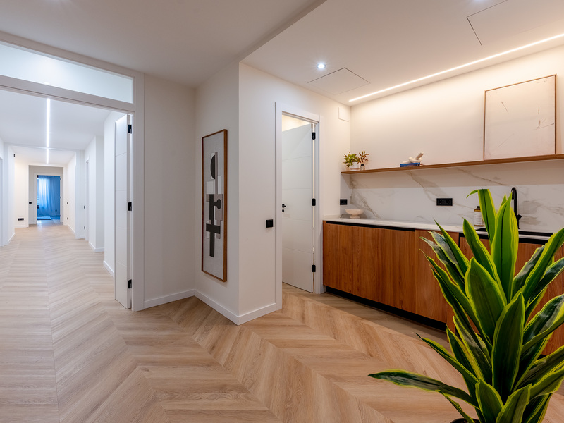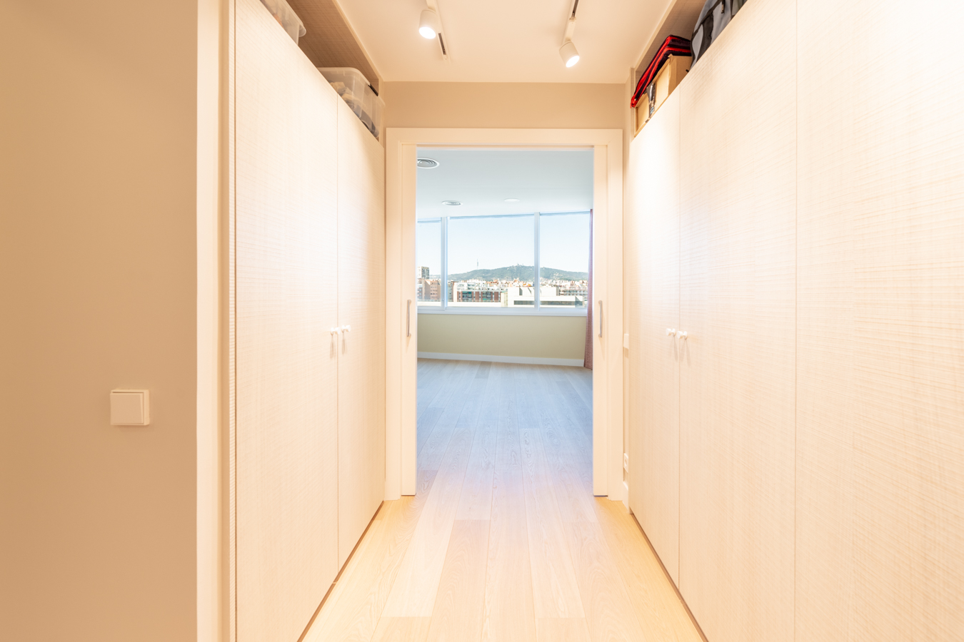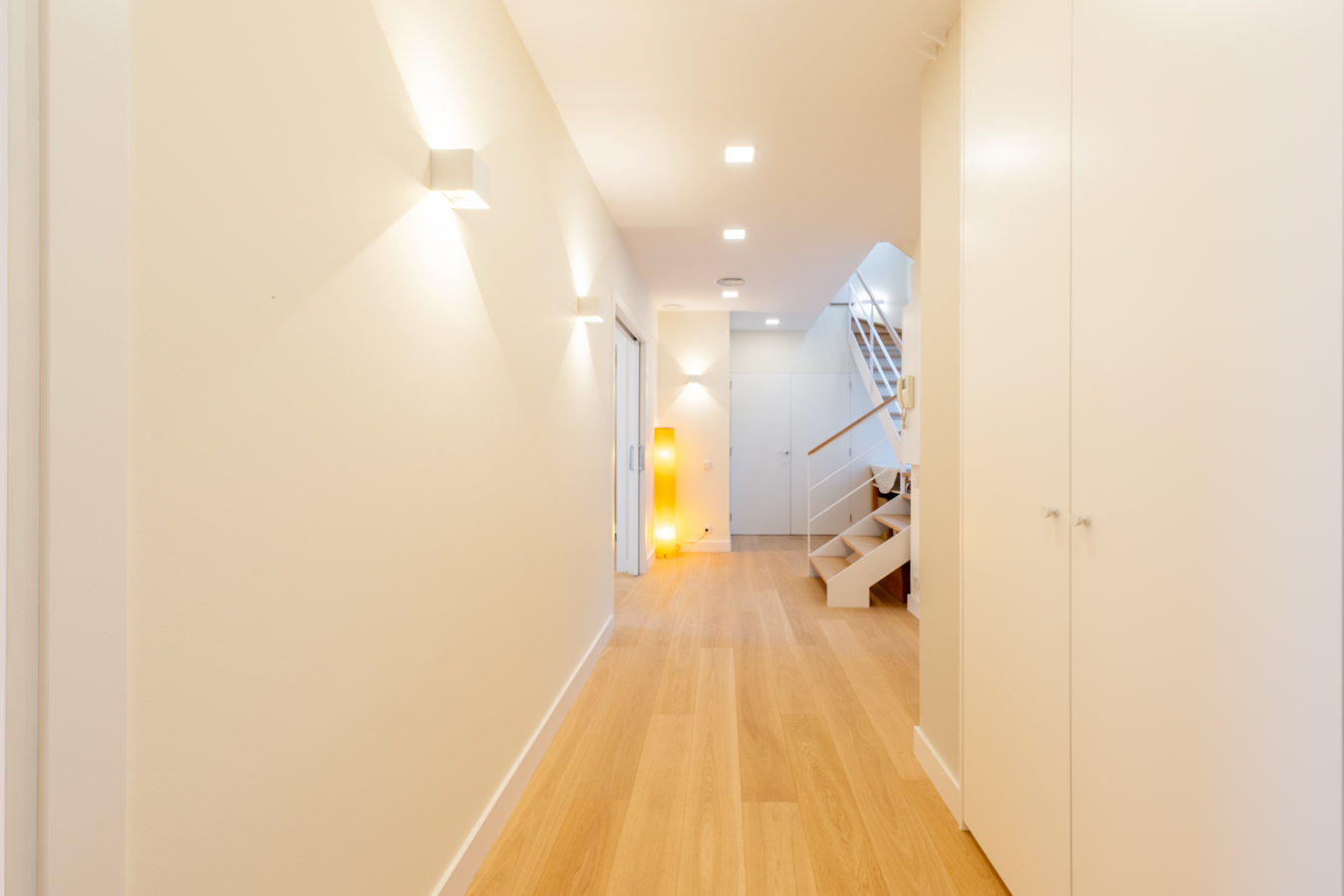 Ce penthouse est situé aux 6ème et 7ème étages de l’immeuble, avec des escaliers intérieurs qui les relient et une entrée indépendante pour chacun d’entre eux. L’étage supérieur est la zone de jour, un grand espace ouvert de 66 m2 qui réunit le salon, la salle à manger et la cuisine ouverte, avec accès à la terrasse. En outre, il est possible de séparer le salon et la salle à manger de la cuisine grâce à une élégante cloison en verre. La cuisine est équipée d’appareils électroménagers haut de gamme, dont un grand four, un grill et un chauffe-plats. Cet étage comprend également une toilette pour les invités, auxquelles on accède par un vestiaire situé à l’entrée.