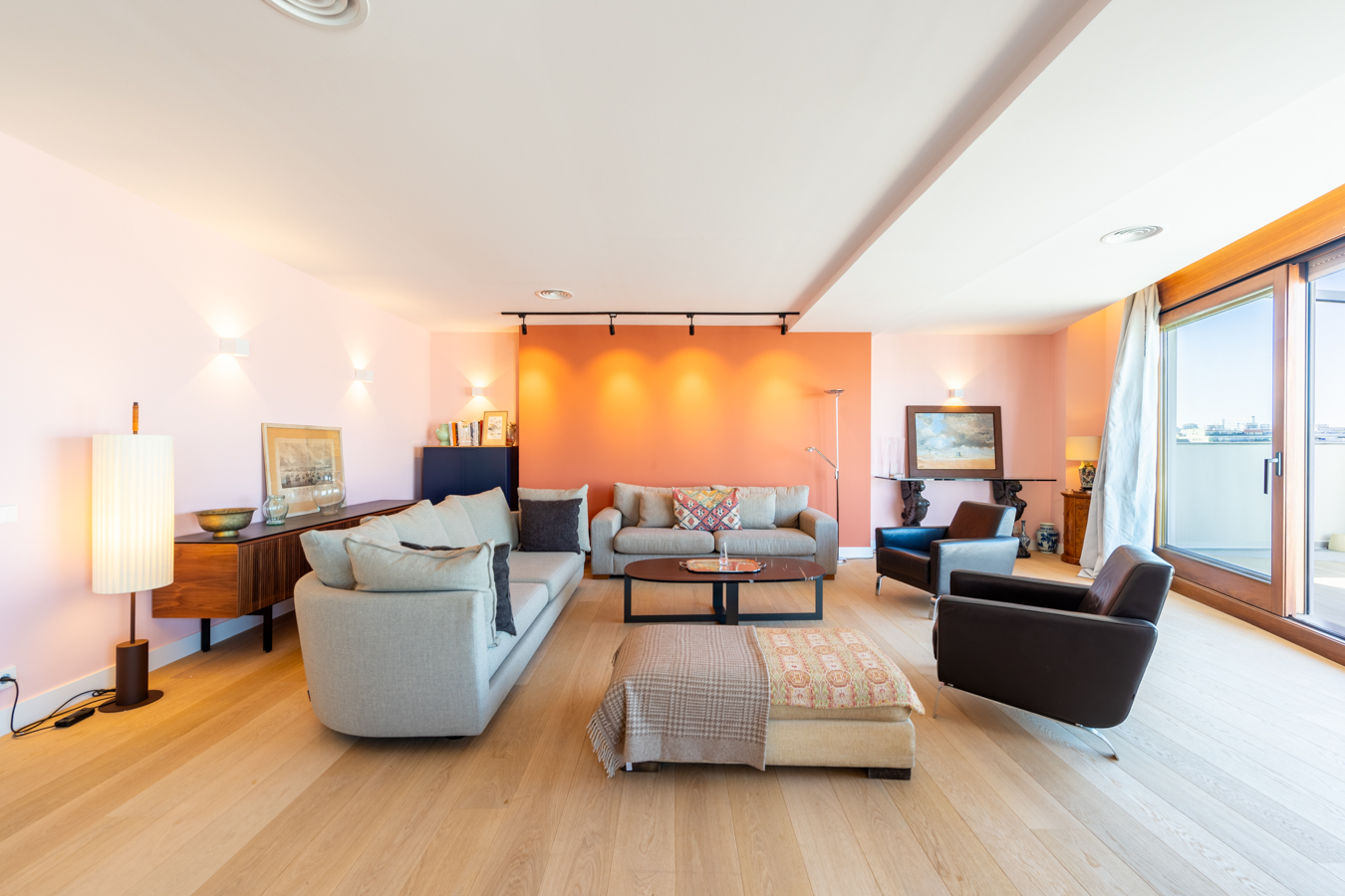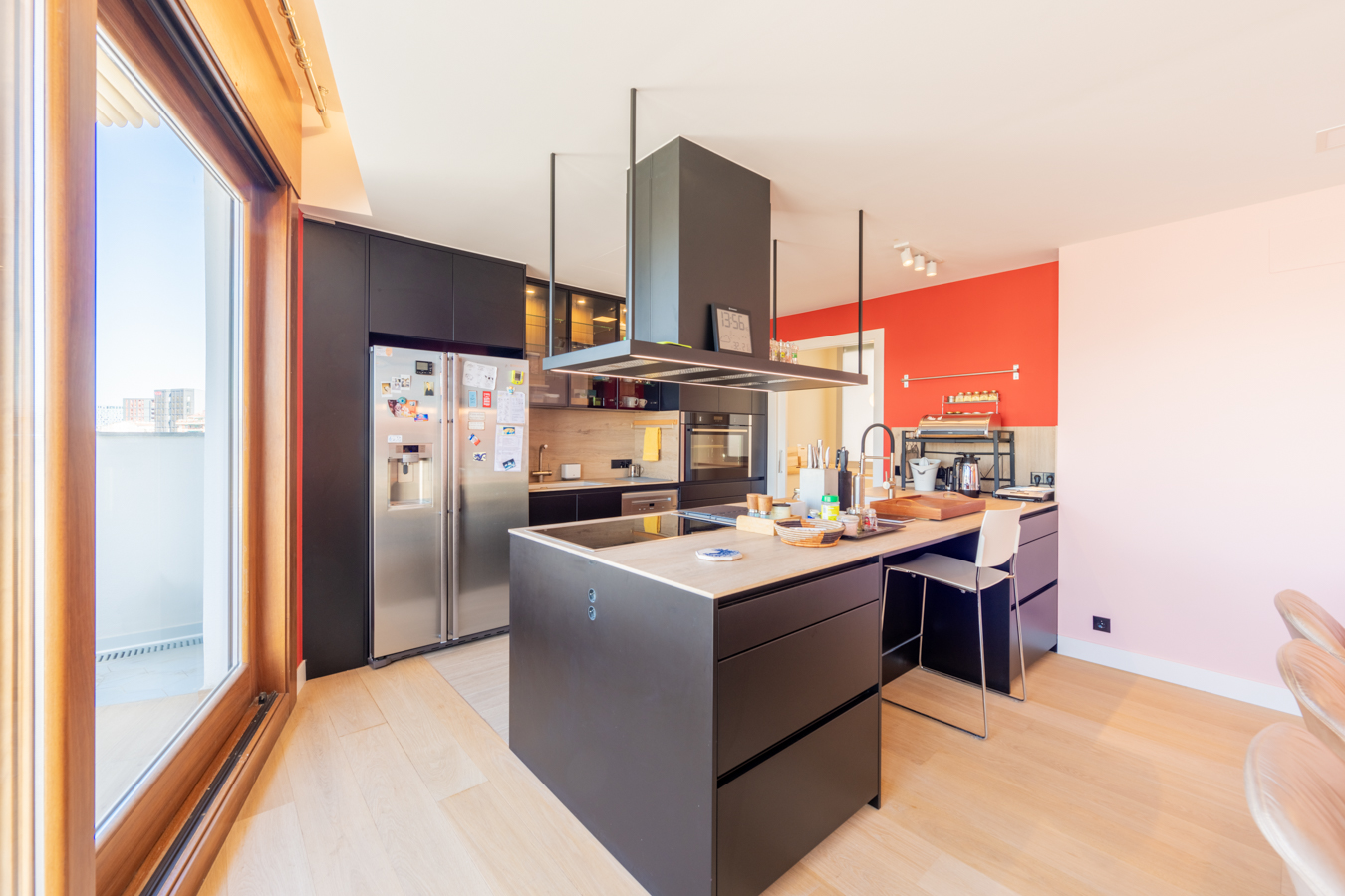 Ce penthouse est équipé des meilleures qualités. Il dispose de parquet en chêne naturel, de la climatisation, d’un système aérothermique avec récupération de chaleur, de stores mécanisés, de portes laquées, d’une installation électrique et de bien d’autres détails. Il comprend également 2 salles de stockage de 9 m2 dans le sous-sol de l’immeuble et il est possible d’acquérir des places de parking dans le bâtiment voisin.