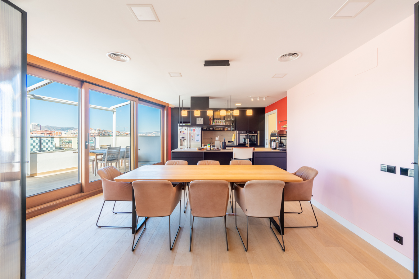 La lumière naturelle envahit la pièce grâce aux grandes fenêtres, qui donnent accès à la fantastique terrasse offrant des vues panoramiques sur la ville. C’est l’endroit idéal pour organiser des réunions en plein air, prendre des repas ou simplement se détendre.