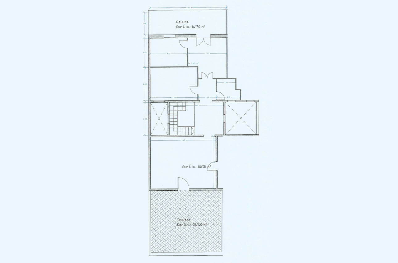 L’étage supérieur dispose de 89 m² construits intérieurs et de deux terrasses. Il est parfait pour accueillir un spectaculaire espace de jour occupant toute la surface, intégrant salon, salle à manger et cuisine. La première terrasse, de 34 m², bénéficie de la meilleure orientation possible (sud-est), avec le soleil pratiquement toute la journée, et donne sur la rue Casp. Elle possède actuellement une fermeture qui pourrait être conservée. La deuxième terrasse, de 20 m², donne sur la cour intérieure et offre une vue sur le Tibidabo. Il s’agit actuellement d’une galerie fermée, qui pourrait être ouverte.