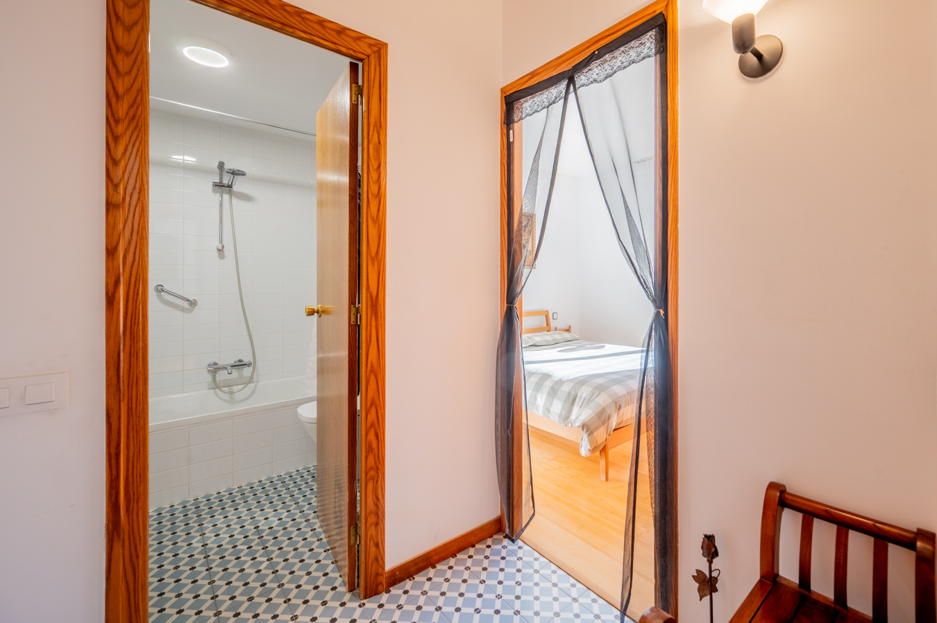 Dans la partie nuit, une autre cour intérieure garantit la lumière naturelle et la ventilation. Il y a 4 chambres, dont une en suite avec accès à la terrasse, salle de bain privée et placards intégrés, et une autre salle de bain indépendante.