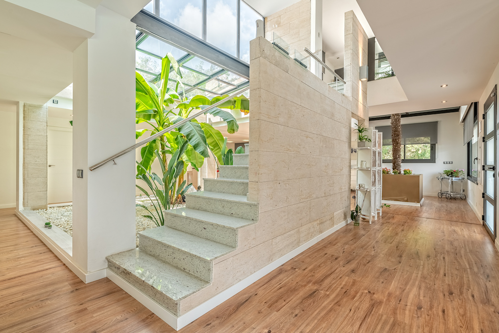 Cette propriété de 637 m2 est située sur un terrain plat de 1392m2 avec piscine chauffée. La maison a un style moderne-fonctionnel, avec des façades en marbre travertin et jouit d’une grande luminosité.