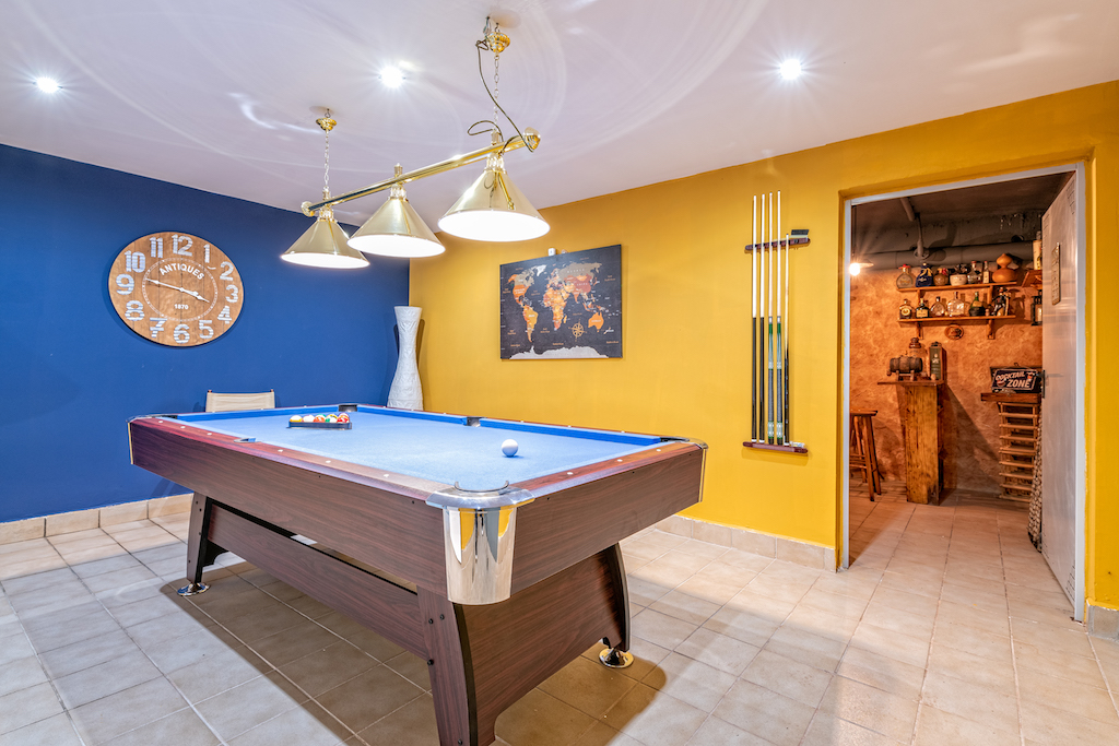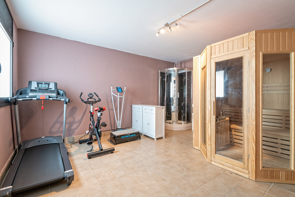 Il se répartit comme suit : Sous-sol : garage pour 5-6 voitures, atelier, salle de gym, sauna, douche et salle de bain, billard et cave. Rez-de-chaussée : salon-salle à manger, cuisine, toilettes, terrasses, sortie à la piscine chauffée avec chute d’eau et 2 suites complètes avec salles de bains. Et l’étage supérieur dispose d’un coin bureau, d’une suite spacieuse et de terrasses très spacieuses.