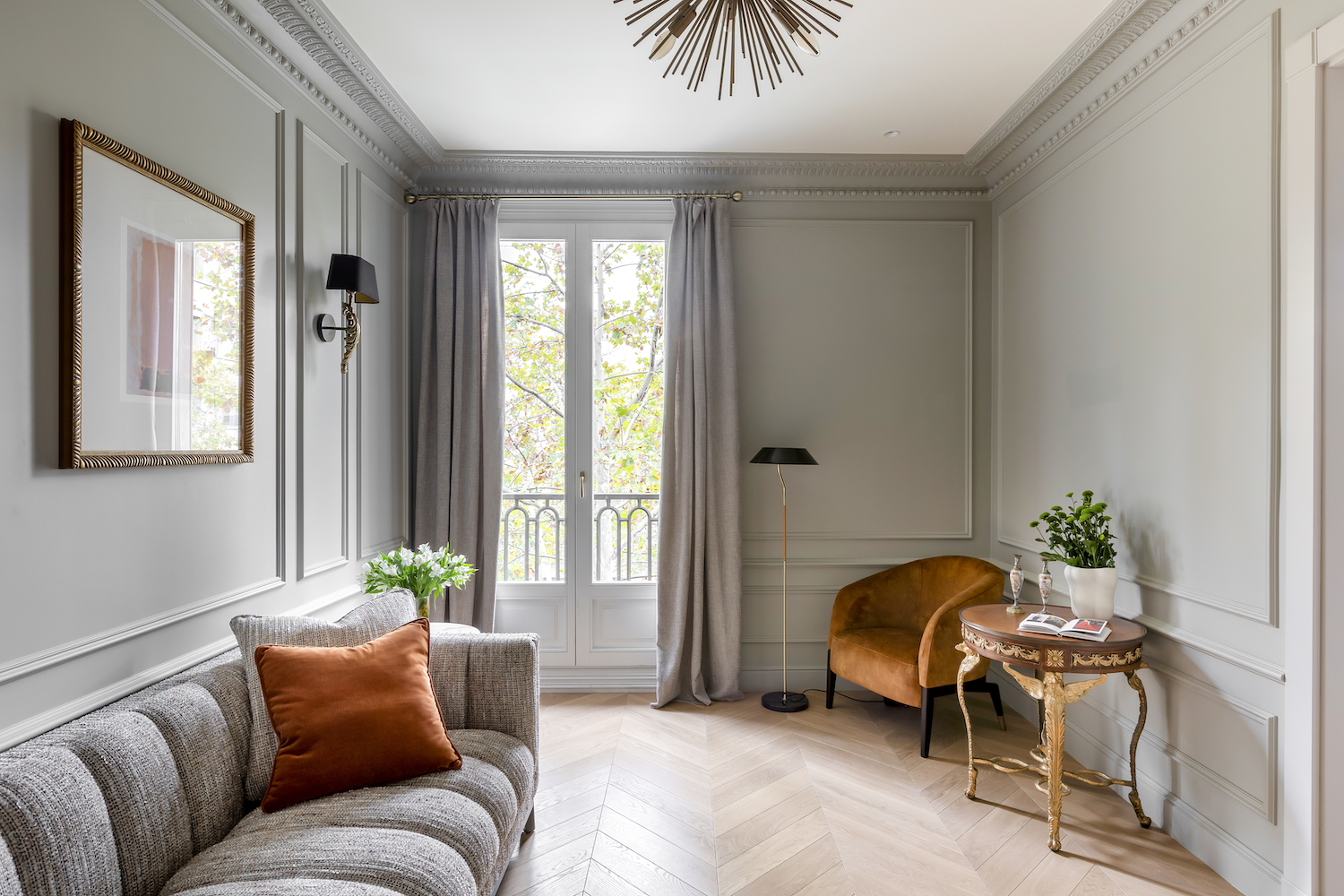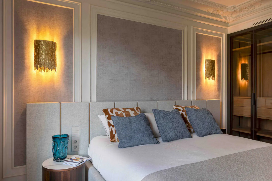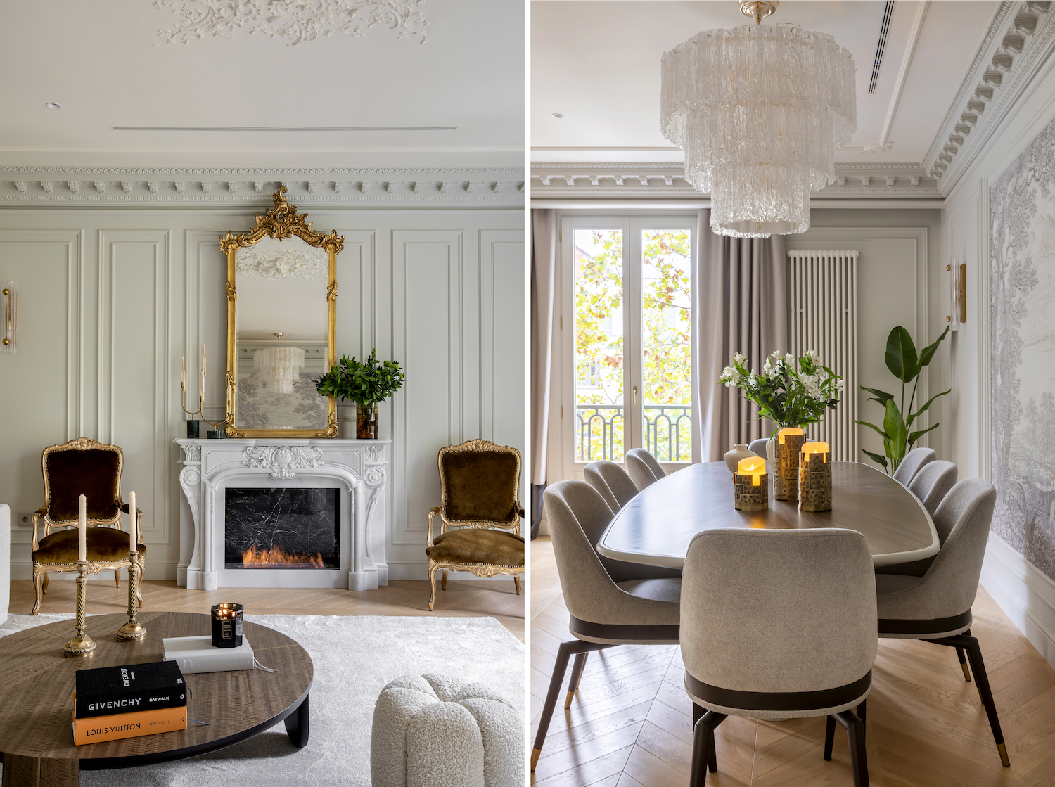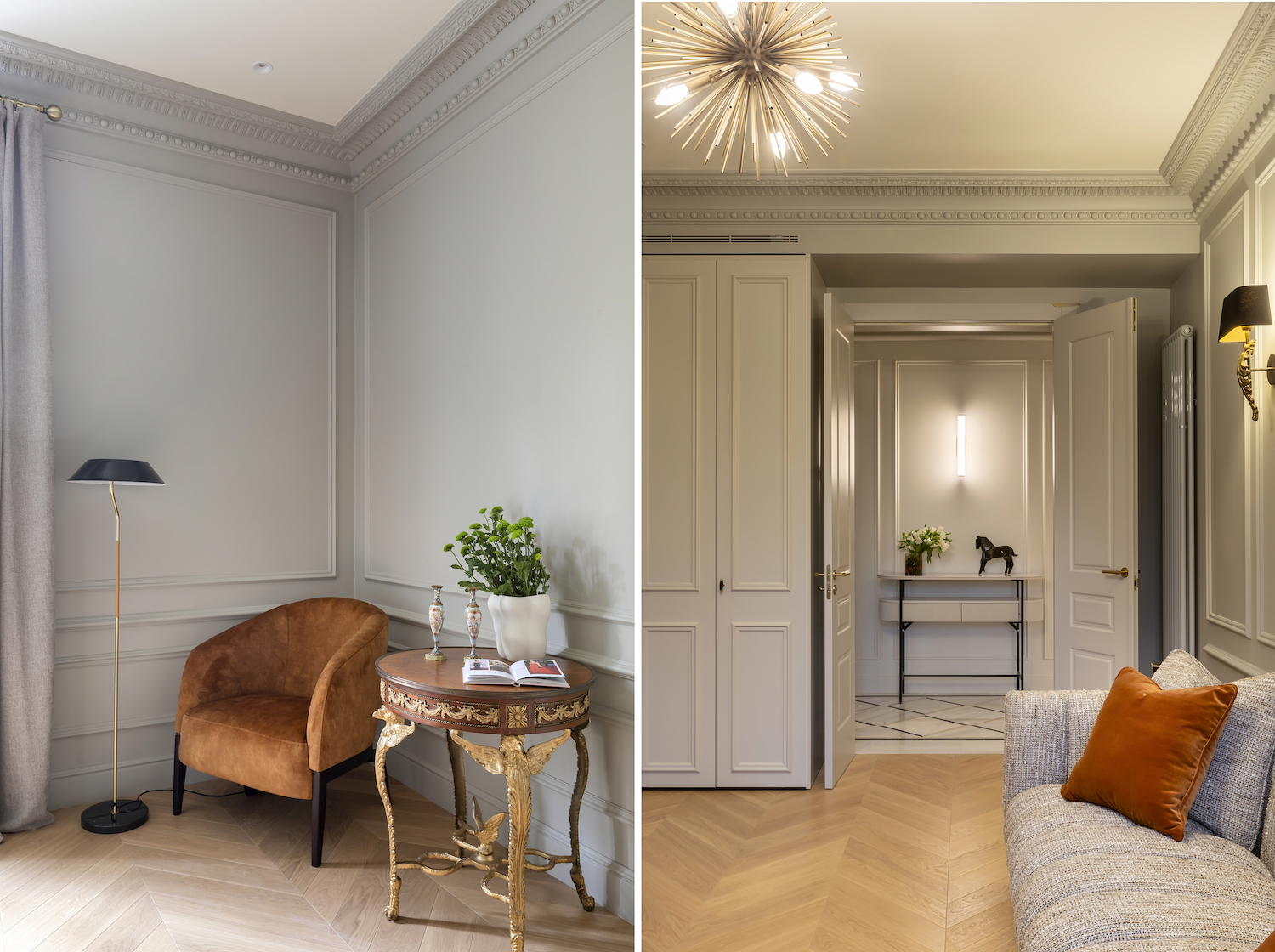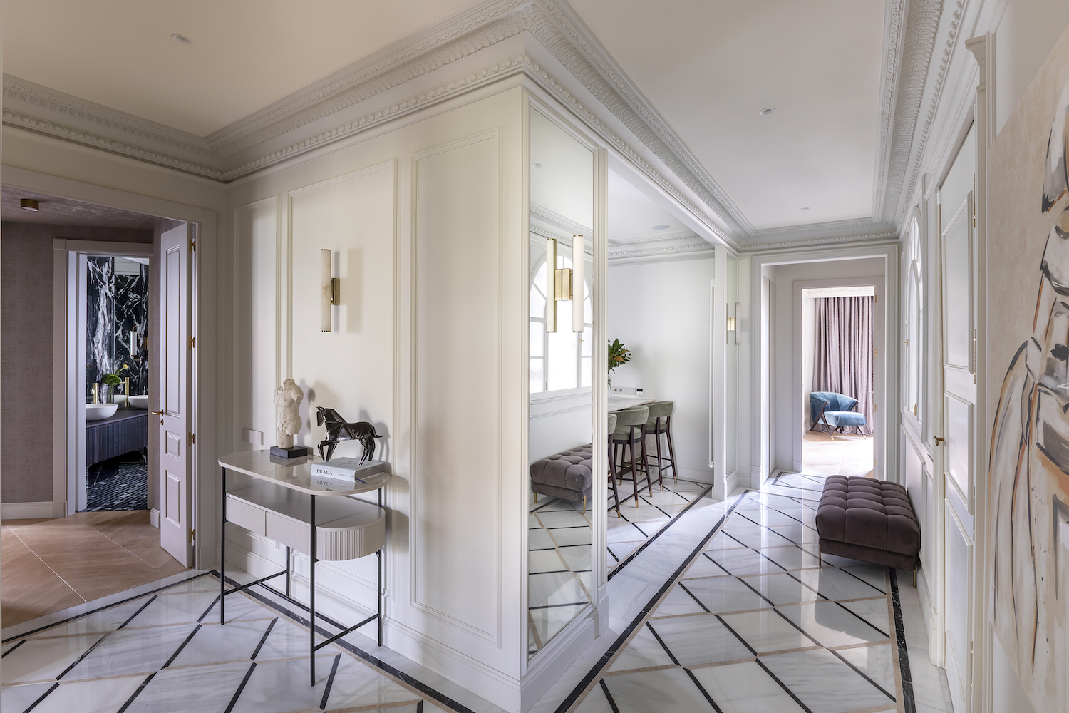 Chaque détail a été soigneusement sélectionné pour apporter exclusivité et sophistication : planchers en chêne à chevrons français, moulures en plâtre fabriquées à la main, marbre naturel et mobilier design sur mesure. L’éclairage indirect met en valeur les plafonds de 3 mètres de haut, créant une atmosphère chaleureuse et enveloppante.