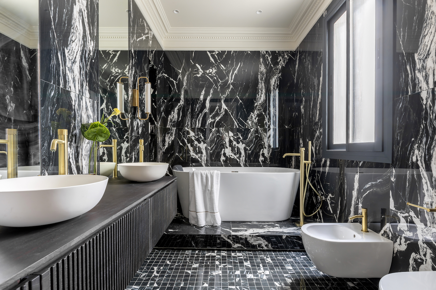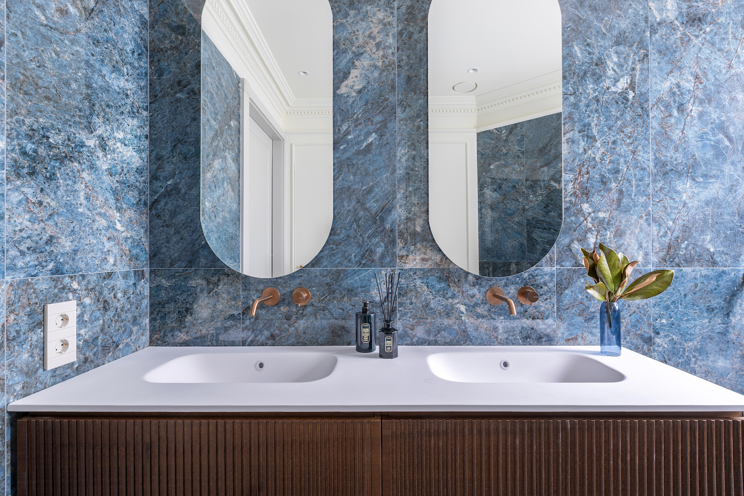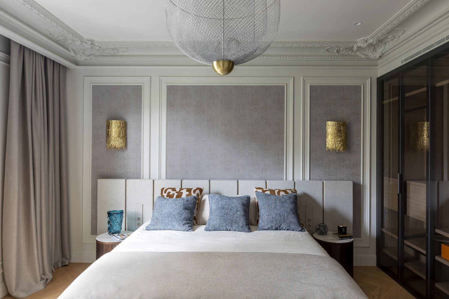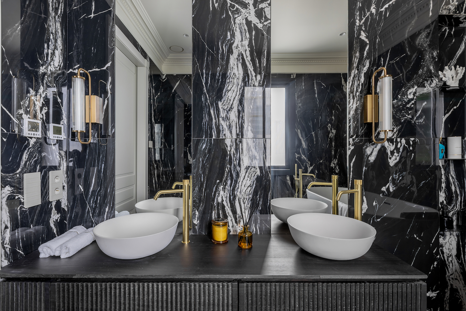 Chaque détail a été soigneusement sélectionné pour apporter exclusivité et sophistication : planchers en chêne à chevrons français, moulures en plâtre fabriquées à la main, marbre naturel et mobilier design sur mesure. L’éclairage indirect met en valeur les plafonds de 3 mètres de haut, créant une atmosphère chaleureuse et enveloppante.