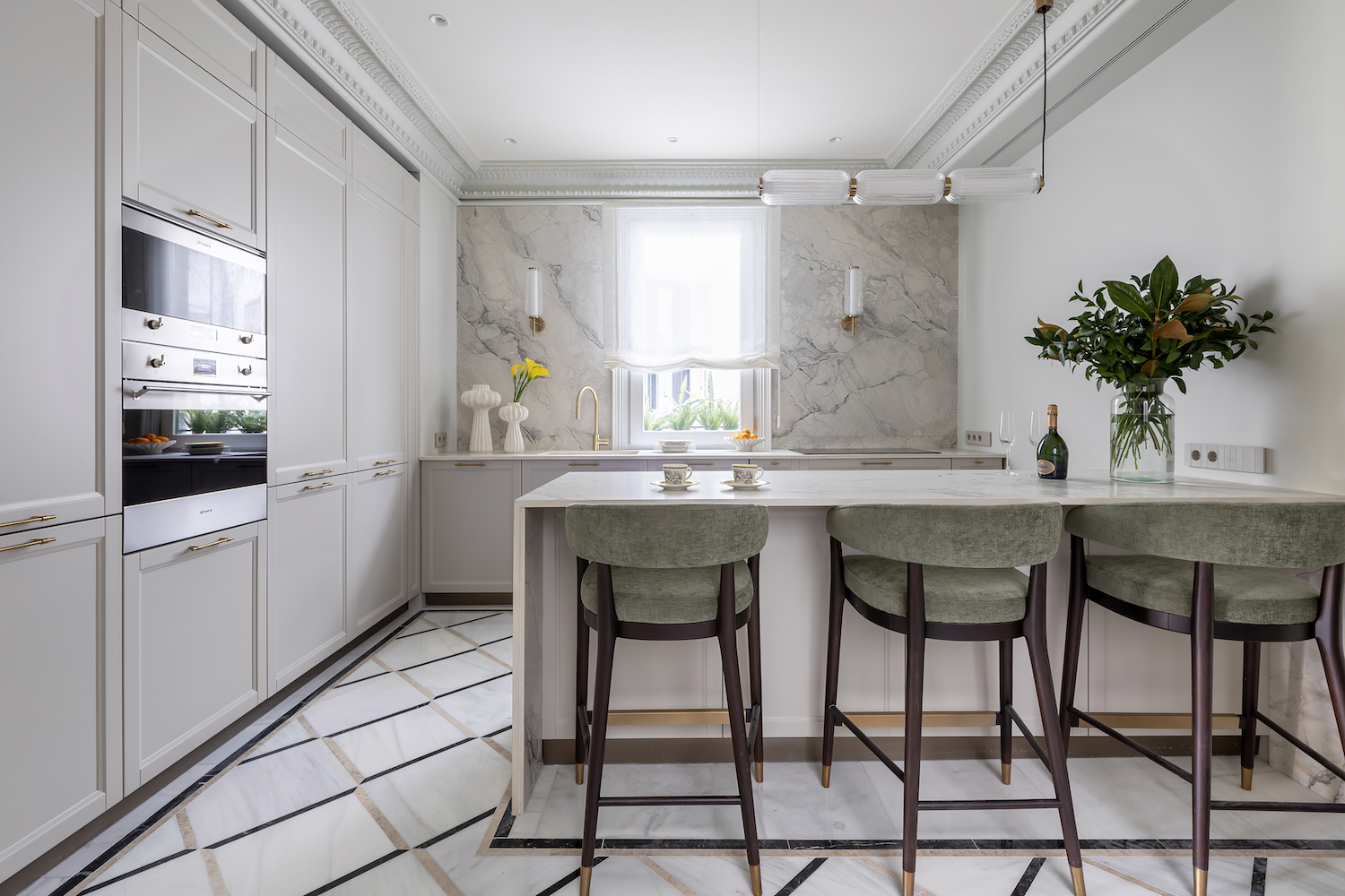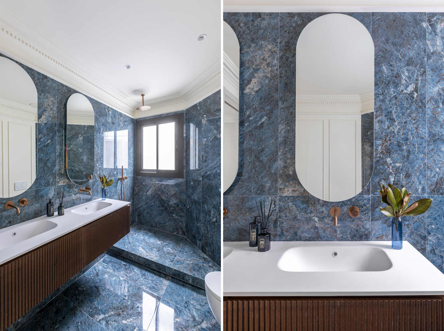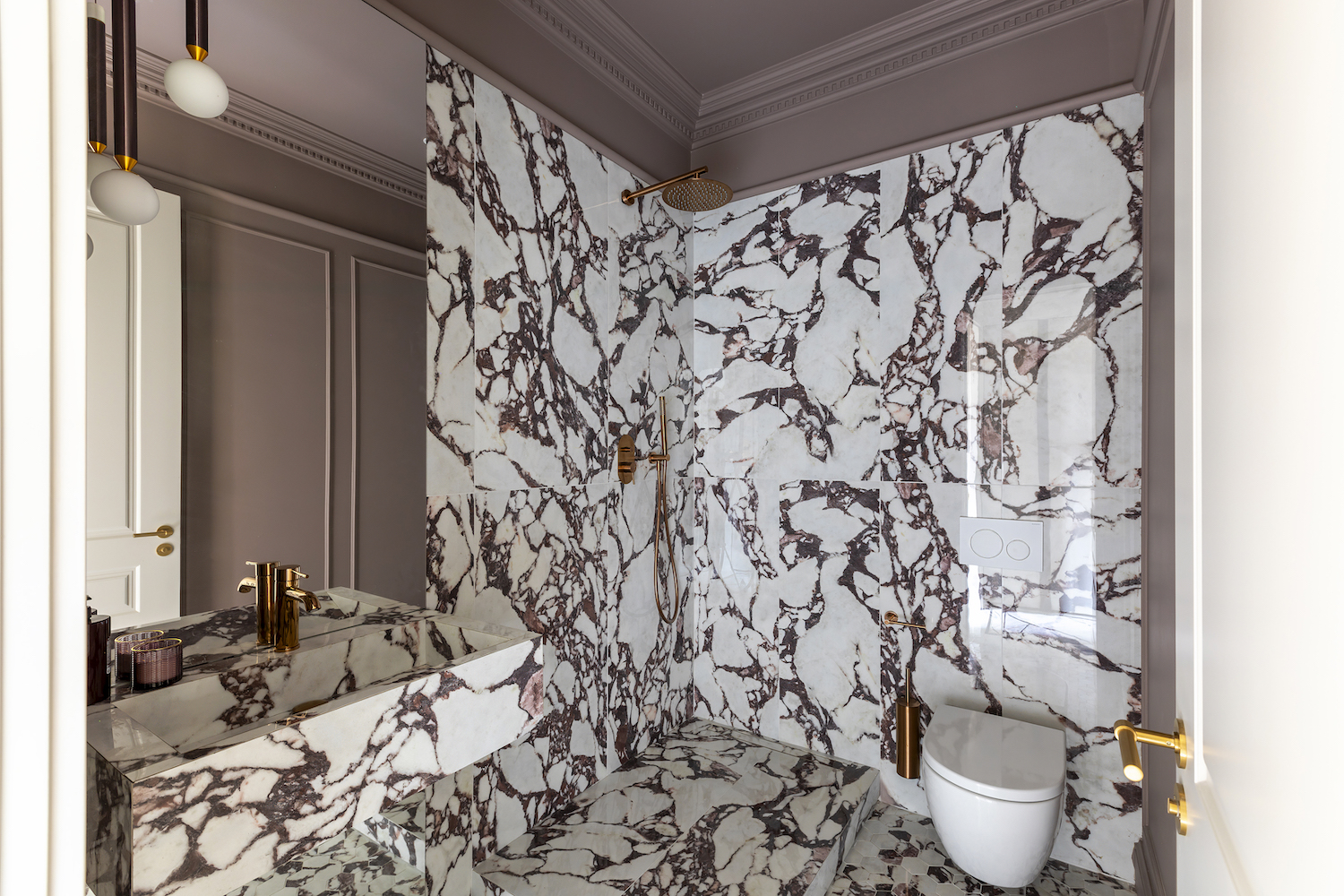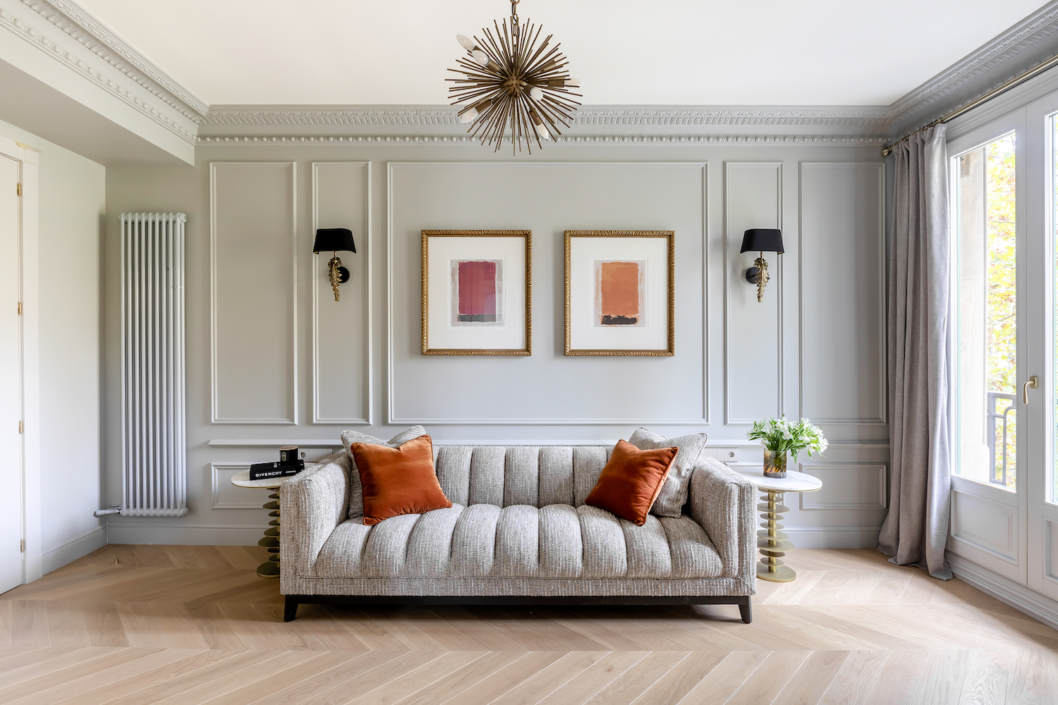 Chaque détail a été soigneusement sélectionné pour apporter exclusivité et sophistication : planchers en chêne à chevrons français, moulures en plâtre fabriquées à la main, marbre naturel et mobilier design sur mesure. L’éclairage indirect met en valeur les plafonds de 3 mètres de haut, créant une atmosphère chaleureuse et enveloppante.
