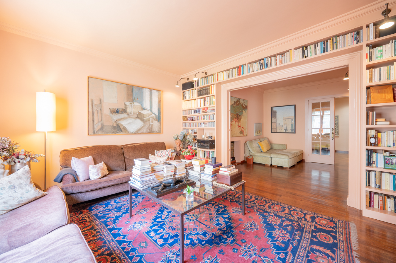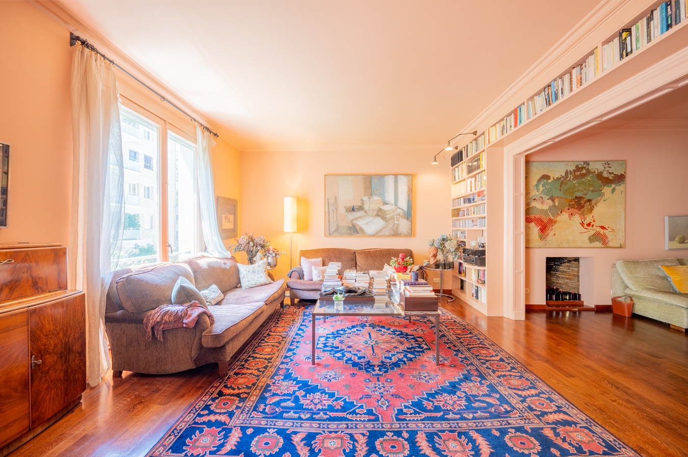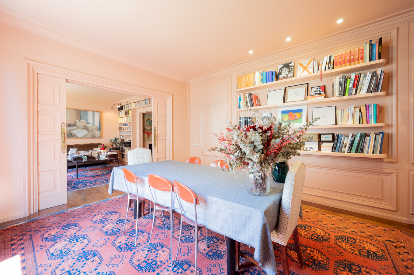 Un amplio recibidor da acceso a la zona de día, donde encontramos en primer lugar una acogedora sala de estar con librería integrada y chimenea. A continuación, se abre un luminoso salón orientado al suroeste, con excelente entrada de luz natural. El salón conecta con un elegante comedor independiente, que puede separarse mediante puertas correderas, ofreciendo flexibilidad para reuniones formales o un concepto más abierto.