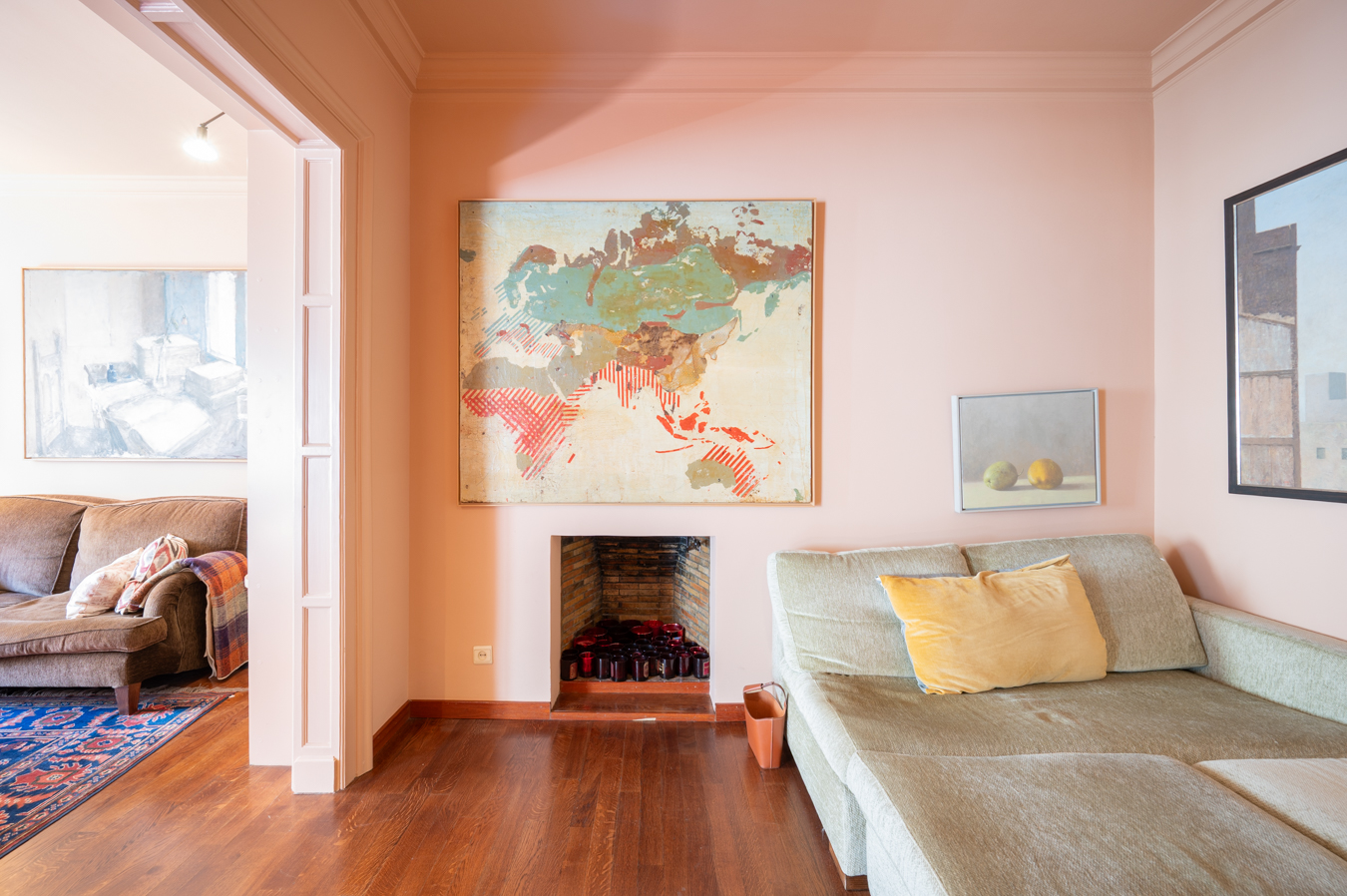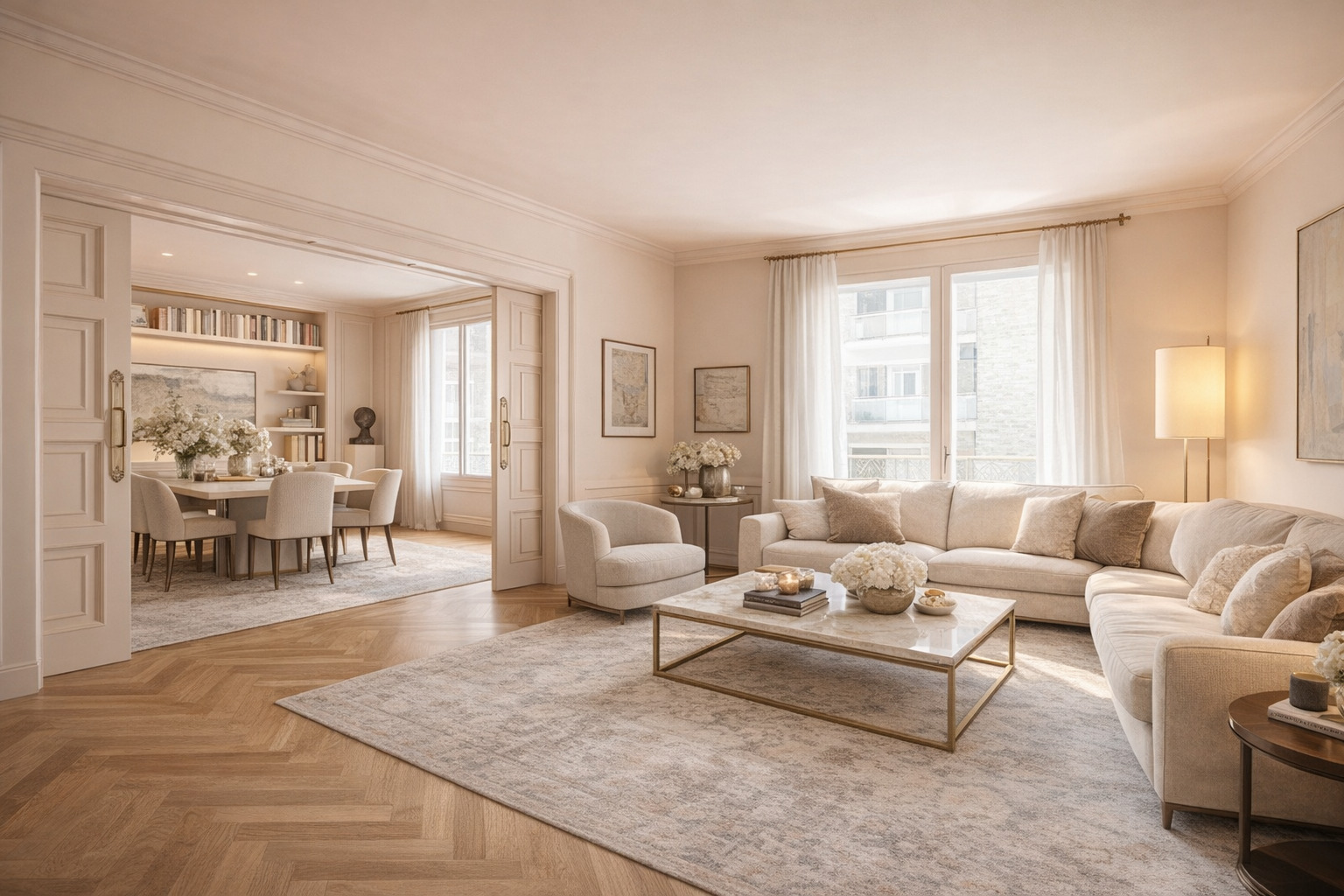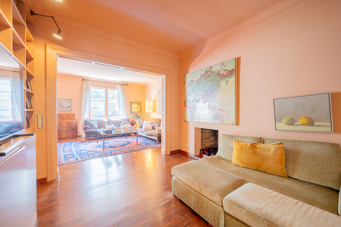 Un amplio recibidor da acceso a la zona de día, donde encontramos en primer lugar una acogedora sala de estar con librería integrada y chimenea. A continuación, se abre un luminoso salón orientado al suroeste, con excelente entrada de luz natural. El salón conecta con un elegante comedor independiente, que puede separarse mediante puertas correderas, ofreciendo flexibilidad para reuniones formales o un concepto más abierto.