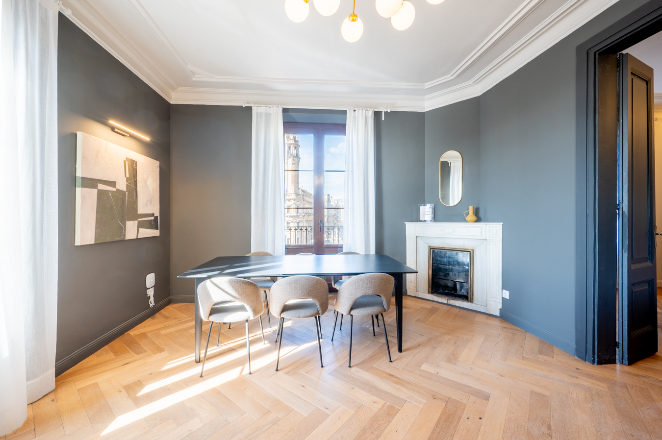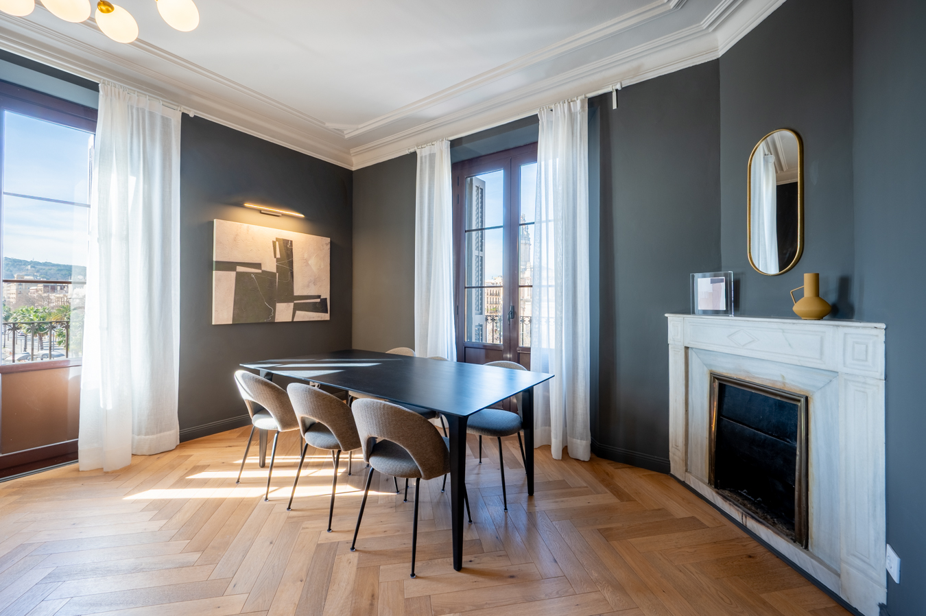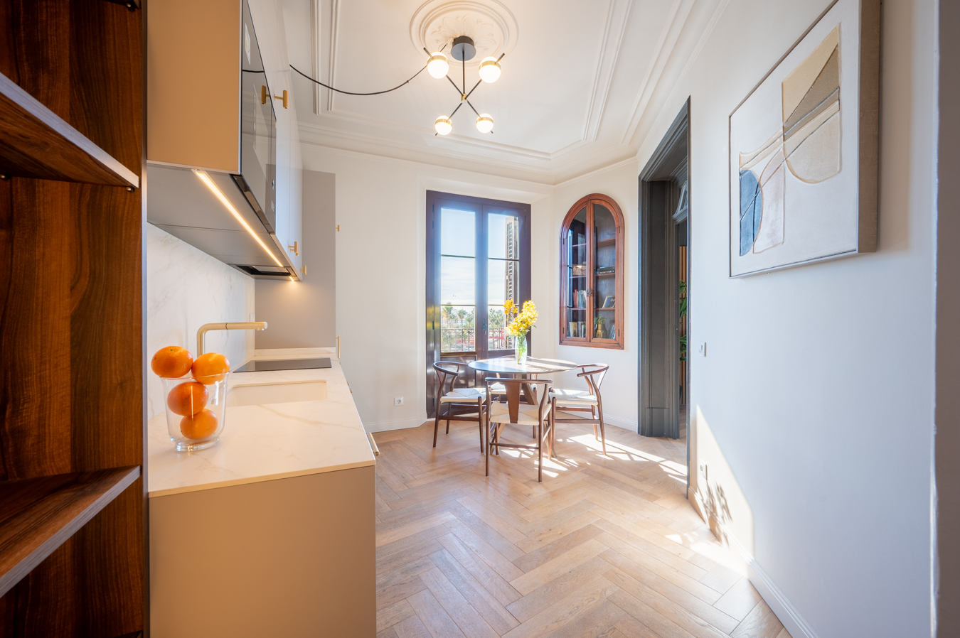 Este excepcional piso se sitúa en la calle Casanova, a escasos metros de la recientemente peatonalizada Consell de Cent, una de las arterias más atractivas y cotizadas del Eixample. Está rodeada de zonas verdes, cafeterías y una cuidada oferta gastronómica. Una ubicación que combina a la perfección la calma de un entorno residencial con la energía vibrante del centro de Barcelona. La vivienda está en la primera planta de una finca regia con ascensor. Tiene 130 m2 construidos interiores y una terraza de 25 m2. La distribución es cómoda y funcional. Un amplio salón con acceso a una terraza orientada al este se convierte en el corazón de la vivienda, acompañado por una cocina semiabierta con zona de comedor y salida a un segundo patio que incorpora espacio de lavadero. La terraza, con suelo de madera natural, es un oasis de tranquilidad en pleno centro. La zona de noche ofrece una generosa suite principal de más de 20 m² con baño privado, además de dos dormitorios dobles que comparten un baño completo. En la entrada se dispone también un aseo de cortesía. Todas las habitaciones cuentan con armarios empotrados a medida que optimizan el almacenamiento. La vivienda ha sido totalmente renovada, respetando y poniendo en valor los elementos originales, que conviven con acabados contemporáneos de alta calidad. Destacan los techos altos de 3,4 metros con bóveda catalana, las molduras decorativas, los suelos hidráulicos originales recuperados combinados con parquet natural en espiga y los amplios ventanales que garantizan una excelente entrada de luz durante todo el día. La propiedad ha sido equipada con nuevas carpinterías de doble acristalamiento, lo que garantiza un excelente aislamiento térmico y acústico, aportando confort y tranquilidad en pleno centro urbano. En las inmediaciones hay un parking con plazas de alquiler disponibles. Una vivienda lista para entrar a vivir que combina carácter histórico, diseño contemporáneo y una ubicación privilegiada en una de las zonas más demandadas de Barcelona.