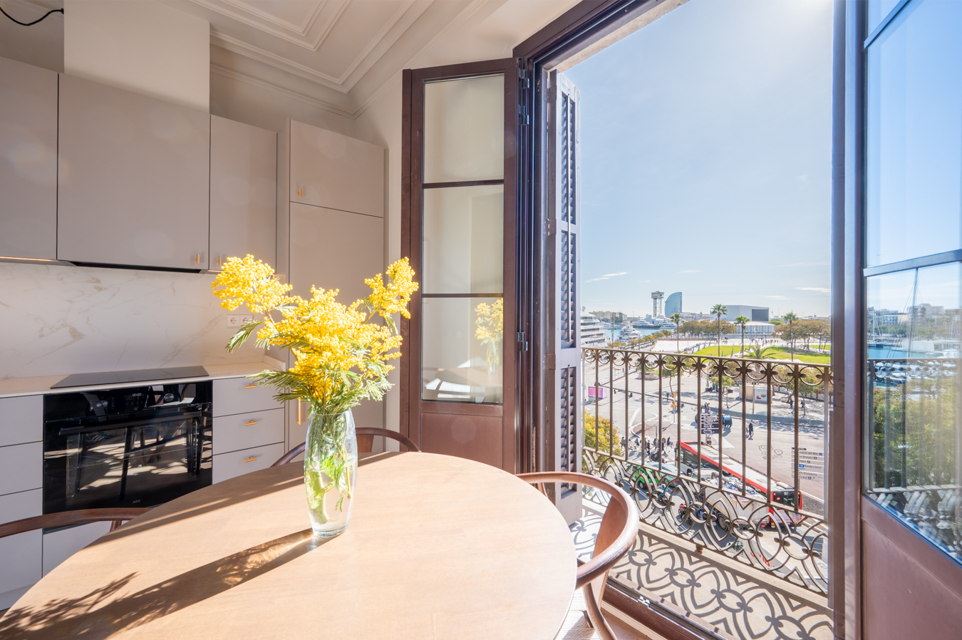 La vivienda cuenta con 114 m2 construidos interiores. Se sitúa en la cuarta planta real y es totalmente exterior, lo que le aporta una magnífica luminosidad. El salón-comedor con chimenea, cálido y acogedor, disfruta de abundante luz natural y salida a un balcón con agradables vistas al Paseo, al Moll de la Fusta y al mar. La cocina, funcional y perfectamente equipada, se integra con personalidad propia en la zona de día y tiene un balcón. La zona de noche se compone de 2 dormitorios dobles con balcón y armarios empotrados, y 2cuartos de baño independientes.