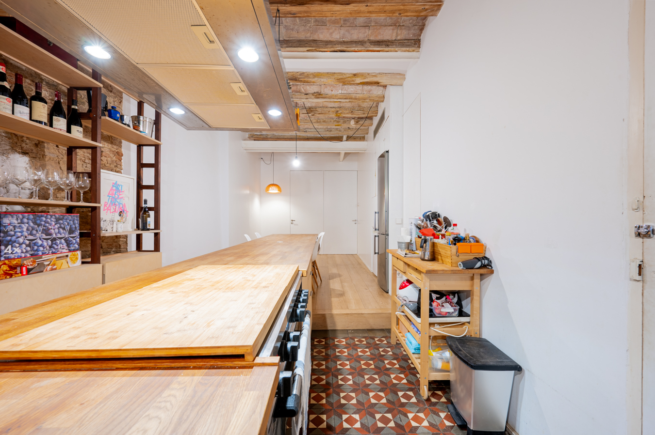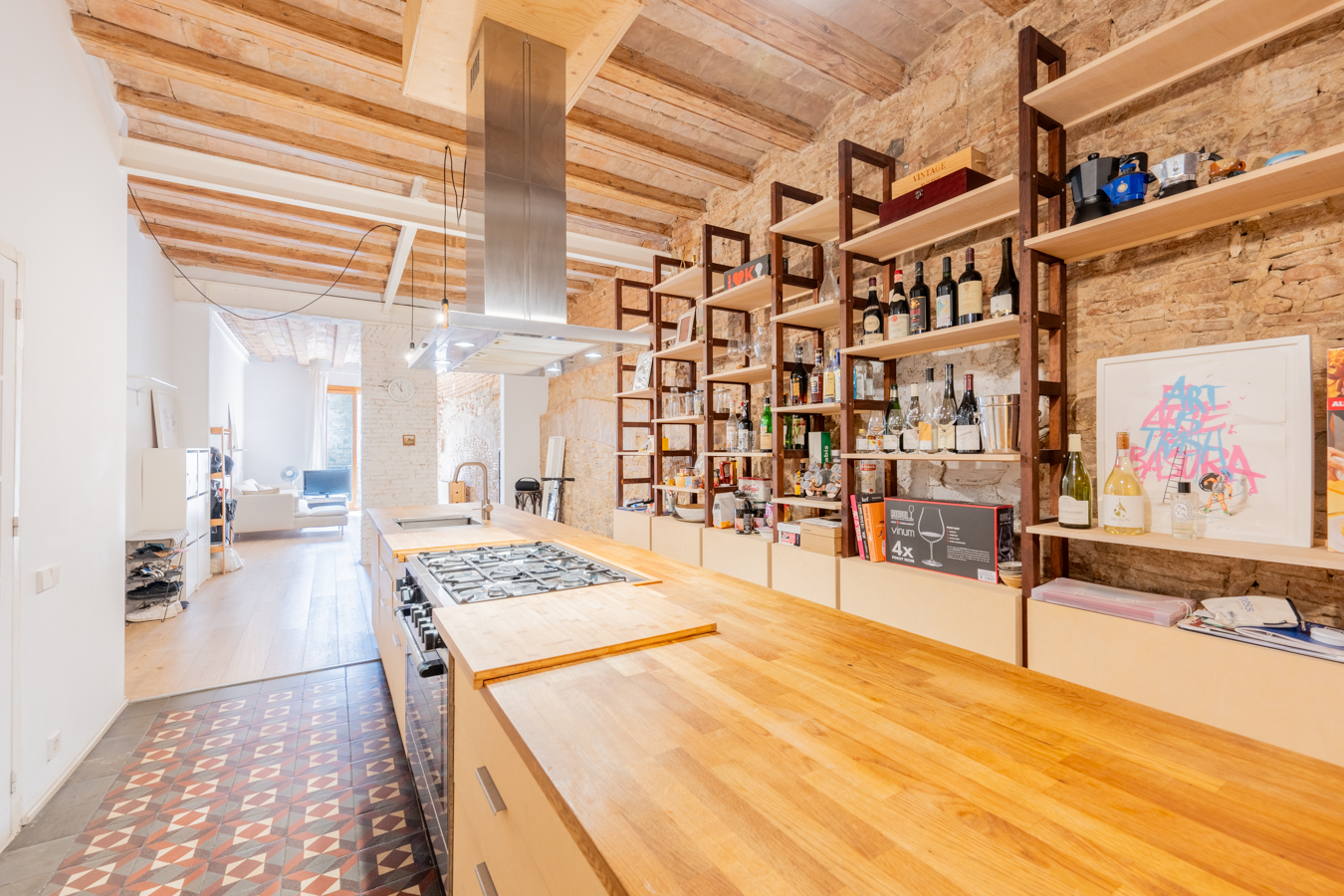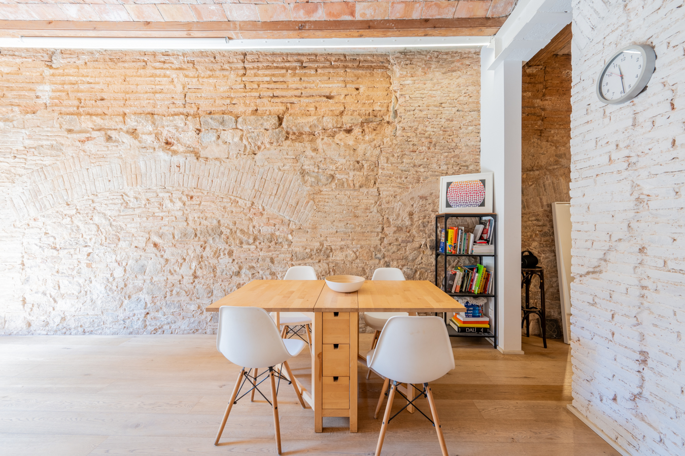 El salón es muy luminoso, dispone de un balcón que da la calle y presenta detalles exquisitos como pared romana y techo de volta catalana. La amplia cocina es abierta pero ocupa un espacio diferenciado, y está equipada con electrodomésticos.