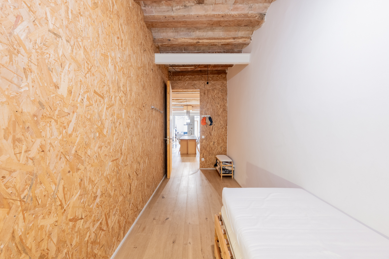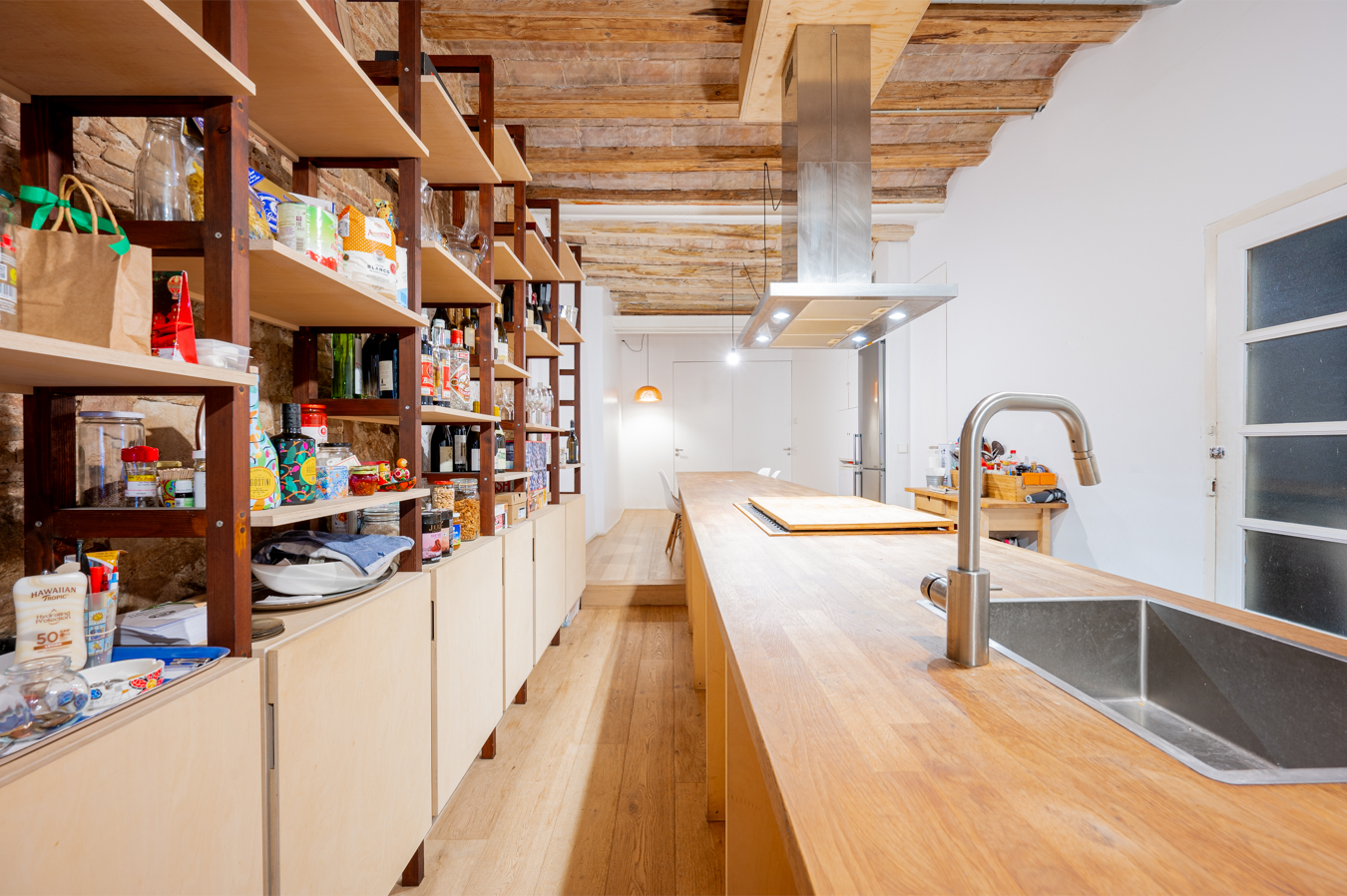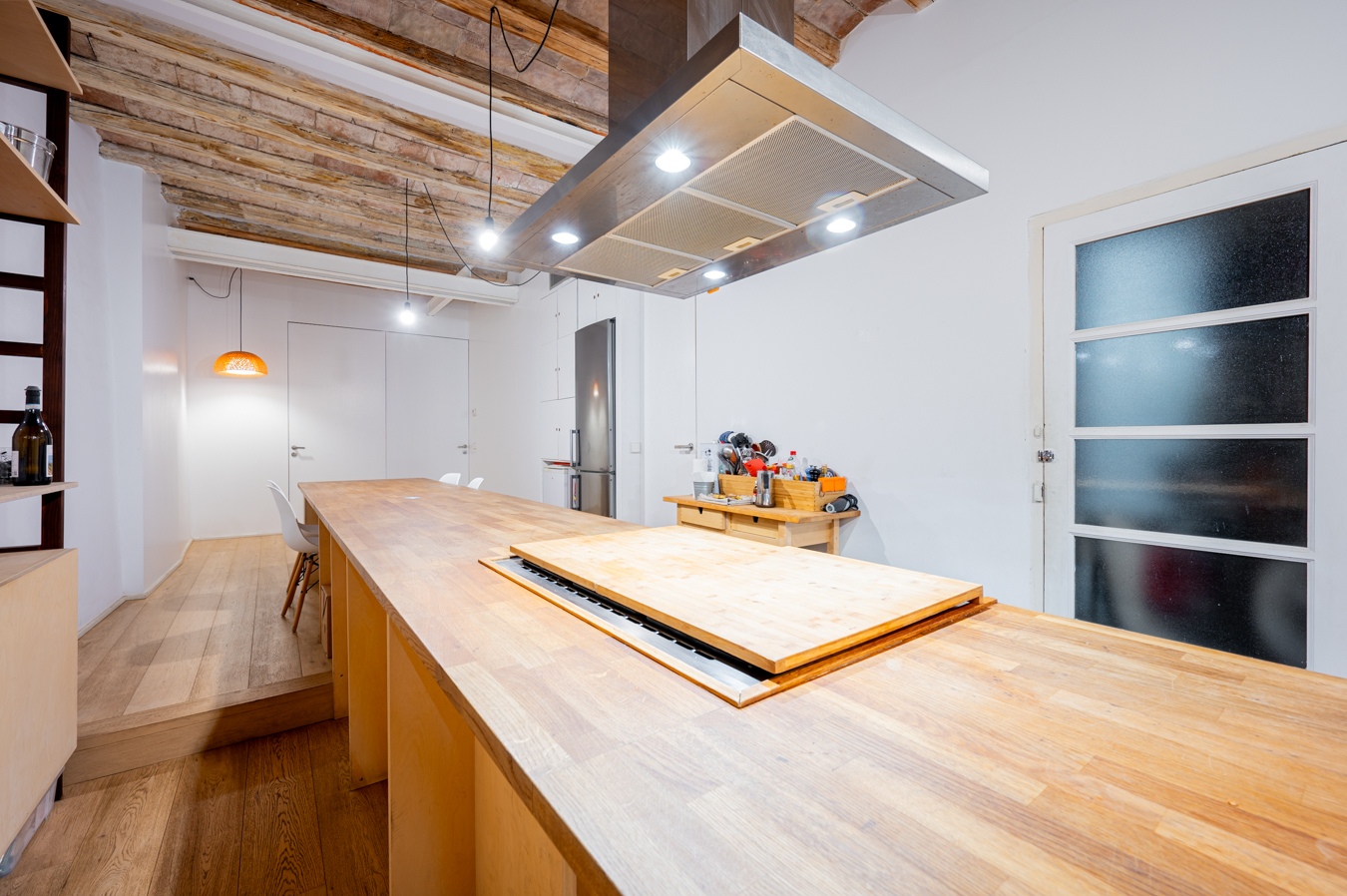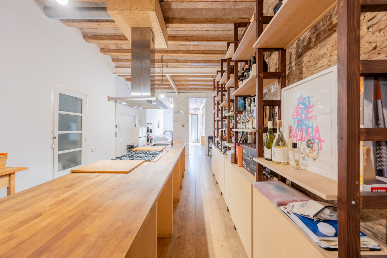 El salón es muy luminoso, dispone de un balcón que da la calle y presenta detalles exquisitos como pared romana y techo de volta catalana. La amplia cocina es abierta pero ocupa un espacio diferenciado, y está equipada con electrodomésticos.