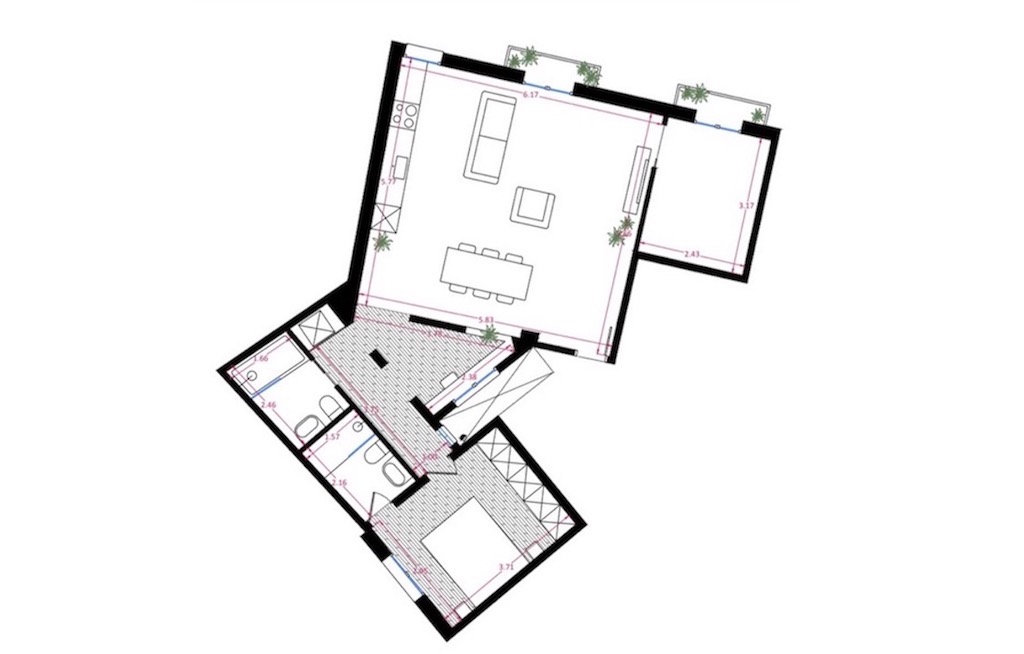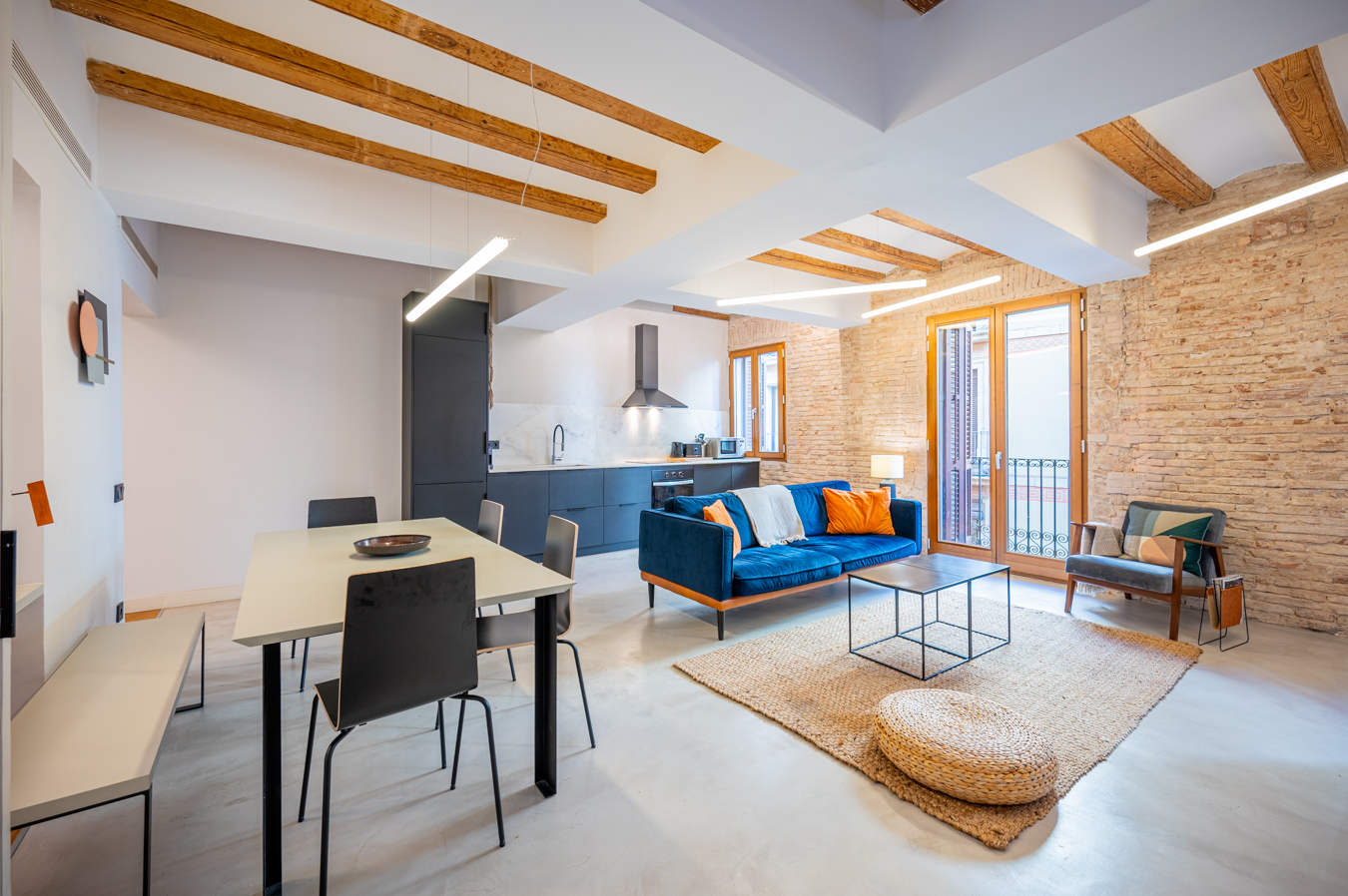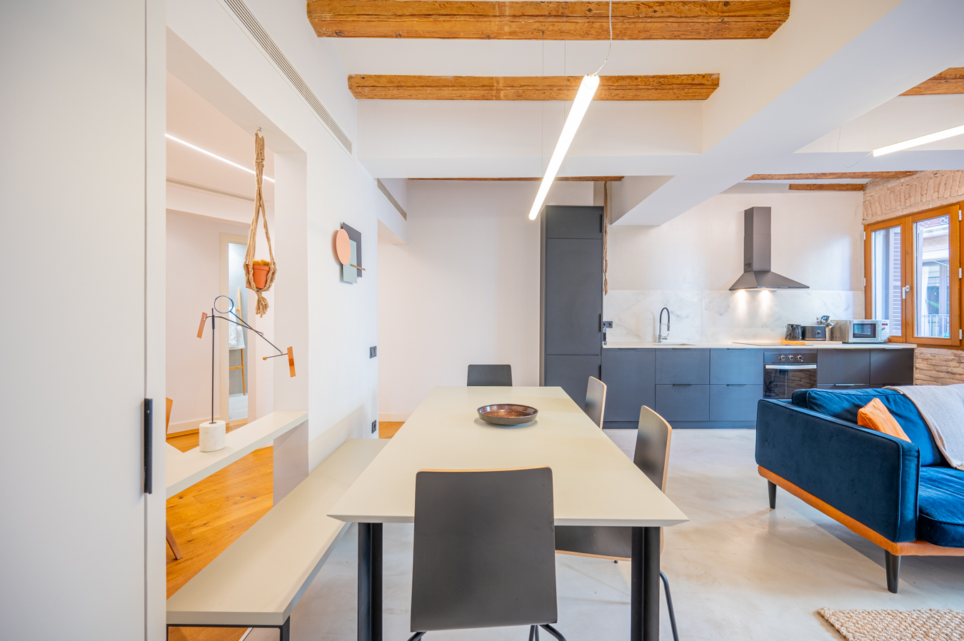 Esta vivienda, reformada en 2019, está en la tercera planta real y el edificio tiene ascensor. Destaca por sus líneas modernas y sencillas con detalles tradicionales de su construcción original como techos altos, vigas de madera y ventanas amplias, así como ciertas paredes de ladrillo original restaurado.