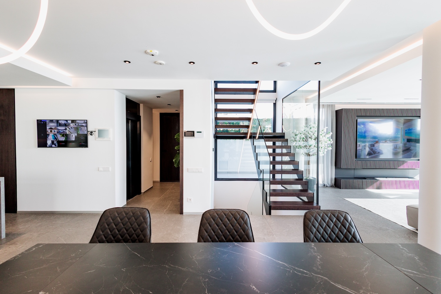 La tecnología es protagonista en toda la vivienda, que está completamente automatizada, con cortinas automáticas, sistemas avanzados de filtración de agua y un completo sistema de seguridad con cámaras y sensores. Para garantizar eficiencia energética, incorpora 16 paneles solares de gran tamaño.