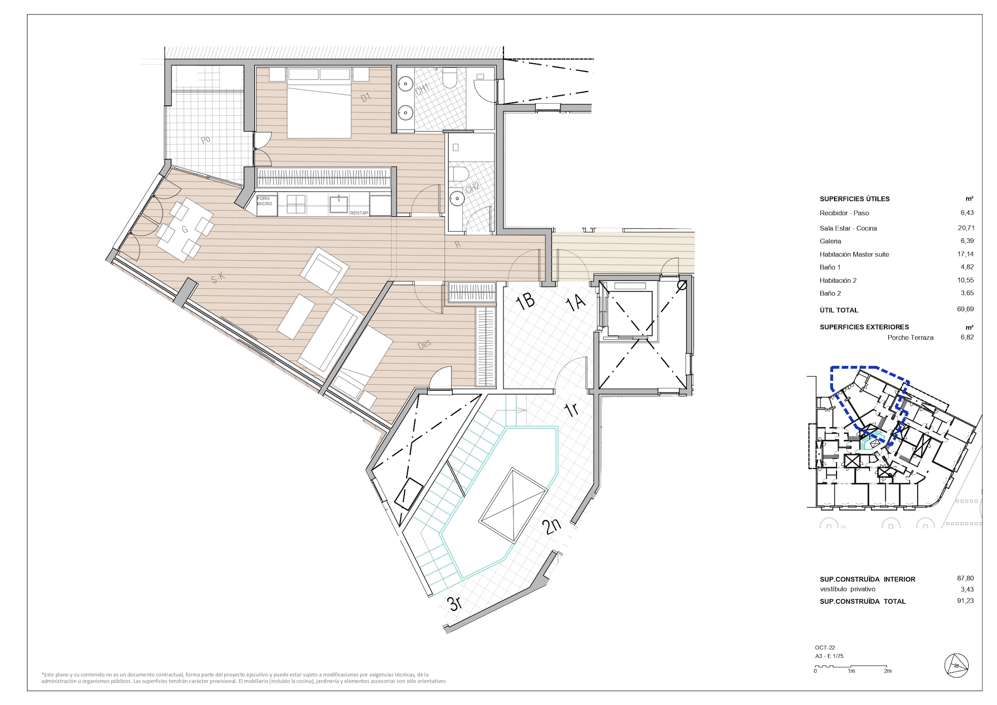 Este apartamento, situado en la 5ª planta real, tiene 87,8 m2 construidos interiores y un porche terraza de 6,8 m2. Un vestíbulo da paso al recibidor, que nos conduce al amplio salón-comedor de 23 m2 con cocina abierta totalmente equipada, que es muy luminoso y tranquilo, ya que está orientado al patio interior de manzana. Junto a él hay un espacio de galería, ideal para crear un ambiente diferenciado y más relajado.