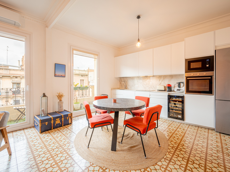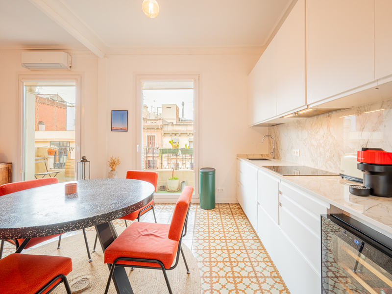 Este fantástico piso con mucha luz natural se encuentra en la 6ª y última planta de una finca regia en una localización ideal del Eixample, a pocos minutos tanto de Plaza Universitat como de Plaza Espanya. Los alrededores disponen de numerosos servicios, tiendas de barrio, centros comerciales, bares, restaurantes, opciones de ocio y excelente comunicación mediante la línea 1 del metro y autobuses. Este ático es extremadamente tranquilo, ya que da al patio de manzana, y luminoso, al ser la última planta. Tiene 98 m2 construidos según Catastro y un balcón de 1,7 m2. Fue totalmente reformado con acabados de alto nivel y manteniendo elementos originales como suelos hidráulicos restaurados, techos con molduras y rosetones, y carpintería restaurada con doble cristal. Además, la reforma incluyó instalaciones eléctricas y de fontanería totalmente nuevas. La zona de día es muy amplia: consta de un salón con cocina abierta e isla central, una zona de galería abierta donde se ubica la mesa de comedor y un balcón que da al patio de manzana, con vistas a la montaña y espacio para mesita y dos sillas de desayuno. La zona de noche dispone de 3 habitaciones interiores muy tranquilas y a la vez luminosas al estar en la última planta: una en suite con cuarto de baño propio, una doble y una mediana. Por último, hay un segundo cuarto de baño independiente. El piso está equipado con materiales y acabados premium como cocina Santos, placa de inducción con extractor integrado BORA, resto de electrodomésticos marca Siemens, sistema de osmosis, aire acondicionado frío/calor por splits marca Daikin y luces regulables. El edificio tiene ascensor y conserje. Se trata de una oportunidad fantástica para vivir en un hogar con carácter en una de las mejores zonas de Barcelona. No dudes en contactar con Bcn Advisors para visitar este ático.