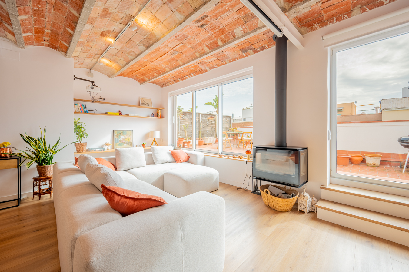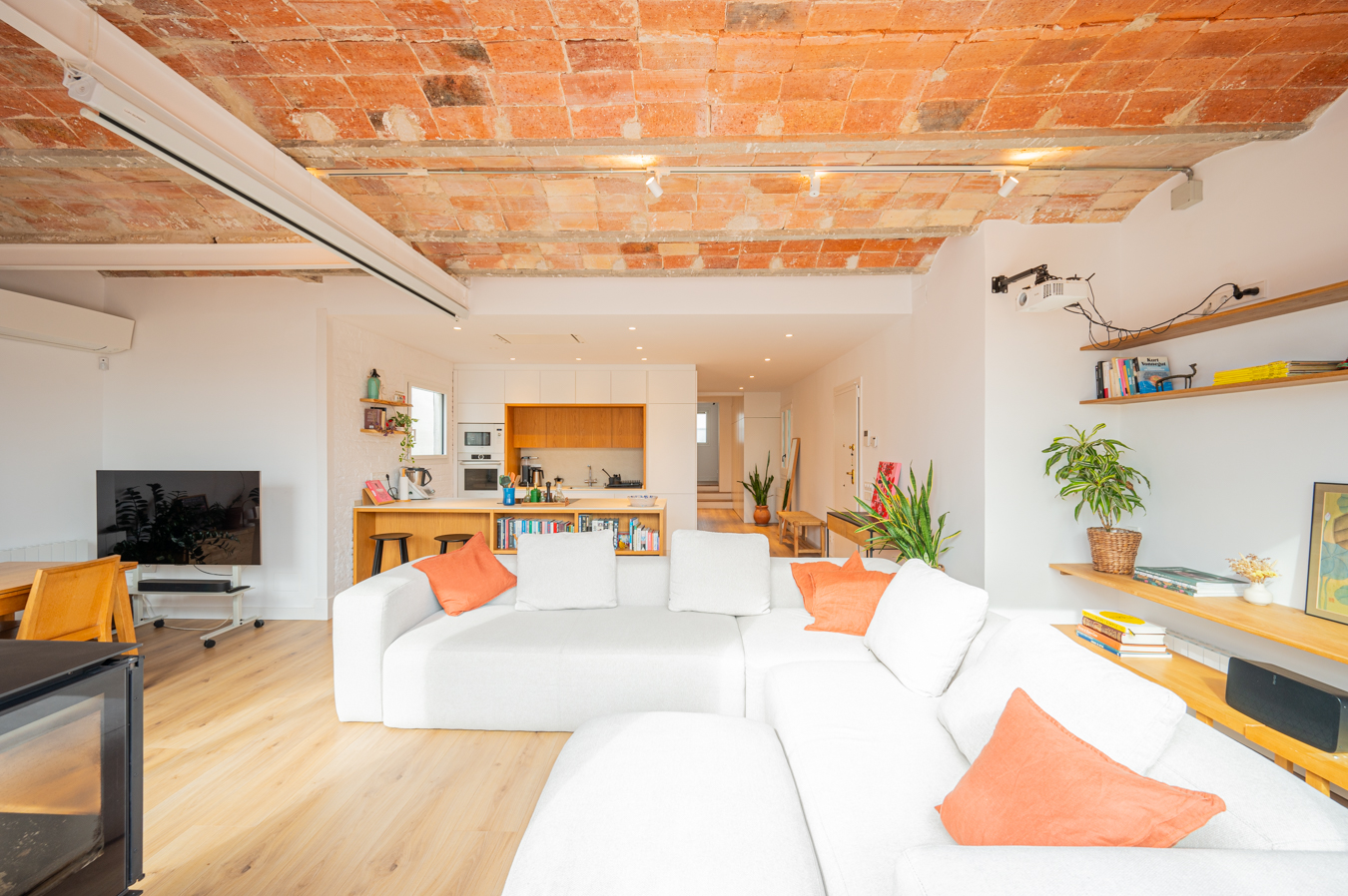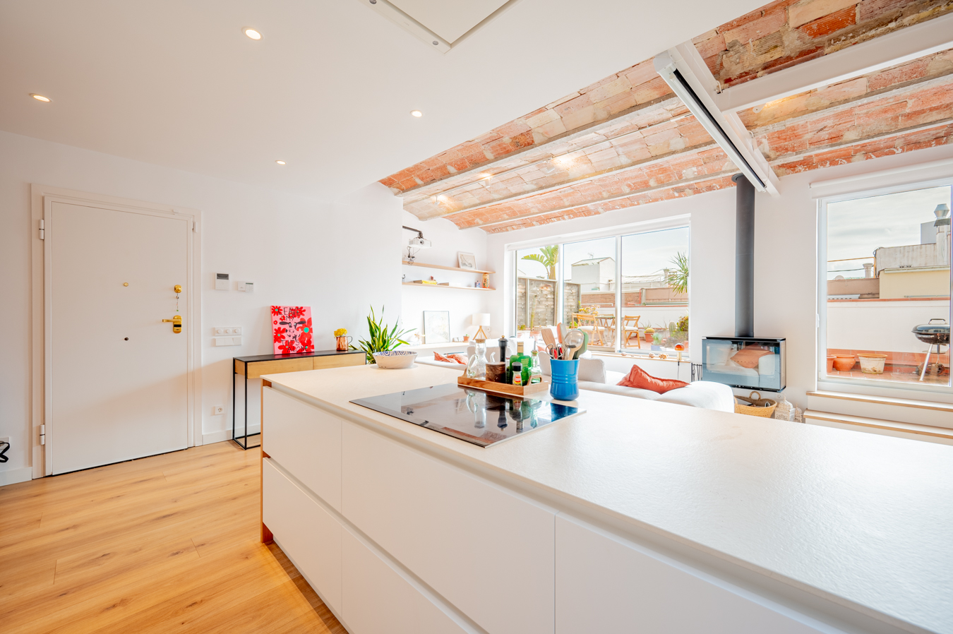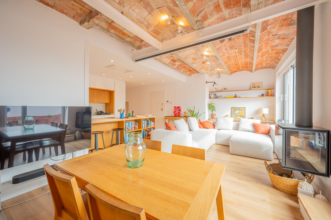 La entrada nos lleva directamente a la amplia zona de día, formada por un salón-comedor con cocina abierta e isla central. El ambiente es muy acogedor y lleno de vida con gran luminosidad, además del toque excelente de la volta catalana en los techos y una chimenea que aporta calidez y distinción. Desde el salón accedemos a la terraza, orientada hacia el mar. Es el lugar perfecto para celebrar animadas comidas y reuniones con familia y amigos, o simplemente descansar en el agradable clima de Barcelona.