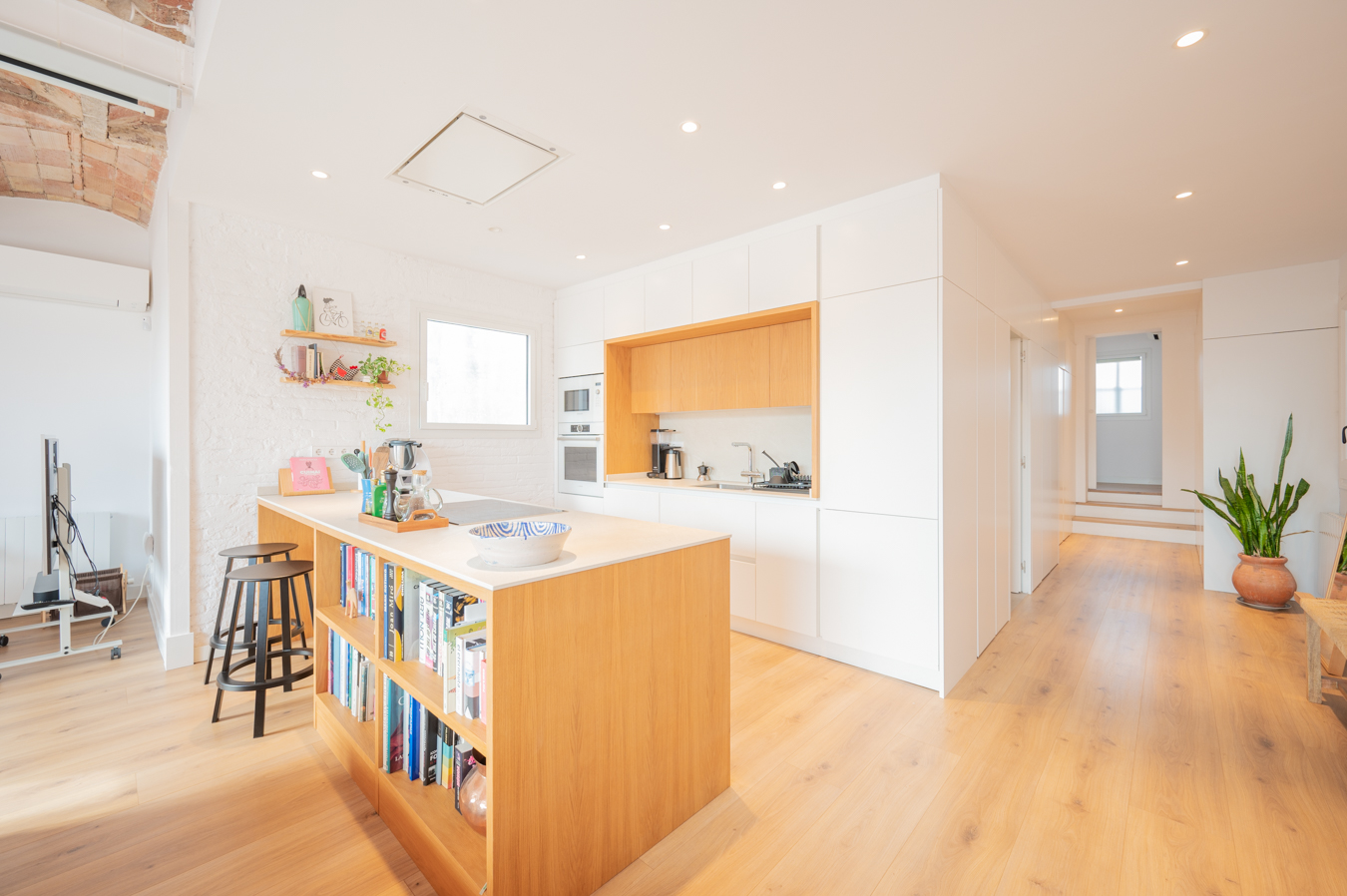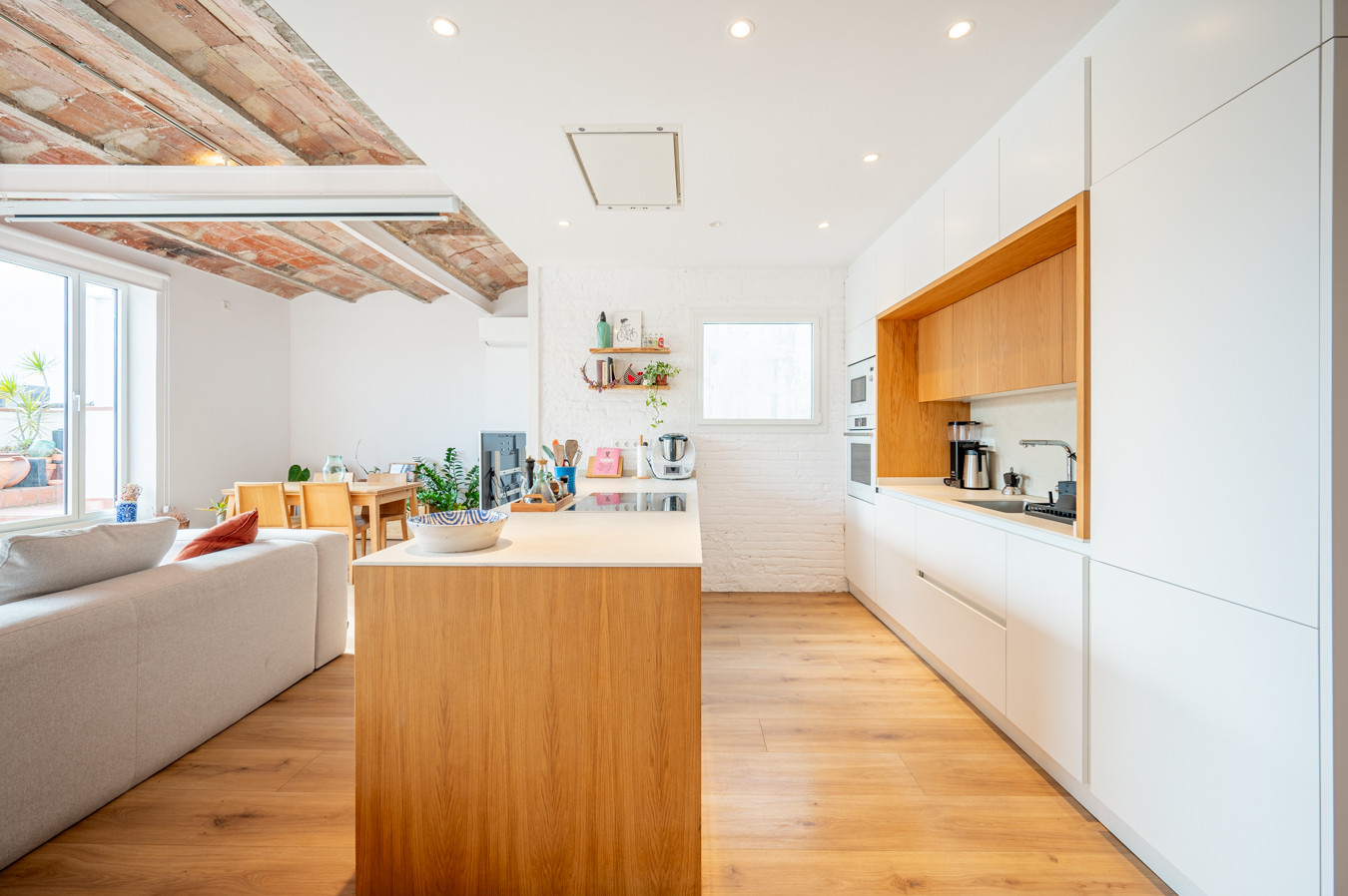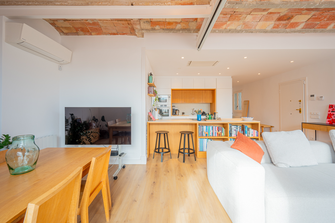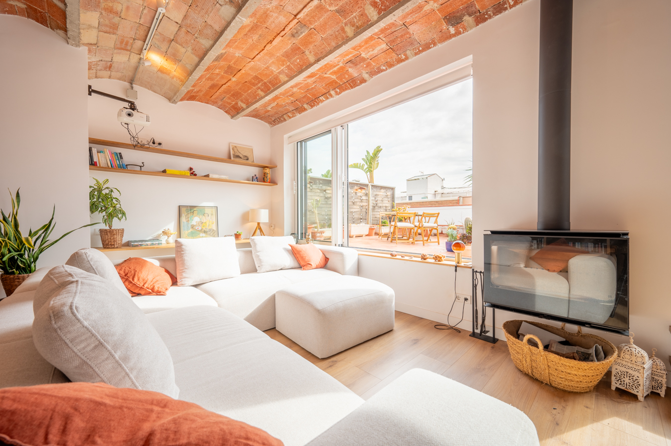 La entrada nos lleva directamente a la amplia zona de día, formada por un salón-comedor con cocina abierta e isla central. El ambiente es muy acogedor y lleno de vida con gran luminosidad, además del toque excelente de la volta catalana en los techos y una chimenea que aporta calidez y distinción. Desde el salón accedemos a la terraza, orientada hacia el mar. Es el lugar perfecto para celebrar animadas comidas y reuniones con familia y amigos, o simplemente descansar en el agradable clima de Barcelona.