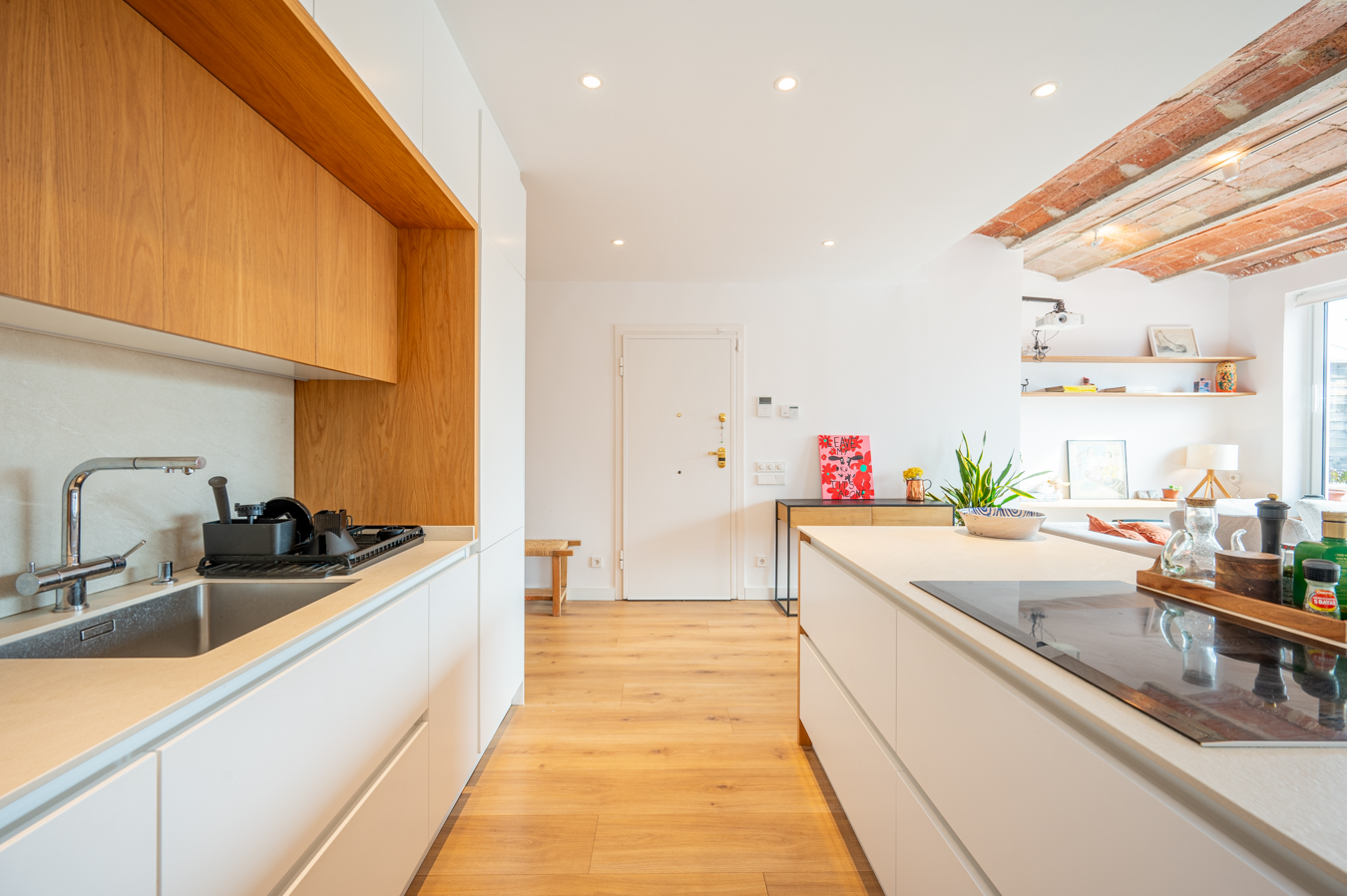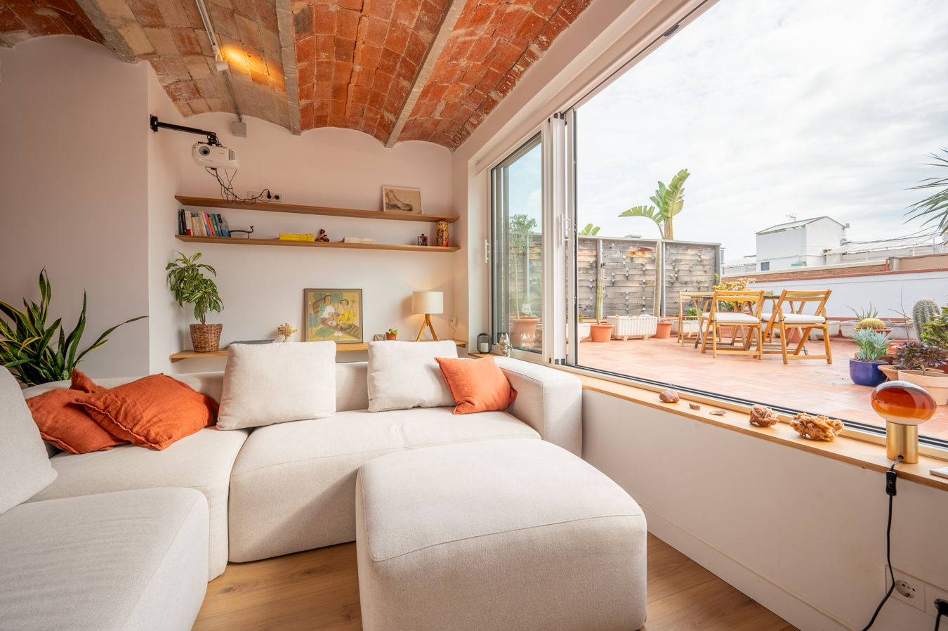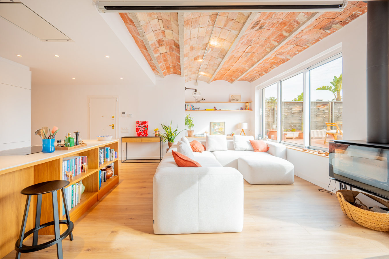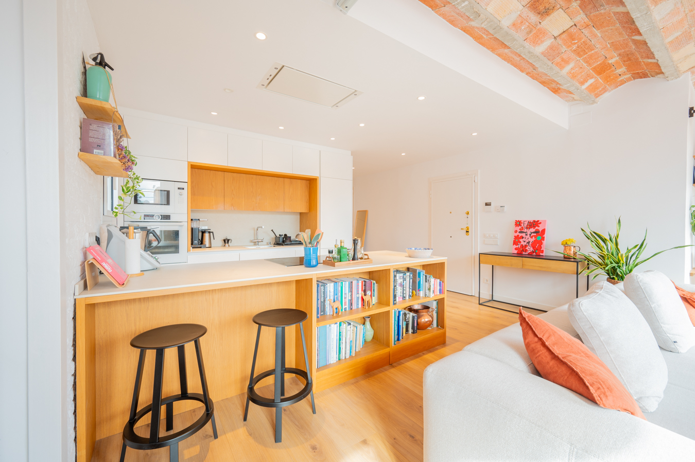 La entrada nos lleva directamente a la amplia zona de día, formada por un salón-comedor con cocina abierta e isla central. El ambiente es muy acogedor y lleno de vida con gran luminosidad, además del toque excelente de la volta catalana en los techos y una chimenea que aporta calidez y distinción. Desde el salón accedemos a la terraza, orientada hacia el mar. Es el lugar perfecto para celebrar animadas comidas y reuniones con familia y amigos, o simplemente descansar en el agradable clima de Barcelona.