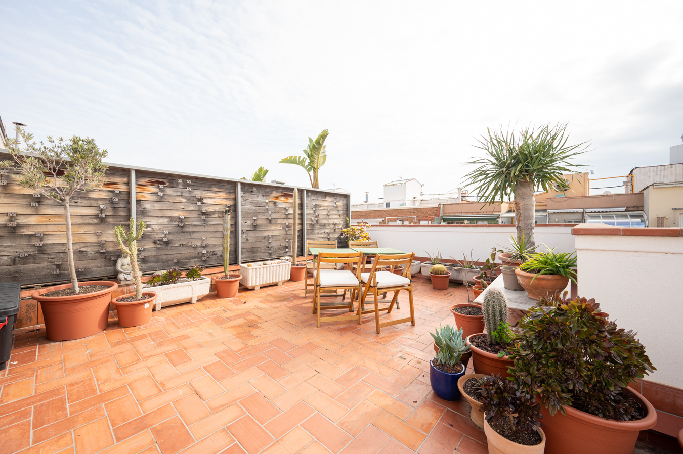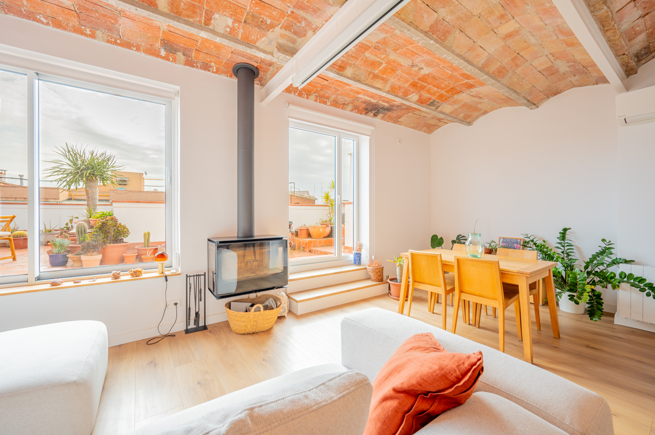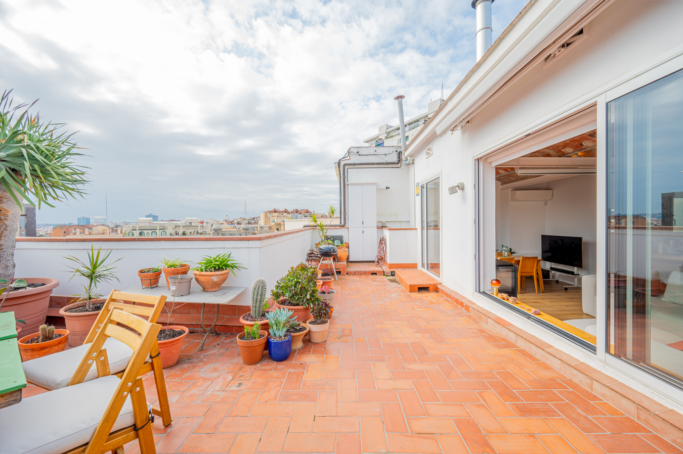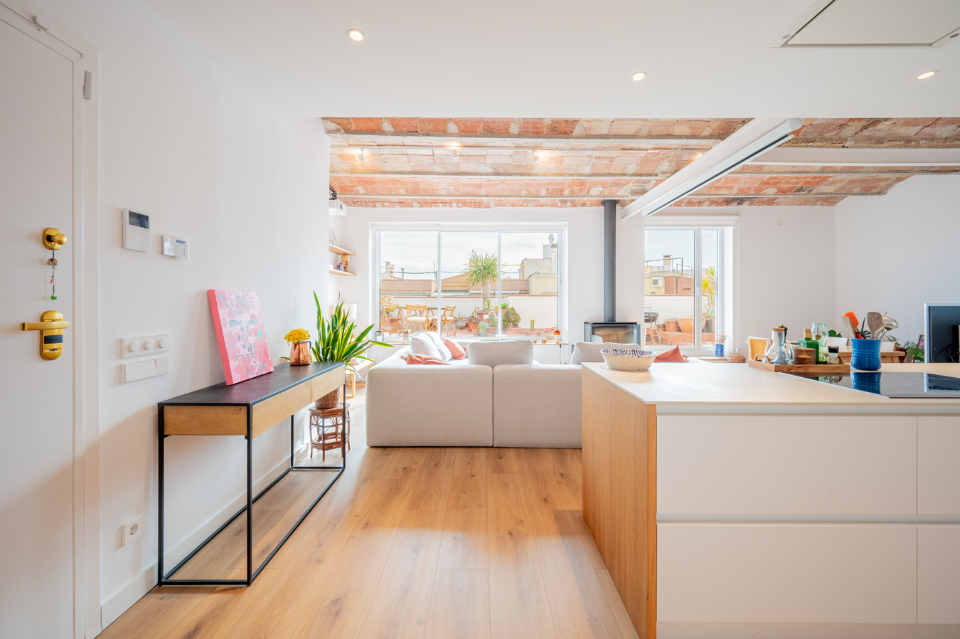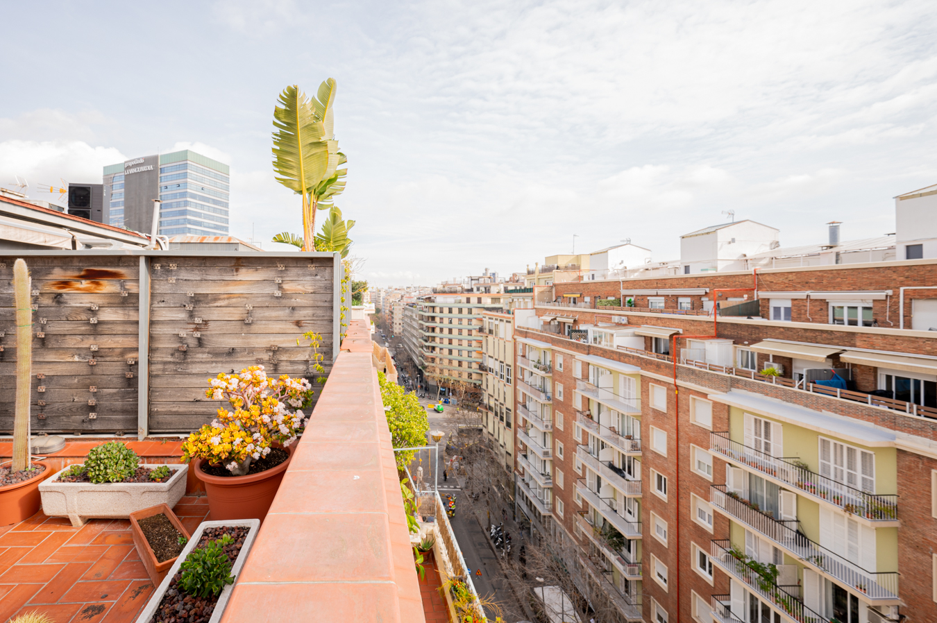 Este ático te permitirá tocar el cielo de Barcelona y disfrutar del sol y de fantásticas vistas desde su terraza. Con una ubicación privilegiada muy cerca de la Plaza Francesc Macià, esta vivienda te ofrece una experiencia de vida inigualable en la gran ciudad, con confort, intimidad, luminosidad y el encanto de la arquitectura tradicional representada en techos con volta catalana, vigas a la vista y paredes de ladrillo.
