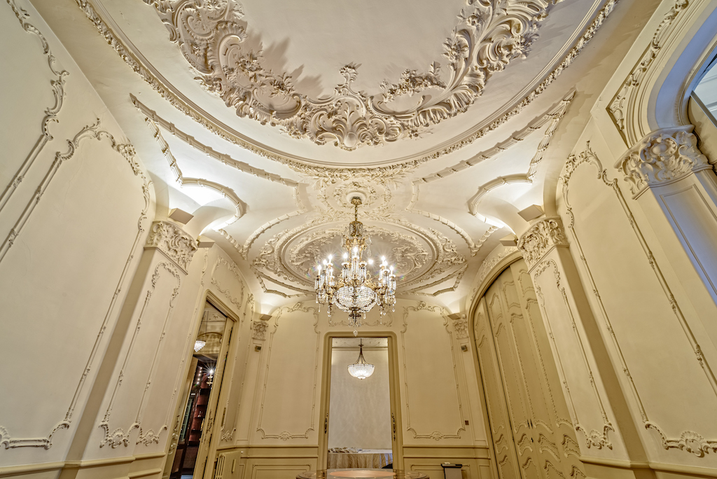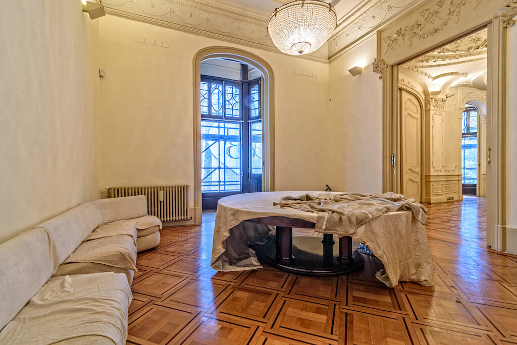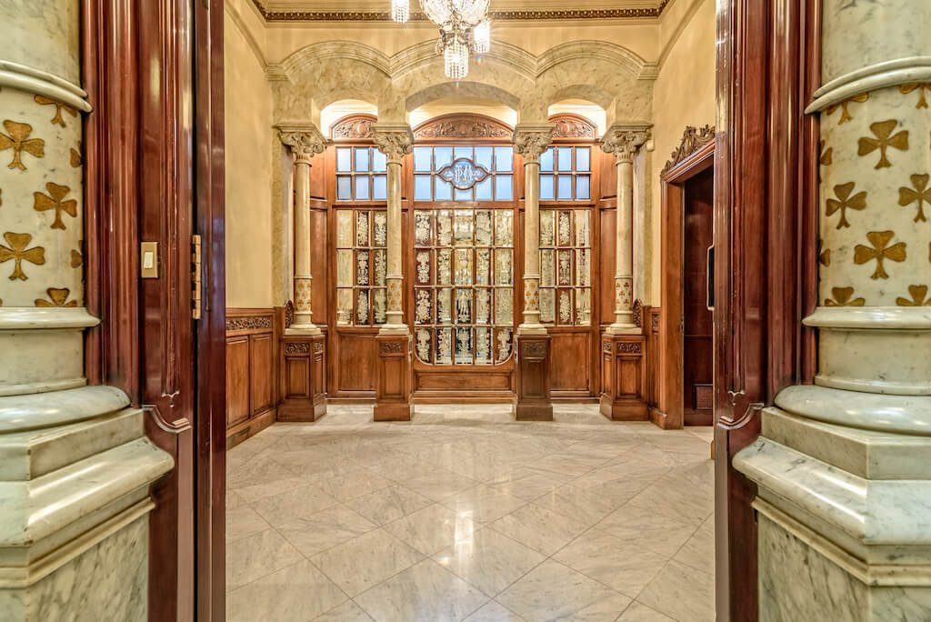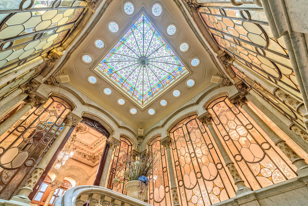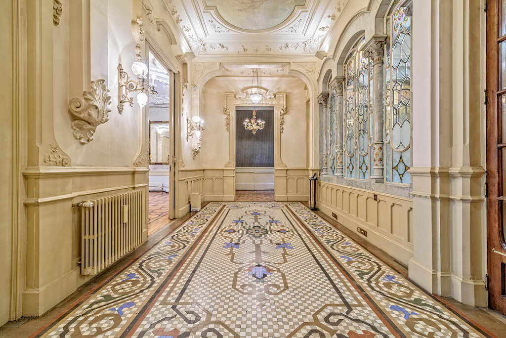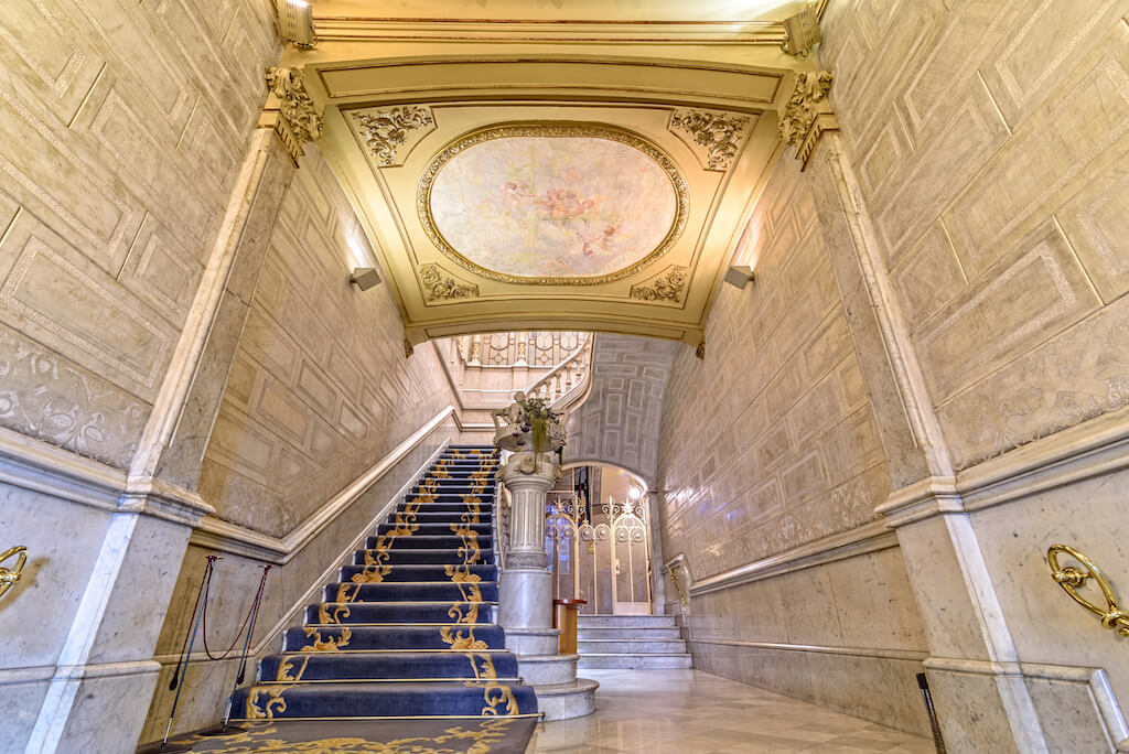 Su interior goza de lujosos elementos modernistas como mármol blanco, una impresionante escalera curva, magníficos frescos en sus techos, relieves florales y barandillas de hierro forjado, además de una maravillosa cúpula con vidriera de escandalosa belleza.