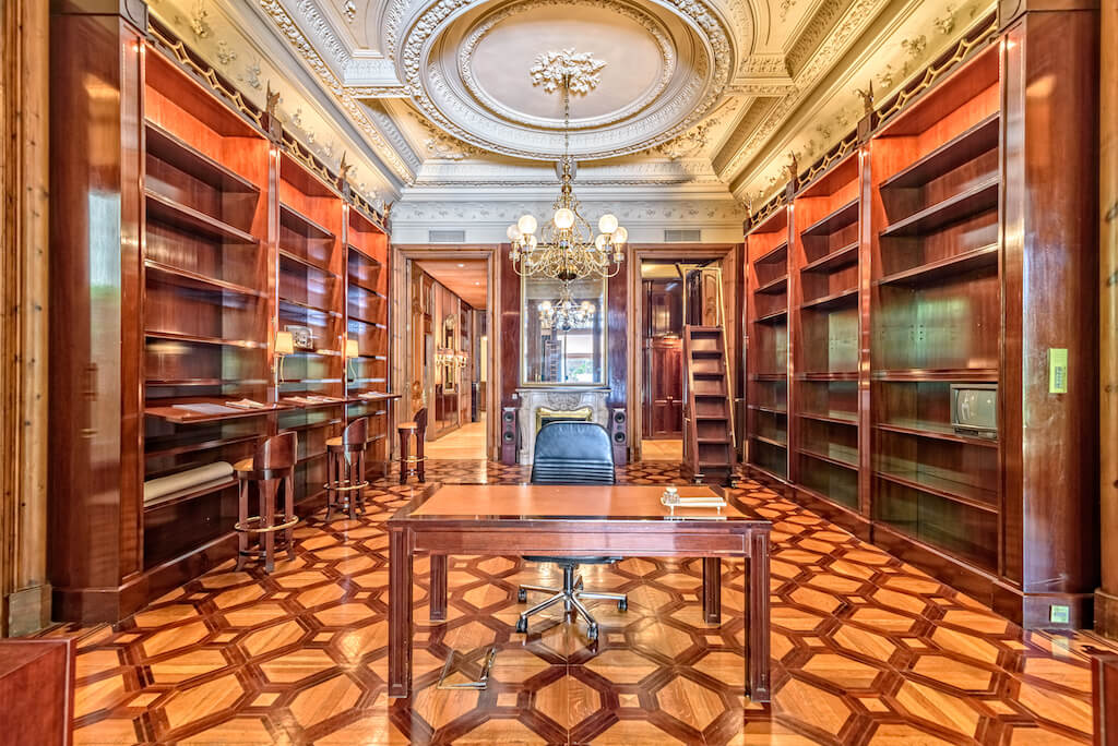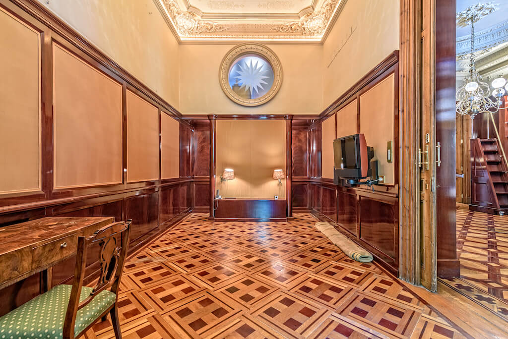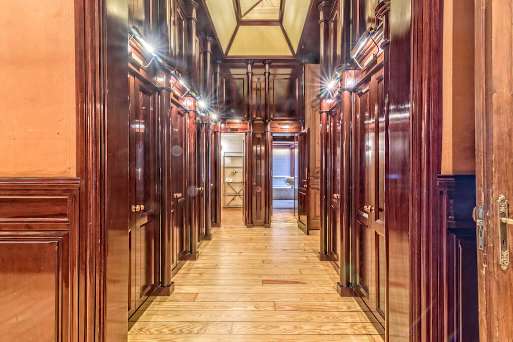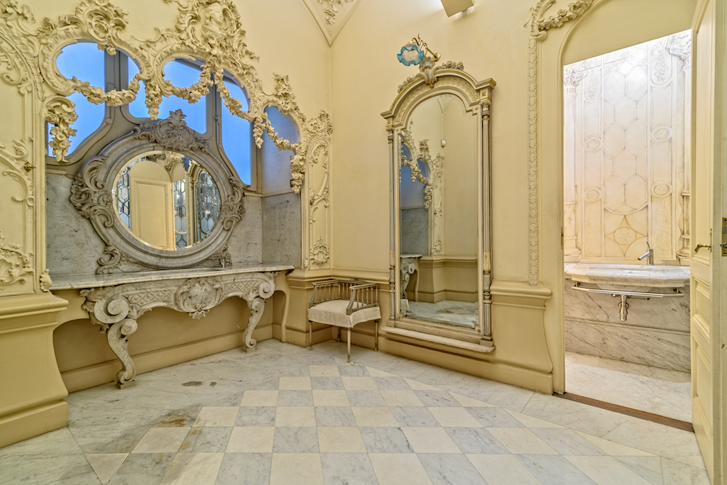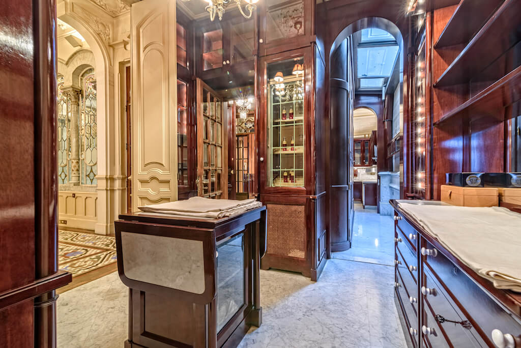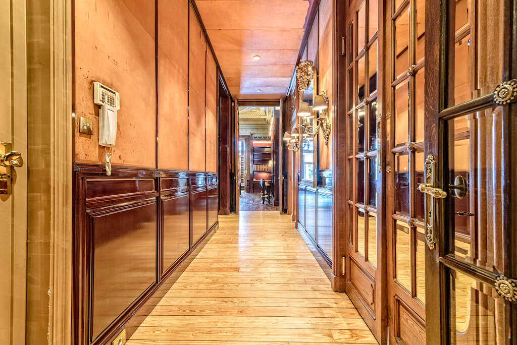 Su interior goza de lujosos elementos modernistas como mármol blanco, una impresionante escalera curva, magníficos frescos en sus techos, relieves florales y barandillas de hierro forjado, además de una maravillosa cúpula con vidriera de escandalosa belleza.