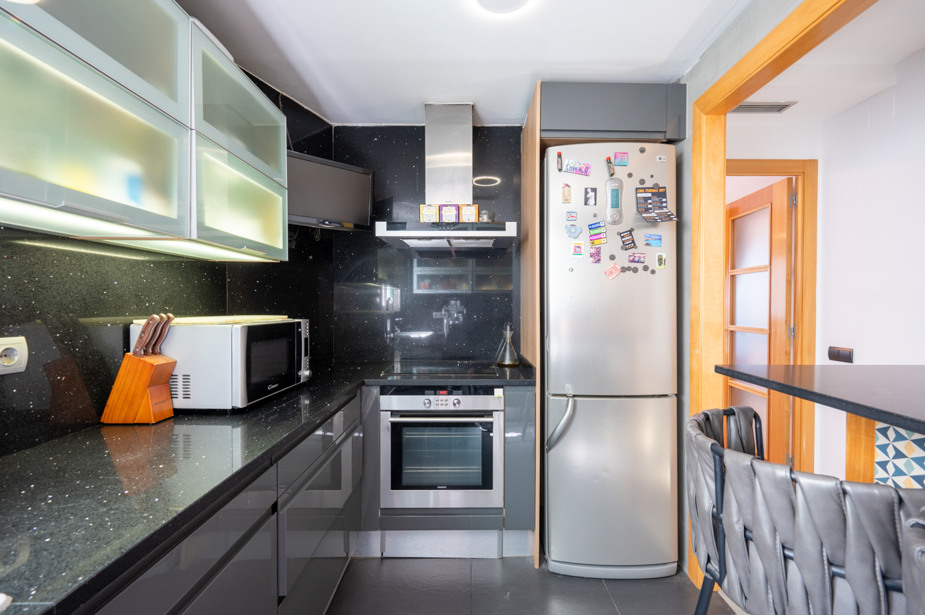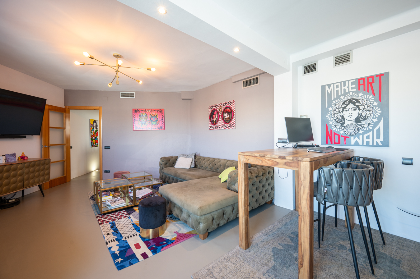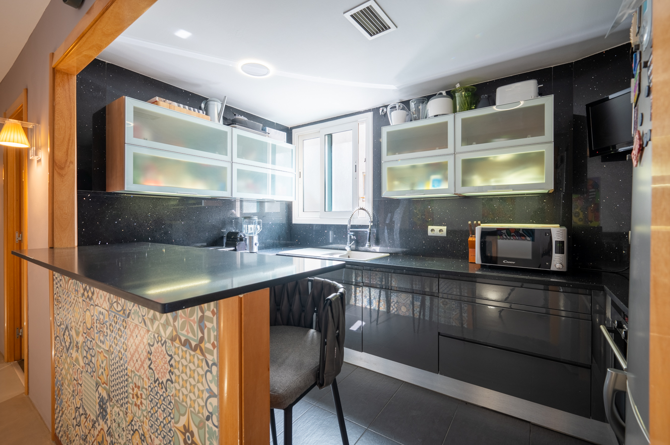 El ático, en la 9ª planta, se encuentra en perfecto estado gracias a su reforma de carácter moderno y está equipado con aire acondicionado frío/calor por conductos. Es posible comprar aparte los muebles de manera opcional.