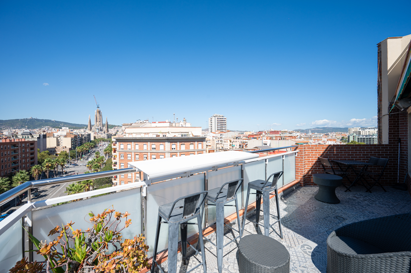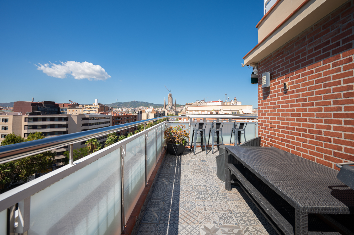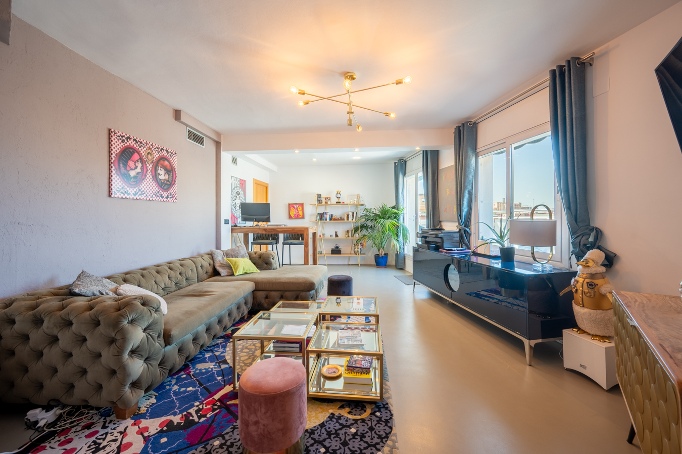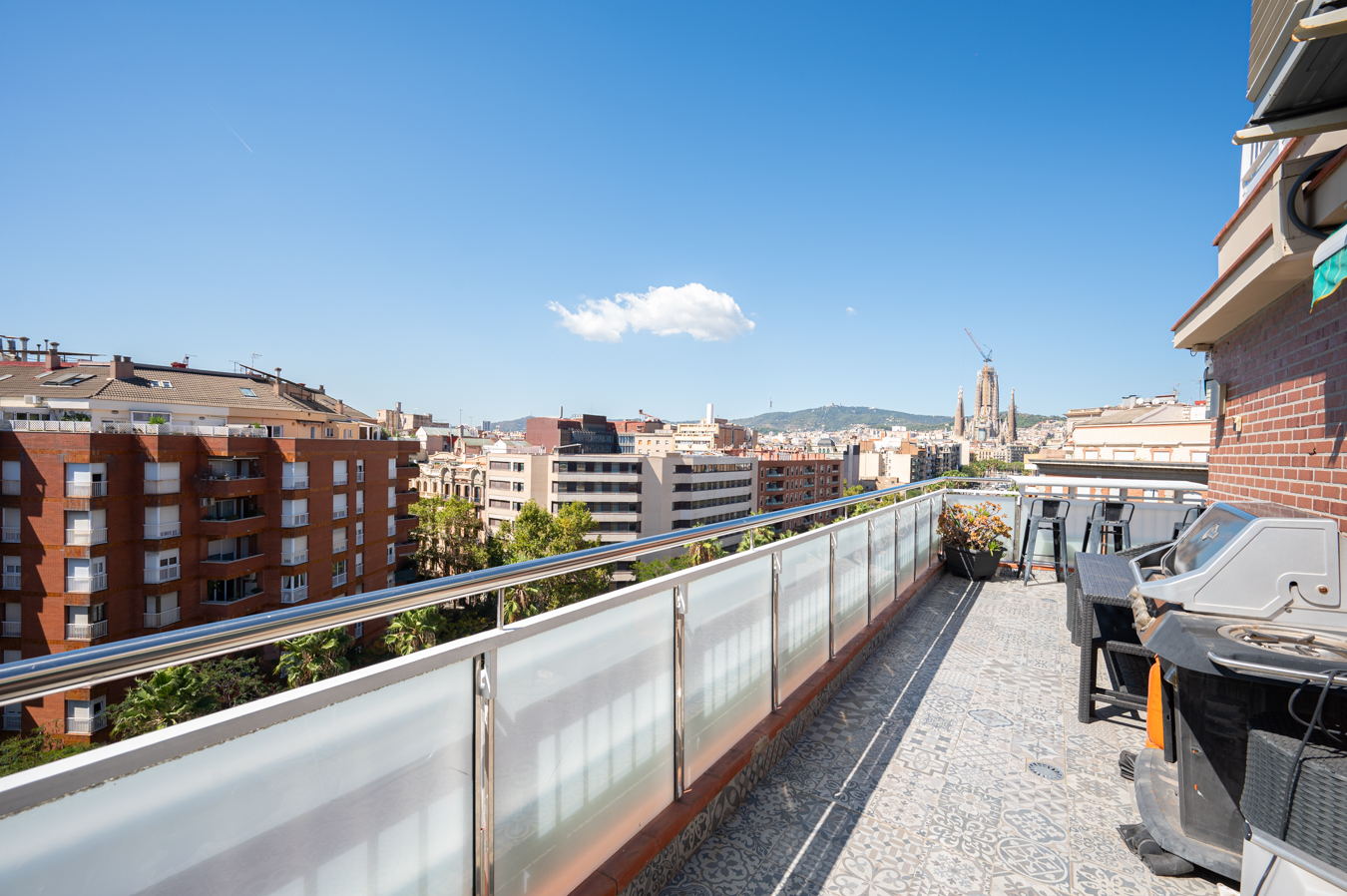 El ático dispone de un amplio recibidor y, a través de un pasillo, llegamos al salón-comedor. Es una estancia amplia, luminosa y tranquila con acceso a una sensacional terraza, un lugar ideal para disfrutar de reuniones al aire libre con vistas a la Sagrada Familia, la ciudad y la montaña. Su orientación sur es ideal para disfrutar de luz natural casi todo el día. La cocina queda abierta al pasillo.