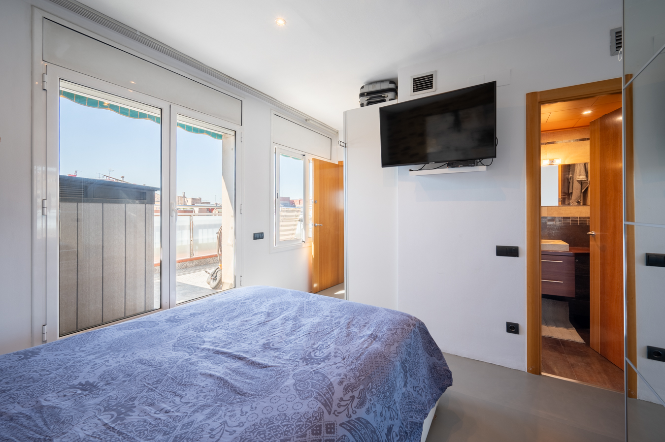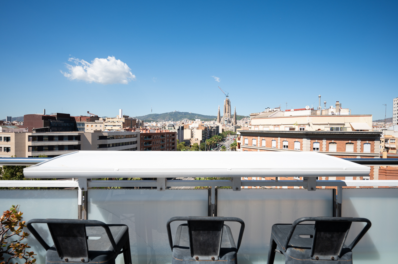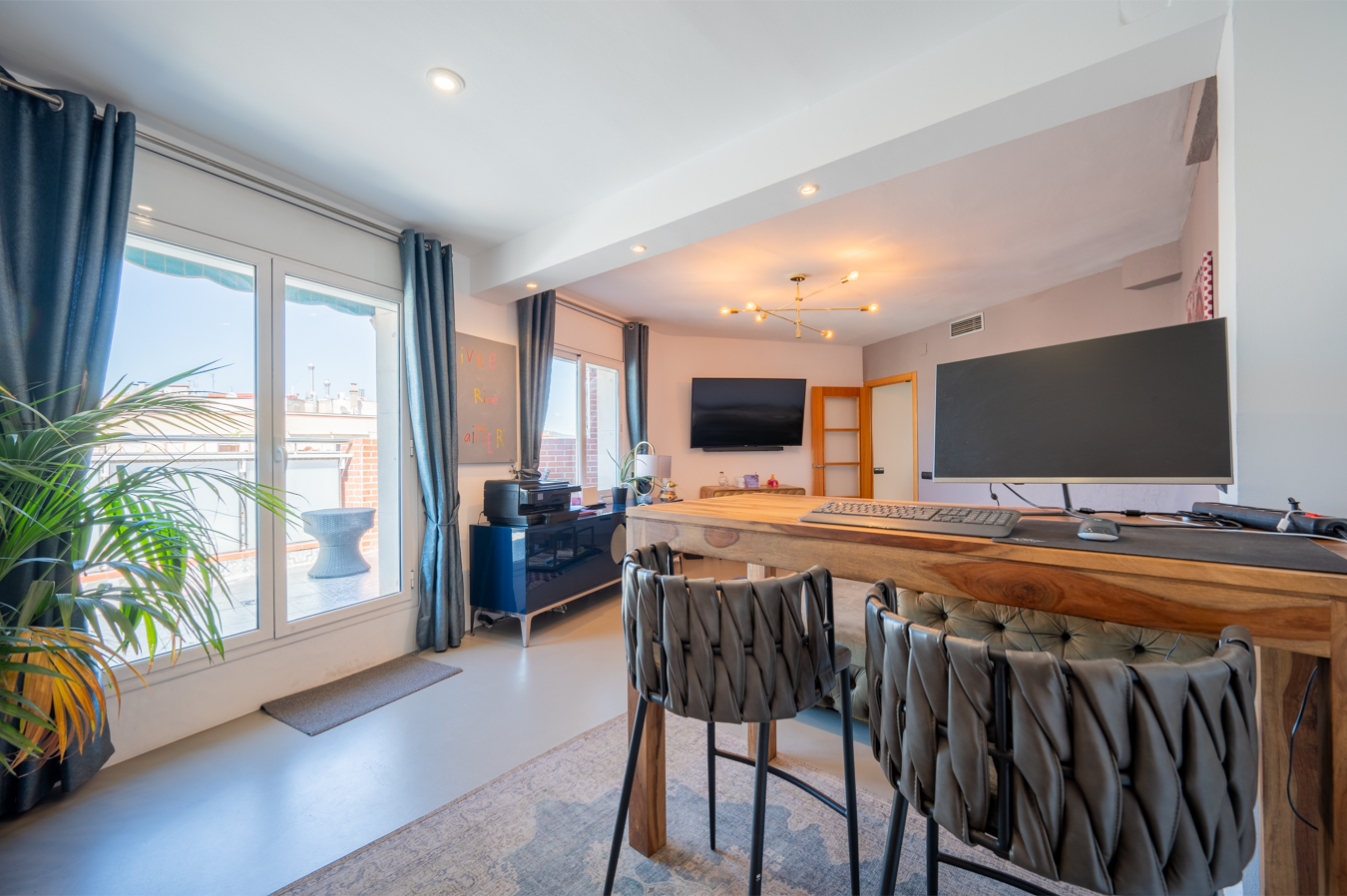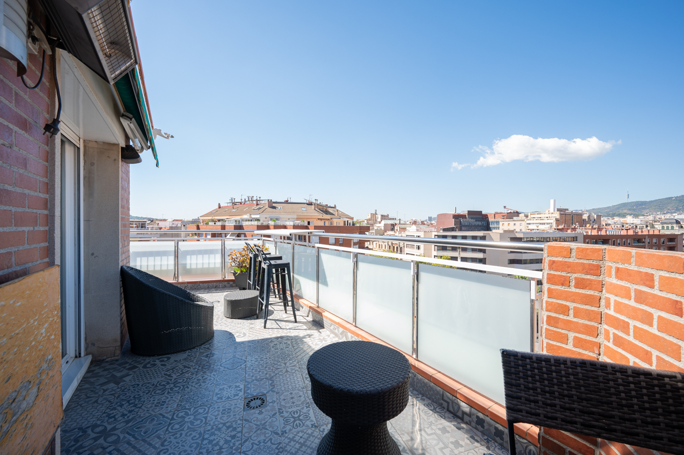 El ático dispone de un amplio recibidor y, a través de un pasillo, llegamos al salón-comedor. Es una estancia amplia, luminosa y tranquila con acceso a una sensacional terraza, un lugar ideal para disfrutar de reuniones al aire libre con vistas a la Sagrada Familia, la ciudad y la montaña. Su orientación sur es ideal para disfrutar de luz natural casi todo el día. La cocina queda abierta al pasillo.