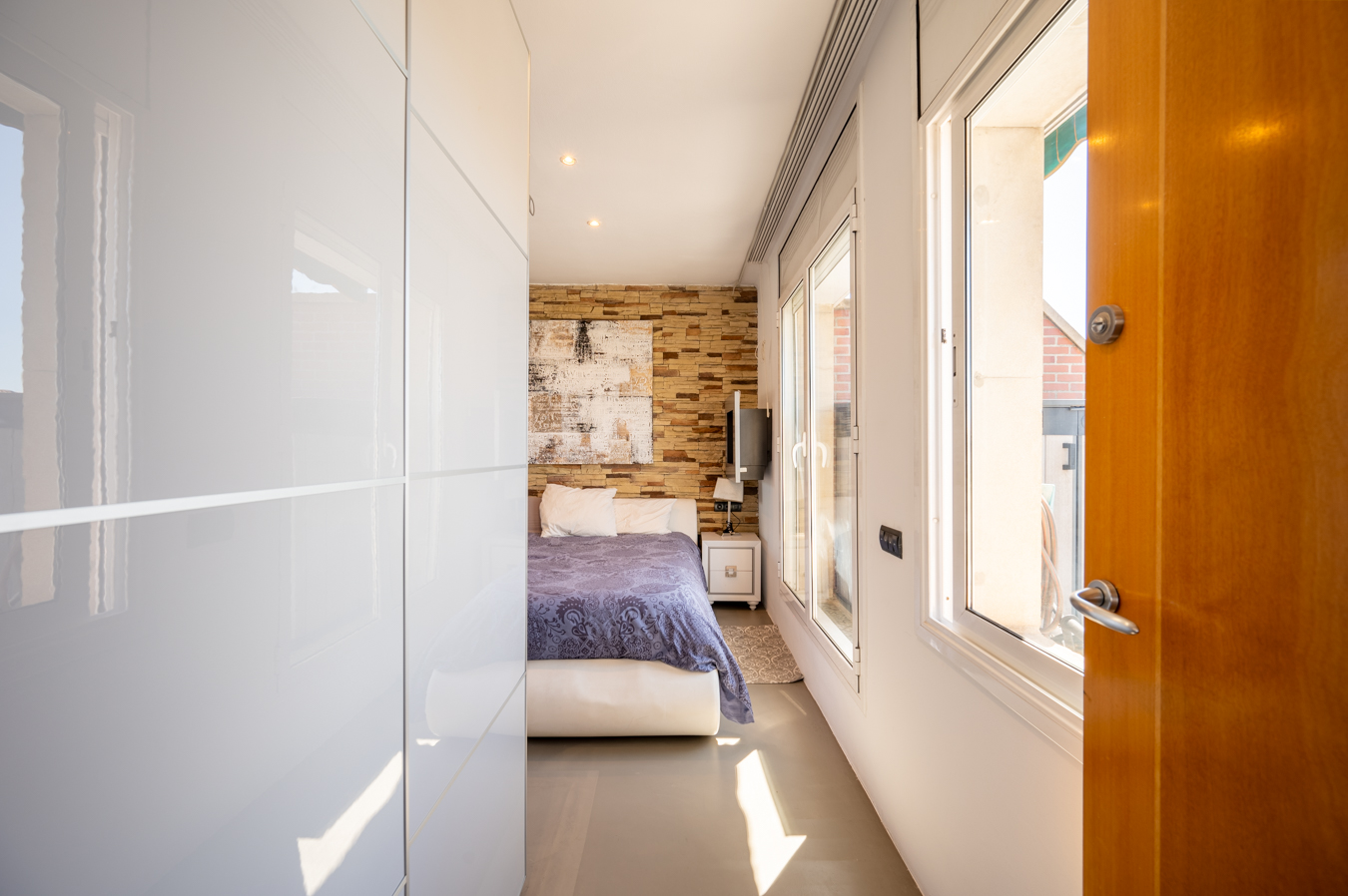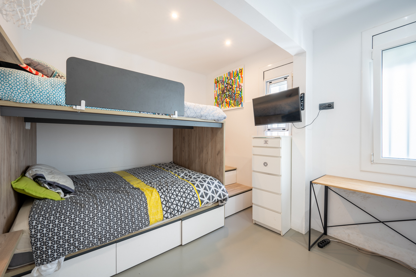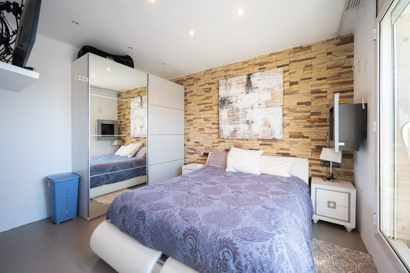 En cuanto a los dormitorios, hay una habitación en suite al lado del salón, con cuarto de baño propio y acceso a la terraza; un gran dormitorio doble con armario empotrado al lado del recibidor y un cuarto de baño completo que le da servicio. También hay un lavadero y un trastero. Cabe destacar que sería posible convertir la segunda habitación en 2 habitaciones individuales.