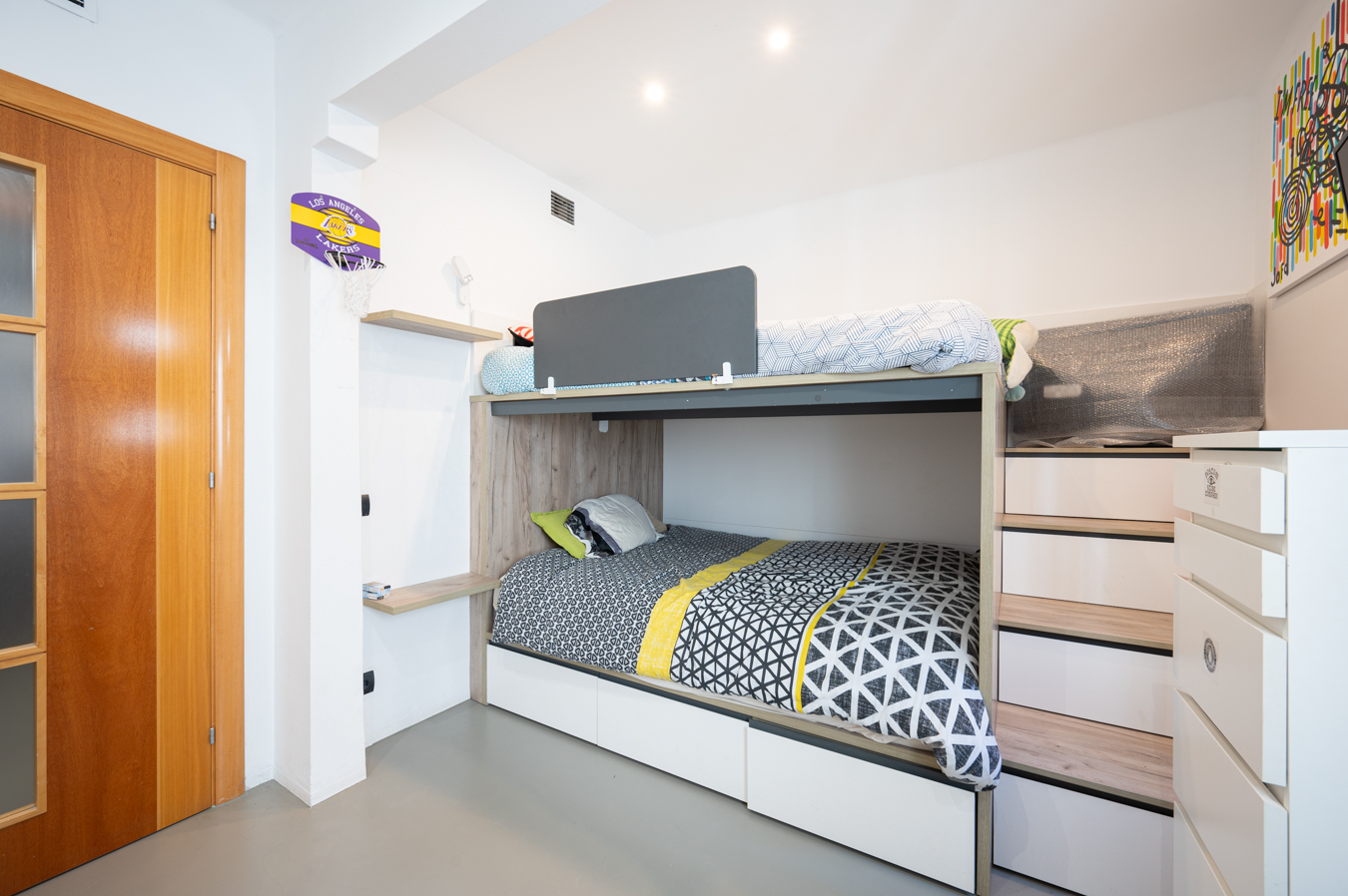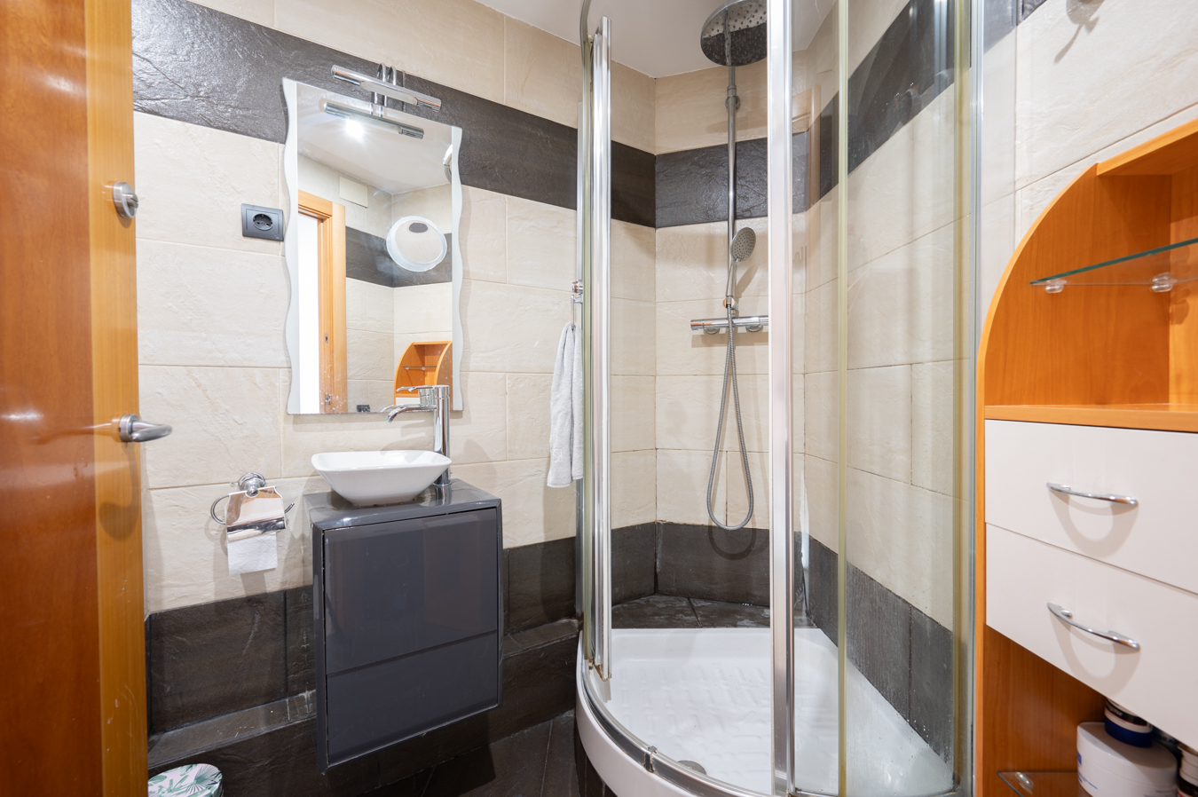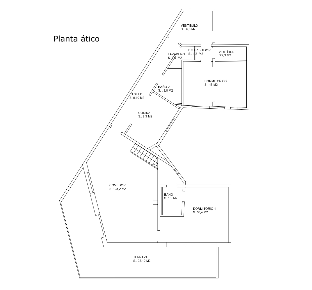 En cuanto a los dormitorios, hay una habitación en suite al lado del salón, con cuarto de baño propio y acceso a la terraza; un gran dormitorio doble con armario empotrado al lado del recibidor y un cuarto de baño completo que le da servicio. También hay un lavadero y un trastero. Cabe destacar que sería posible convertir la segunda habitación en 2 habitaciones individuales.