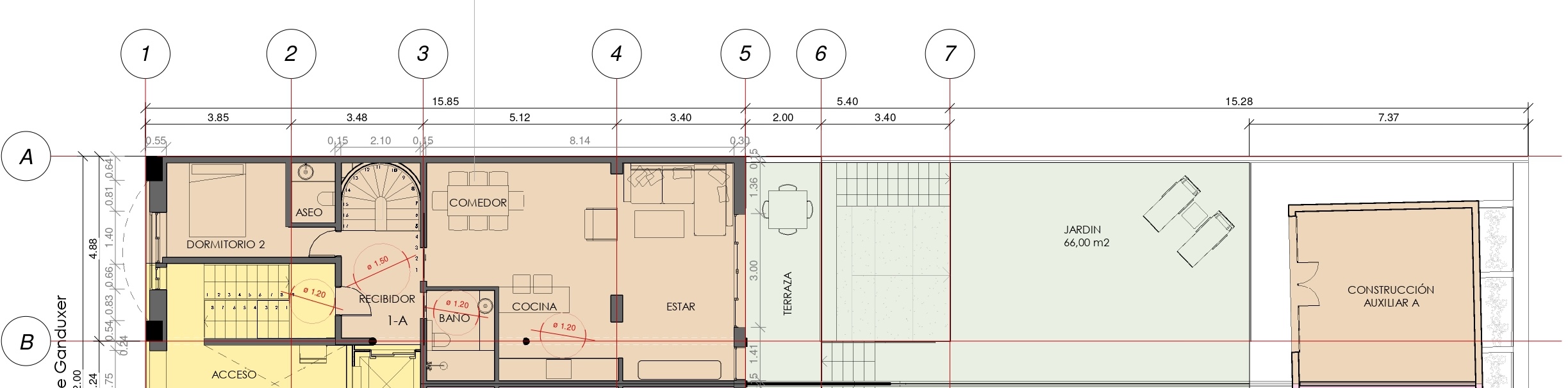 La propiedad tiene 194 m2 construidos interiores y una terraza de 66 m2. La planta principal (100,84 m2) dispone de un amplio salón-comedor con cocina abierta. Desde aquí accedemos al fabuloso jardín, un espacio ideal en el que disfrutar al aire libre en plena ciudad de momentos compartidos con familia y amigos, agradables comidas o simplemente descansar. Volviendo al interior, encontramos un dormitorio doble, un cuarto de baño completo y un aseo de cortesía.