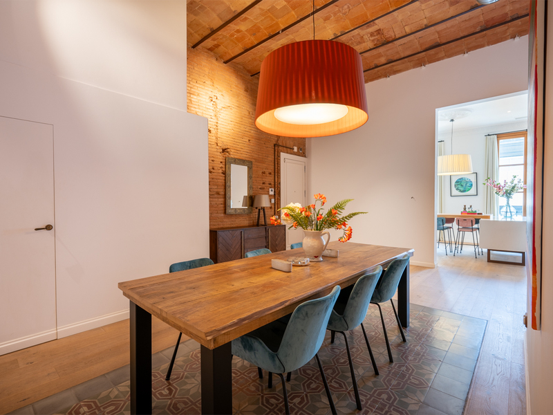 Este fabuloso piso se sitúa en una zona excelente de la Dreta del Eixample, muy cerca del Paseo Sant Joan, la Avenida Diagonal y la Sagrada Familia. Ha sido totalmente reformado con un diseño exclusivo y acabados de alta calidad. Se entrega totalmente amueblado y equipado, listo para disfrutar desde el primer día. La vivienda está en la primera planta de una finca regia muy cuidada con ascensor, muy tranquila con solo 10 vecinos. El salón es luminoso y acogedor, con orientación sureste hacia la calle y un balcón. A su lado se sitúa la cocina semiabierta con isla central, que queda elegantemente separada mediante un porticón de hierro de diseño. Está equipada con electrodomésticos integrados que quedan totalmente ocultos. La zona de noche tiene 2 habitaciones dobles con armarios empotrados. El dormitorio principal es en suite con cuarto de baño privado y tiene acceso a una pequeña terraza que da a un tranquilo patio de manzana, con orientación noroeste. El segundo dormitorio es interior y a su lado hay un cuarto de baño independiente. El piso mantiene algunos elementos originales que han sido restaurados, como los suelos hidráulicos en la cocina y las molduras y rosetones en el techo. Está equipado con suelos de parquet en espiga, aire acondicionado por splits y calefacción por radiadores de gas natural. Los alrededores te ofrecen todos los comercios y servicios que necesitas para el día a día, una amplia oferta de bares y restaurantes en el Paseo Sant Joan, boutiques en la Avenida Diagonal y una excelente conexión mediante transporte público con paradas de metro, autobús y tranvía. Vivir aquí significa disfrutar de una de las zonas más cotizadas de Barcelona con todas las posibilidades de la ciudad a tu alcance. No dudes en contactar con Bcn Advisors para visitar esta vivienda.